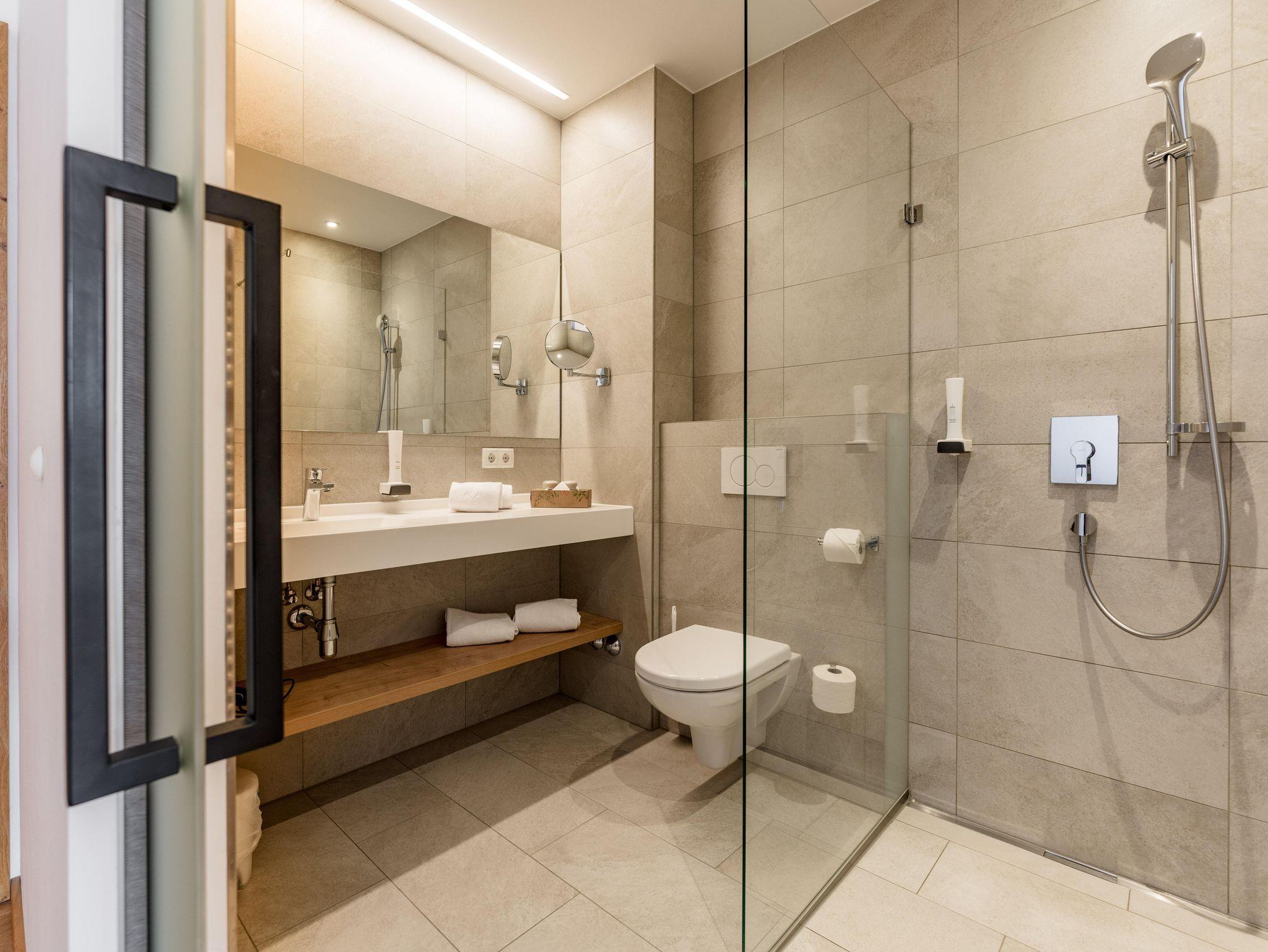 Unsere Doppelzimmer überzeugen mit ihrem zeitlosen Design – und der Balkon lädt ein, die frische Bergluft in vollen Zügen zu genießen.