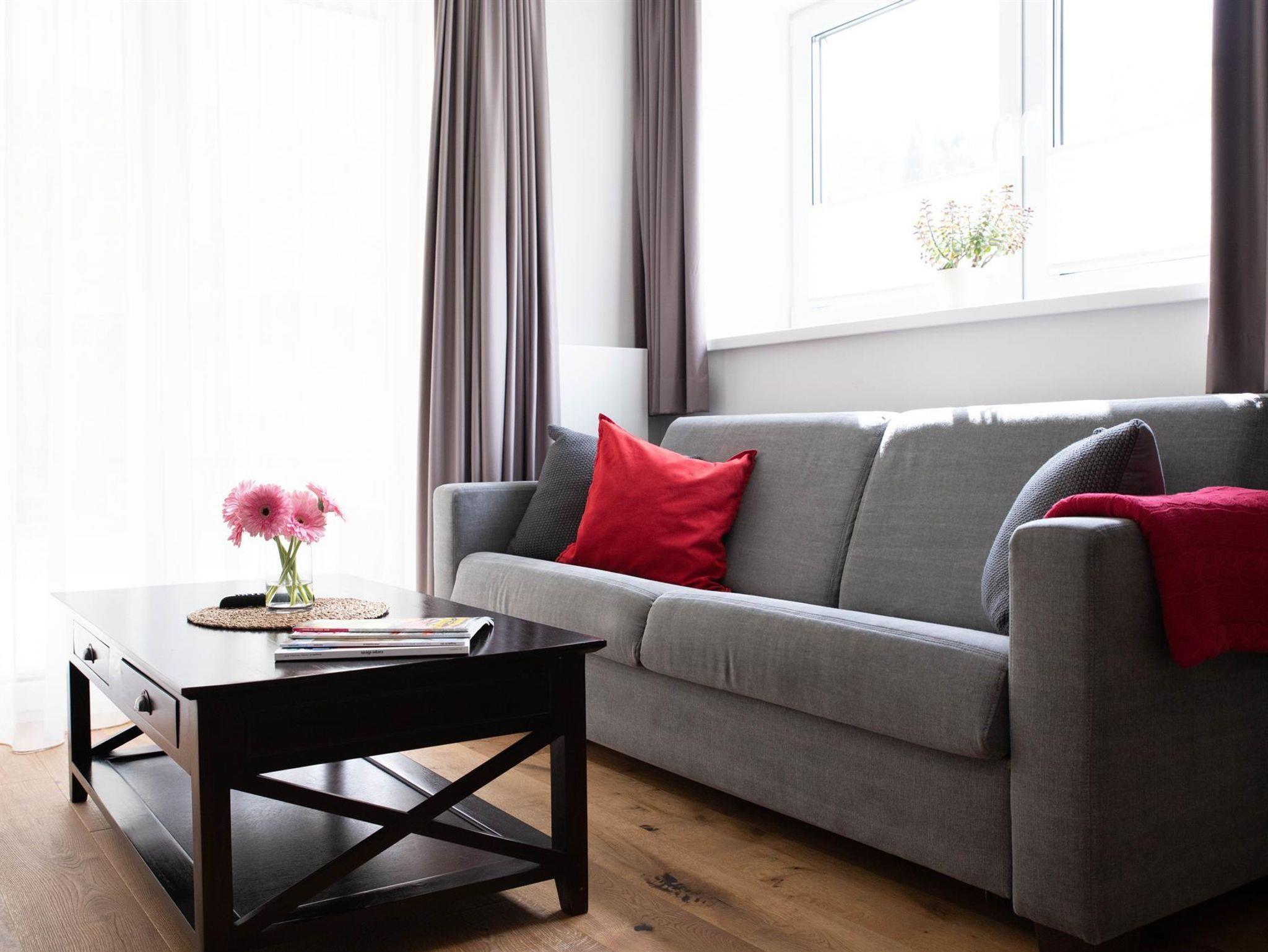 Das Sofa im Wohnzimmer ist ausziehbar und bietet hohen Schlafkomfort.