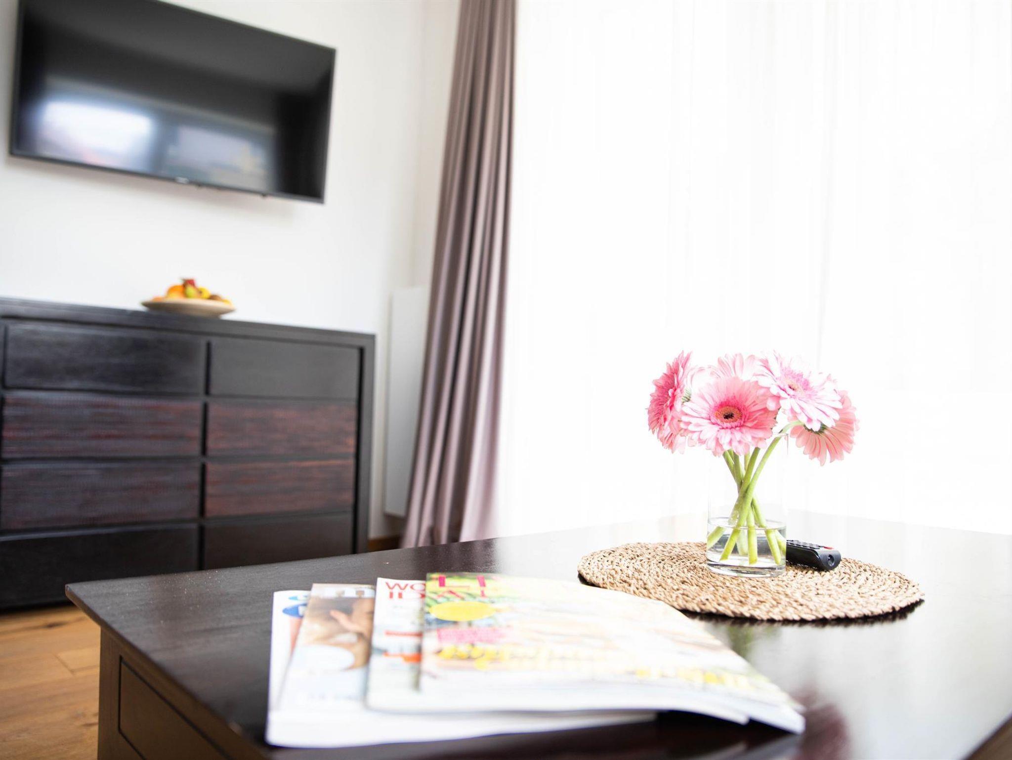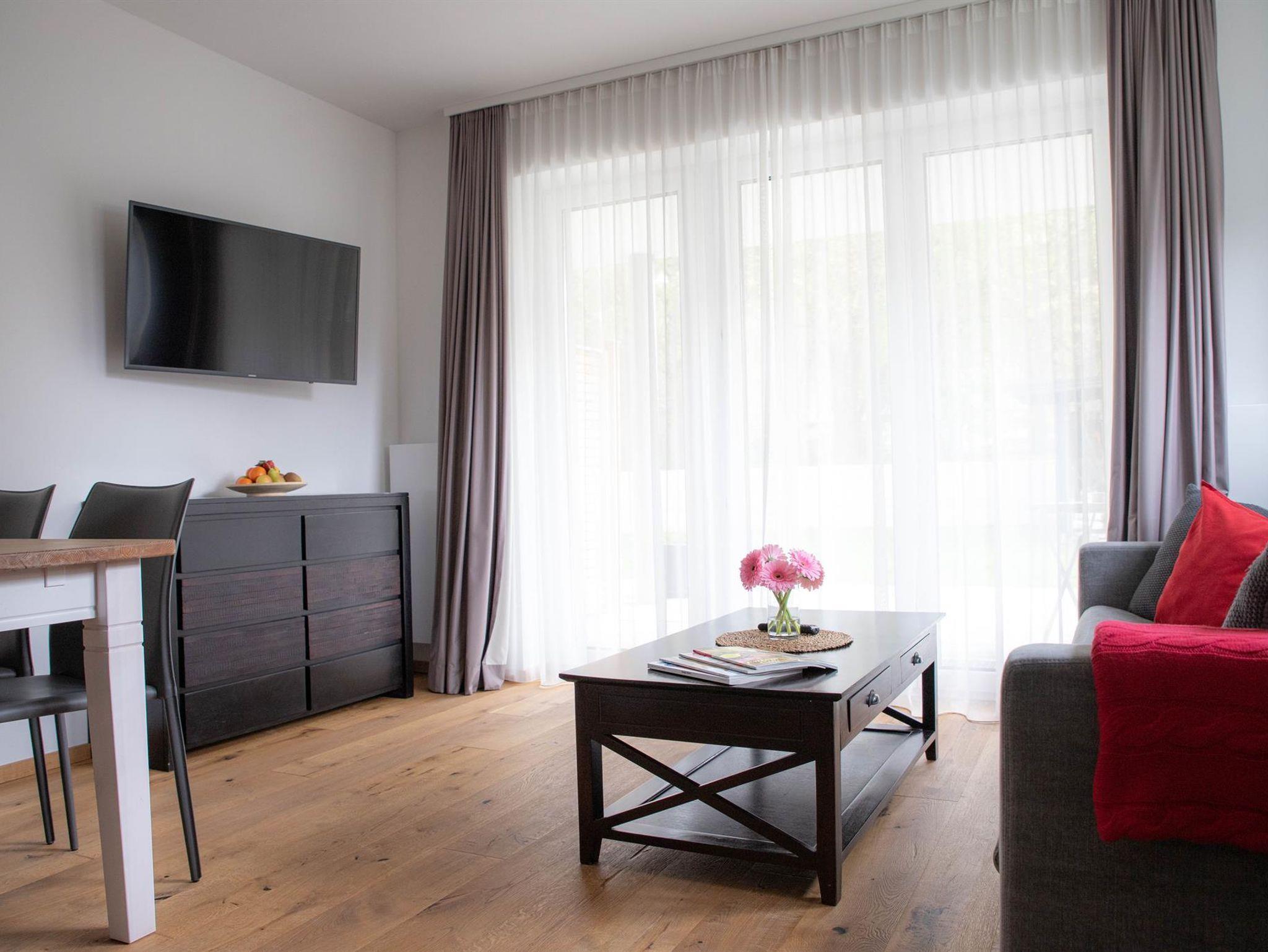 Zeitgemäßes Design, helle Farben, ein Holzboden und eine moderne Ausstattung mit allem was das Herz begehrt machen die Appartements Freiraum zum gemütlichen Refugium mit eigener Terrasse.