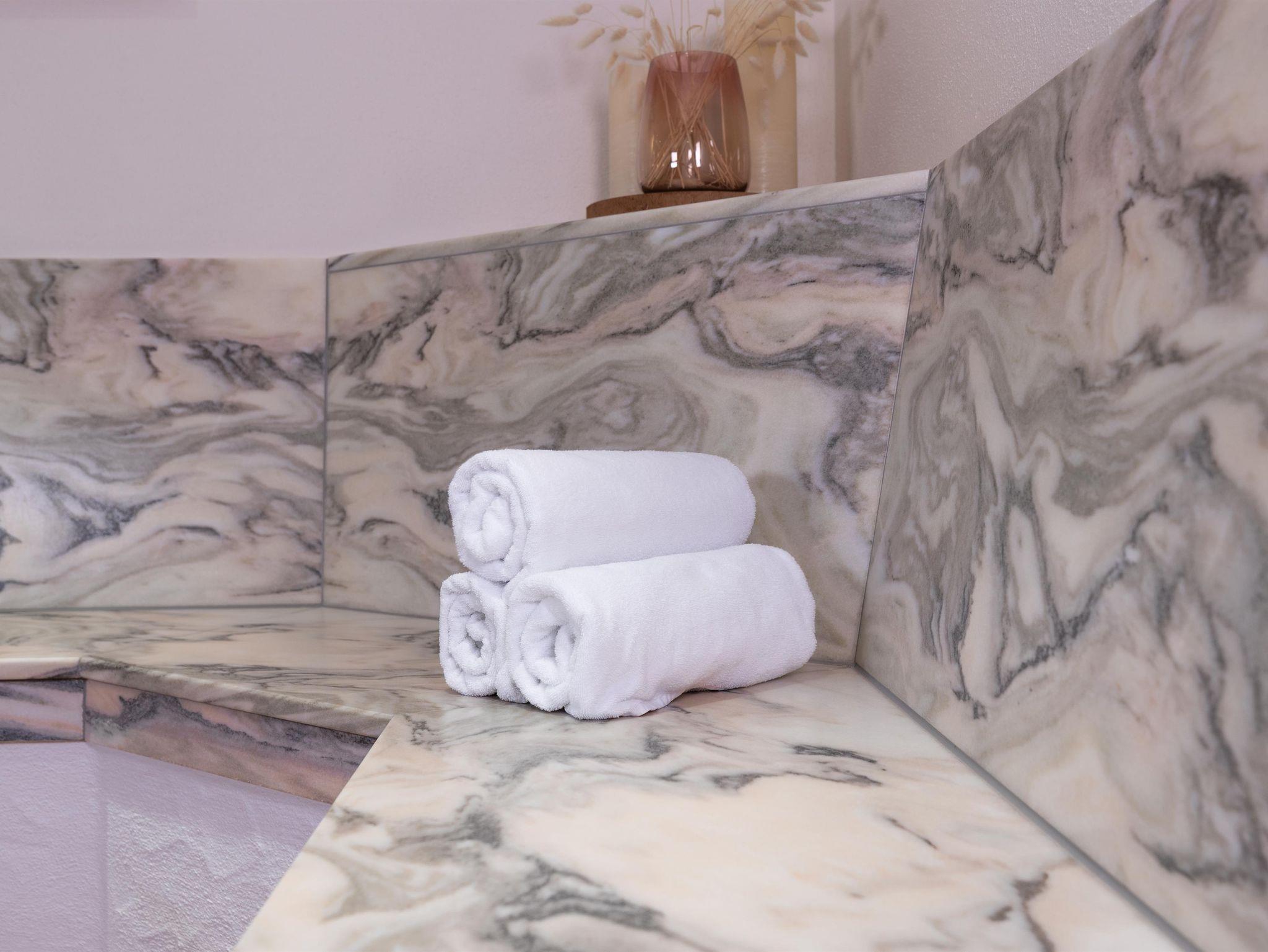 Die Bäder wurden mit Fliesen in Holzoptik und Marmor aus der Region gestaltet und das Sofa aus typischen Schladminger Loden verleiht dem Zimmer eine gemütliche Atmosphäre.