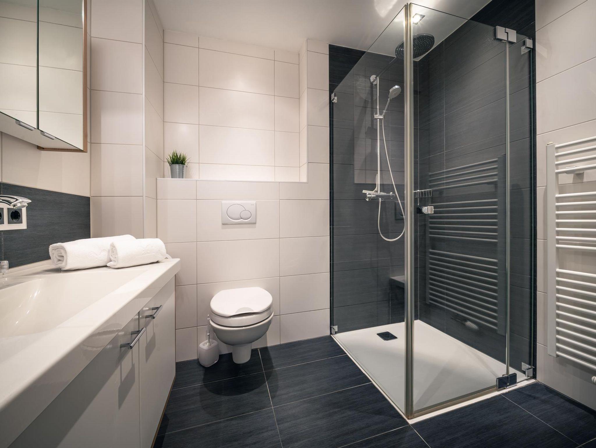 - 1 Badezimmer mit Dusche, Waschtisch, Fön, Radio und WC