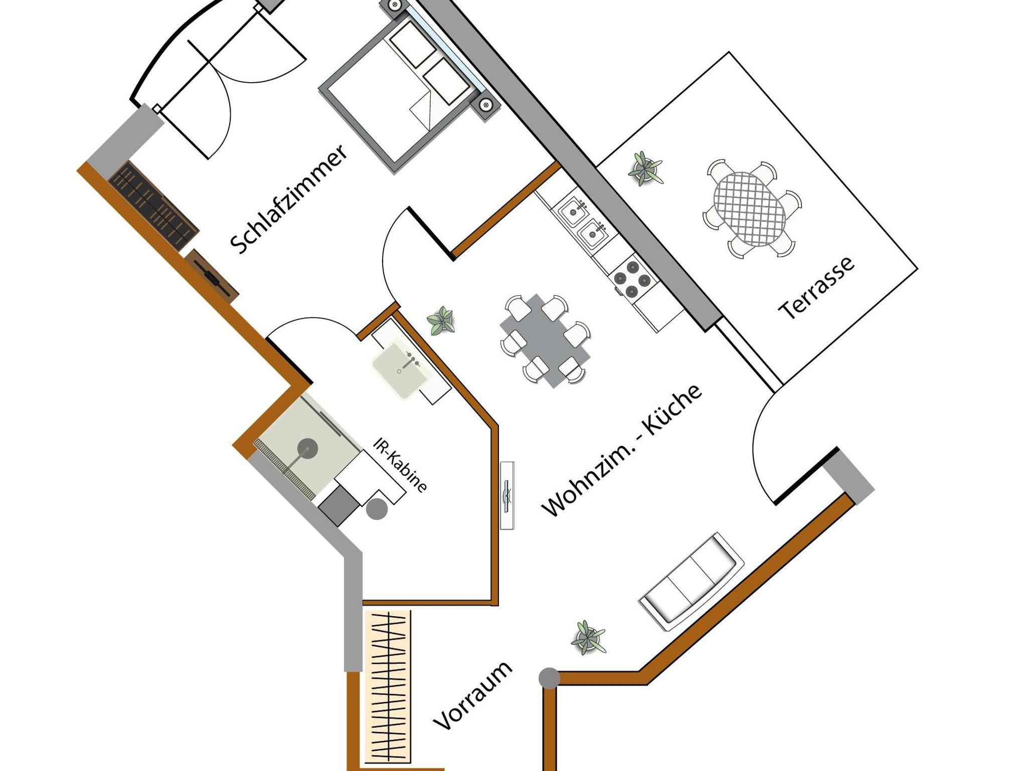 Unsere Ferienwohnung besteht aus, 1 Schlafraum mit 2 Betten, welche sowohl als Doppelbett, wie auch als 2 Einzelbetten verwendet werden können. Im Wohnraum befindet sich ein ausziehbares Sofa (Größe 170 x 200 cm). Wohnraum wie auch Schlafraum sind mit einem Flat TV ausgestattet. Die Wohnung verfügt weiters über eine Infrarotkabine, eine Kochgelegenheit, 1 Badezimmer sowie WC und eine eigene Terrasse.