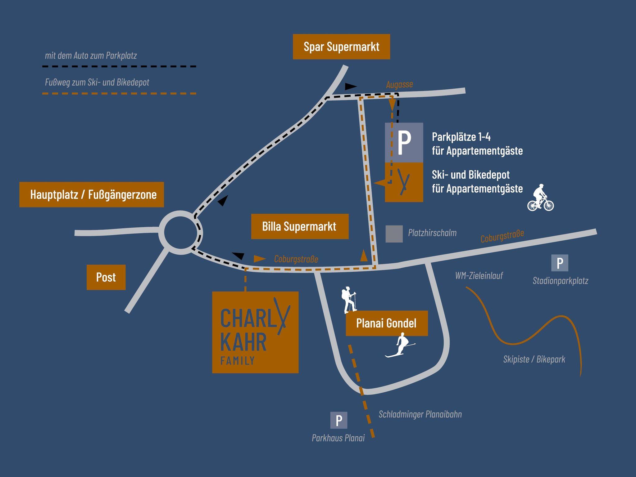 Wohnen wie eine Legende – im Herzen von Schladming. Die vier Appartements der Charly Kahr Family tragen den Spirit der österreichischen Skilegende Charly Kahr in sich. Gastgeberin Daniela heißt Sie direkt gegenüber der Gondelstation Planet Planai willkommen – in bester Lage für Winter wie Sommer. Ob 230 Pistenkilometer auf der Schladminger 4-Berge-SkiSchaukel oder Wander- und Bike-Abenteuer: Die Bergbahn nur 50?m entfernt bringt Sie direkt ins Gipfelerlebnis (inkl. Schladming-Dachstein-Sommercard).
