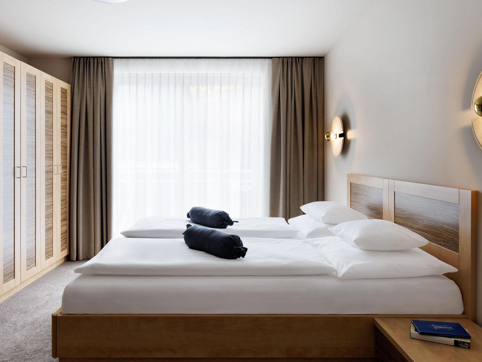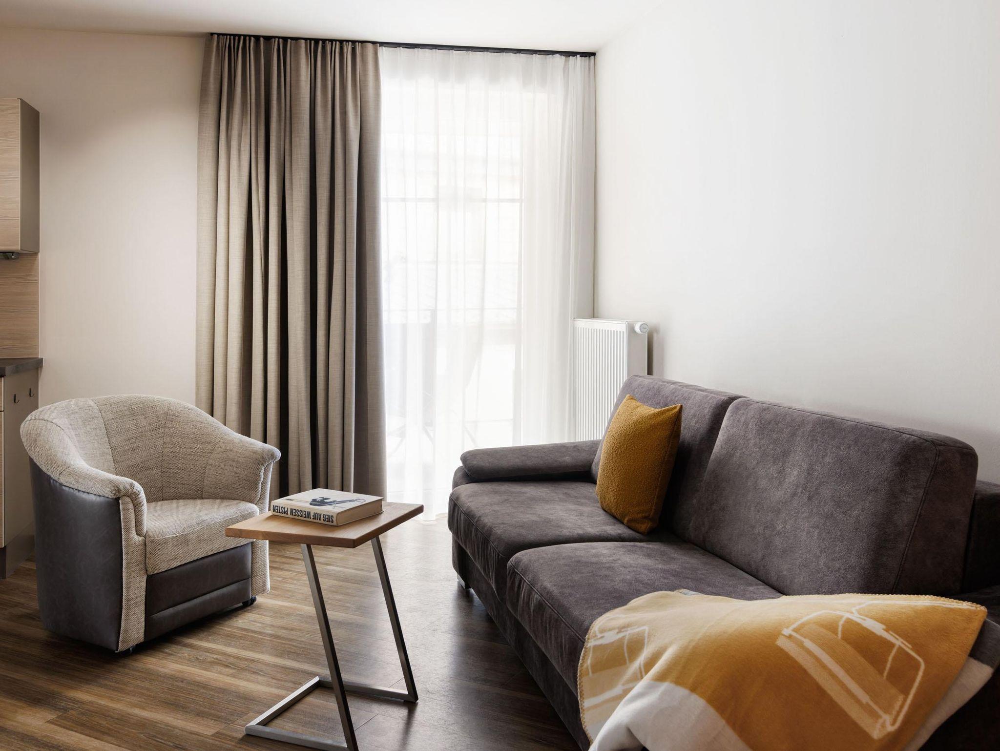 Die Appartements für zwei bis sechs Personen bieten 55 bis 100?m² Wohnfläche mit ein bis zwei Schlafzimmern, geräumigem Wohnbereich mit Schlafsofa (Matratzenfunktion, Größe 170x200), Bad (stets separates WC), WLAN, teils Balkon oder Terrasse und vollausgestatteter Küche. Jede Einheit verfügt außerdem über eine moderne Infrarotkabine. Unser Haus bietet zudem einen Lift.