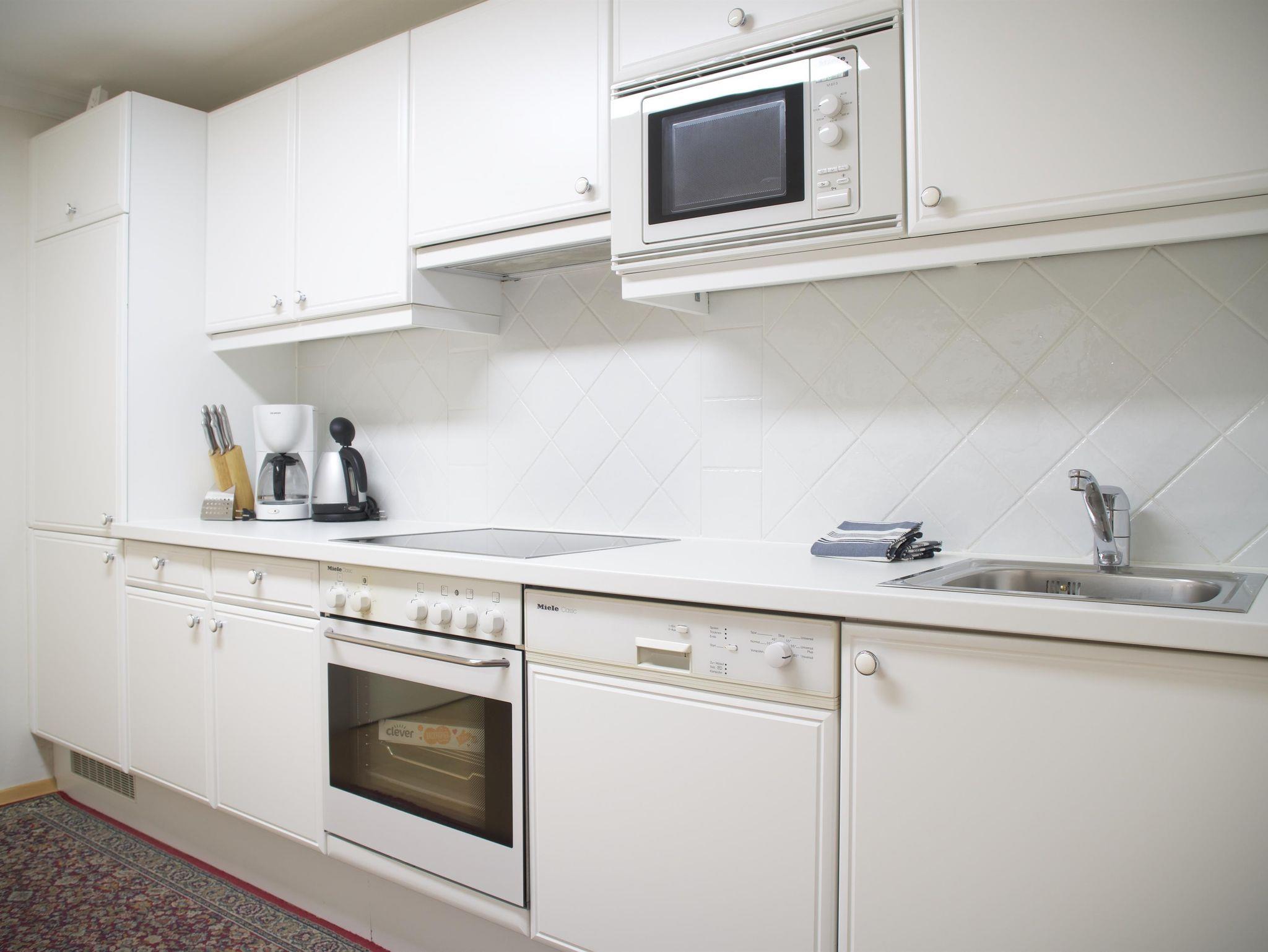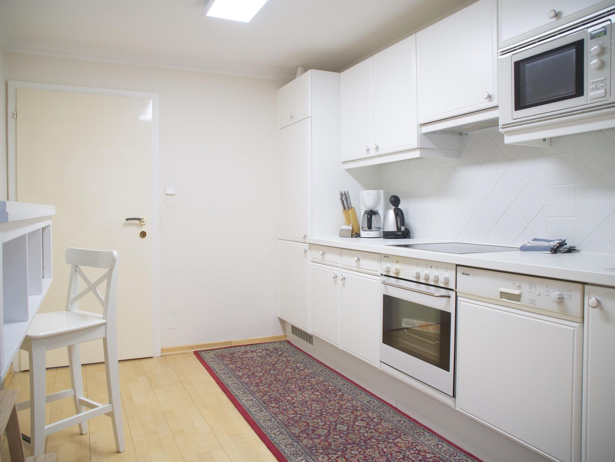 Voll ausgestatte Küche mit Geschirrspüler, Herd, Backrohr, Mikrowelle und Kühlschrank.