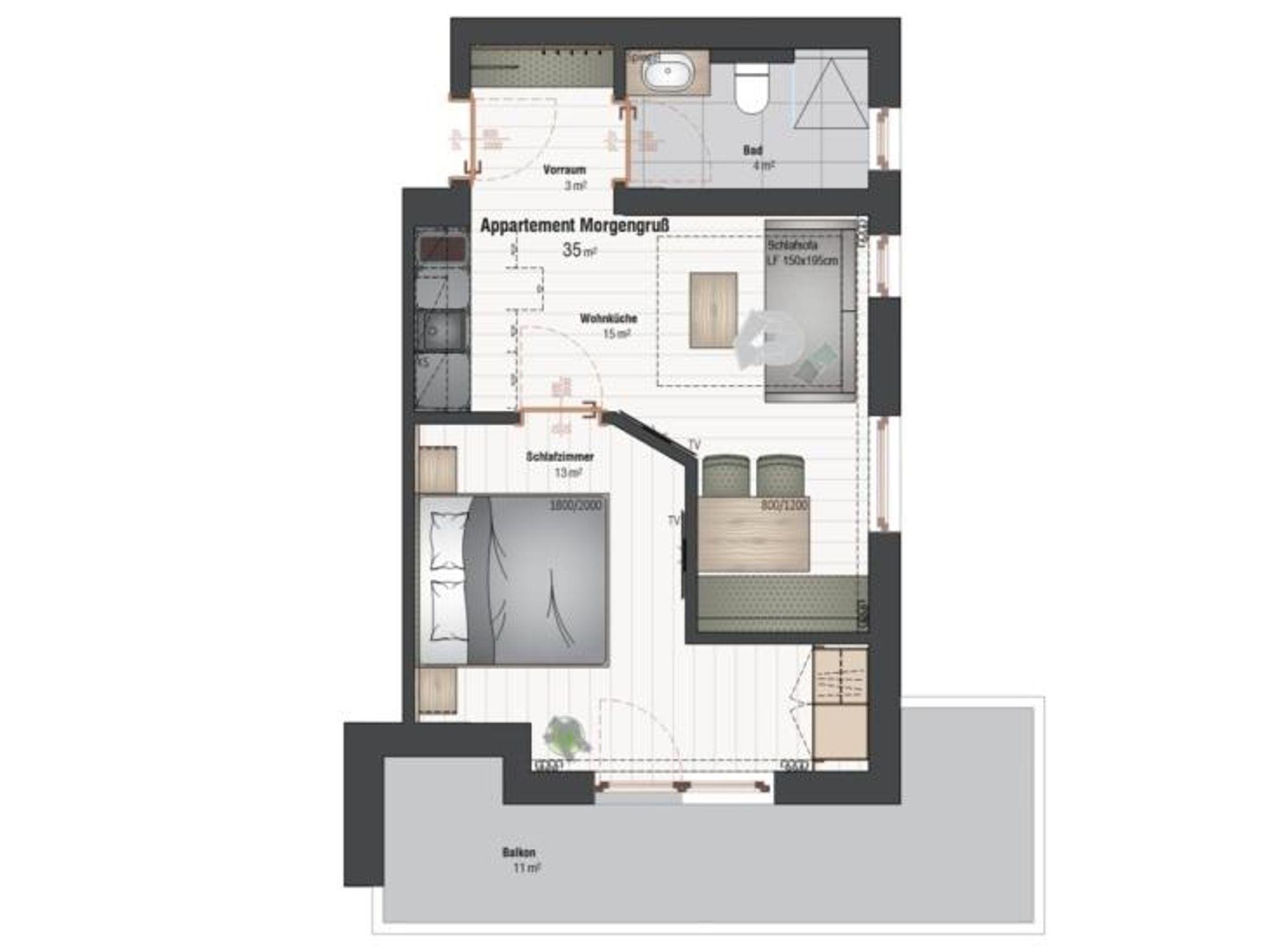 Die Ferienwohnungen Sonnenschein oder Morgengruß sind ideal für 2 Erwachsene und 1 bis 2 Kinder. Großer Balkon mit tollen Panorama in alle Seiten. Ob ins Ennstal, in die Tauern, zum Spielplatz oder zu den Skibergen und Gemsen. Das jeweilige Appartement hat eine Wohnküche mit Schlafcouch in Top Qualität, ein Schlafzimmer mit Doppelbett, ein Badezimmer mit Dusche und WC und einen Balkon.
