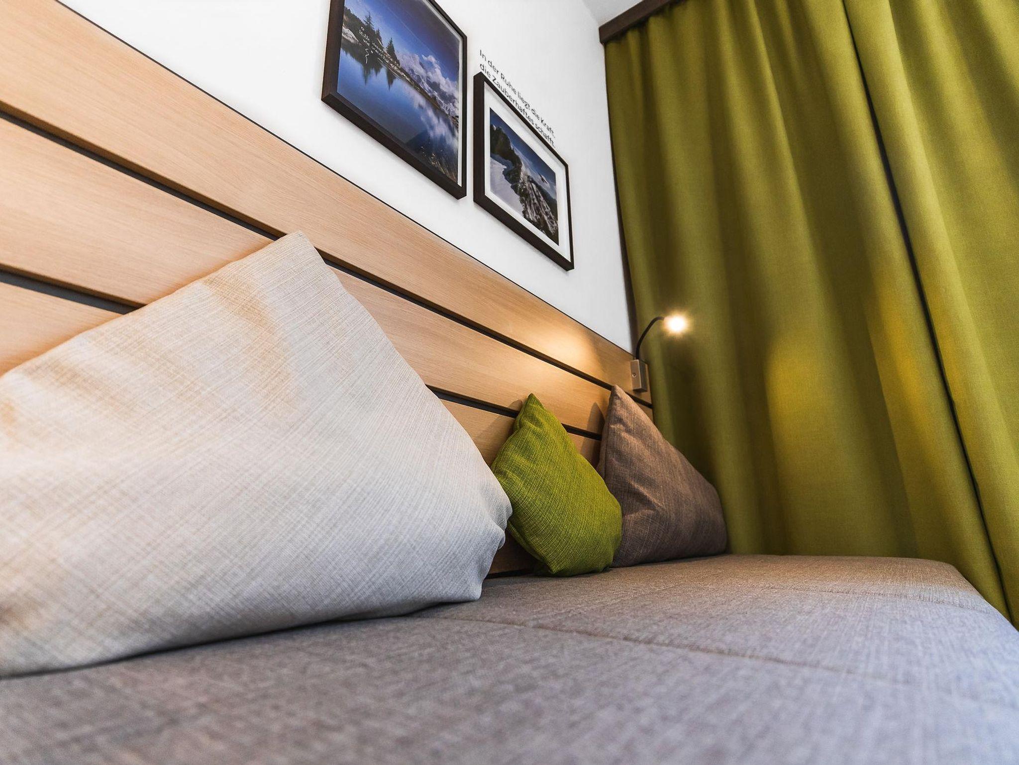 Helle und freundliche Zimmer mit flexiblen Bettensystemen (Doppel-, Einzel-, Sofa-, und Etagenbetten), funktionelle Einrichtung aus natürlichen und regionalen Rohstoffen. Badezimmer mit Dusche/WC