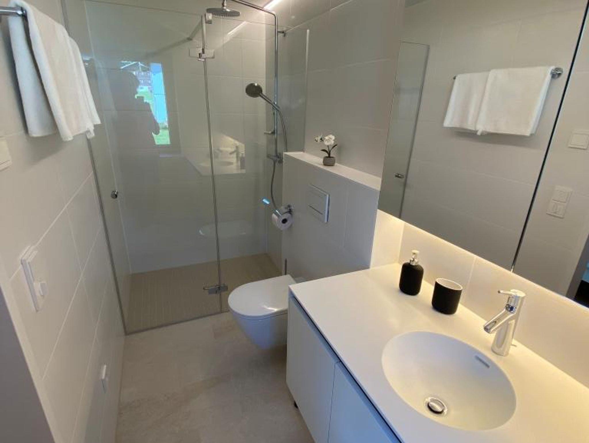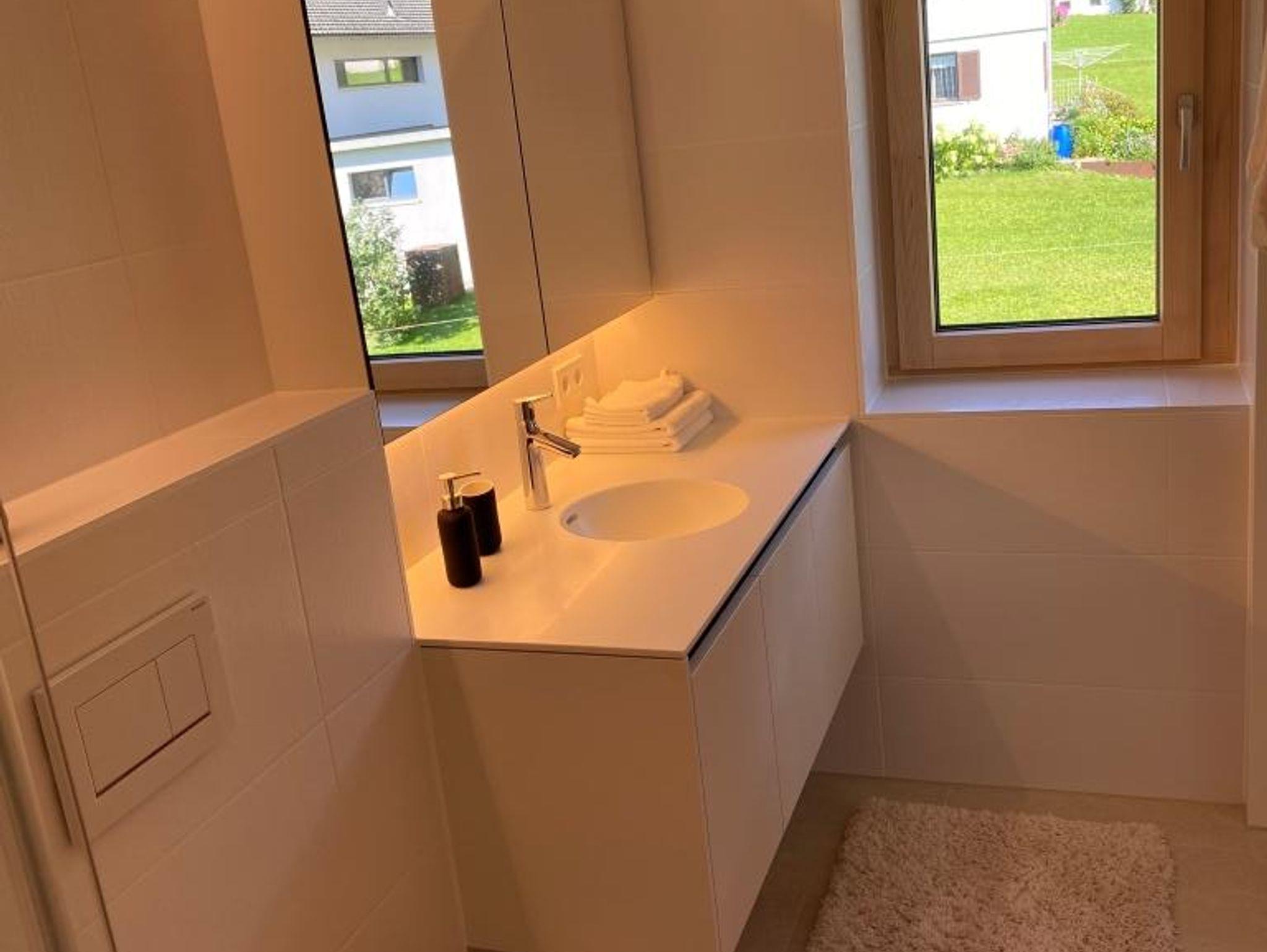 • Modernes Badezimmer mit Bodenheizung, Dusche, Haartrockner und Fenster