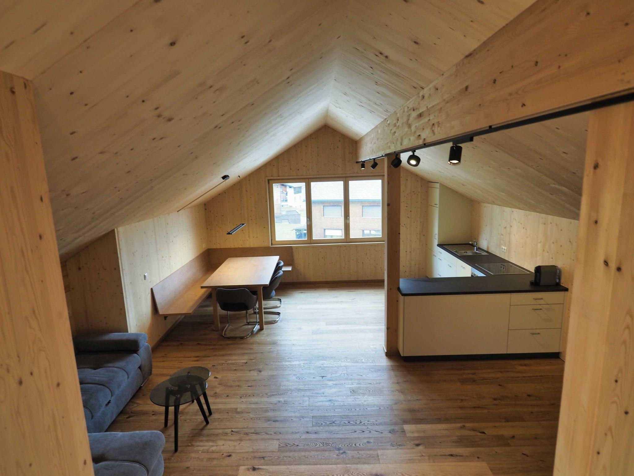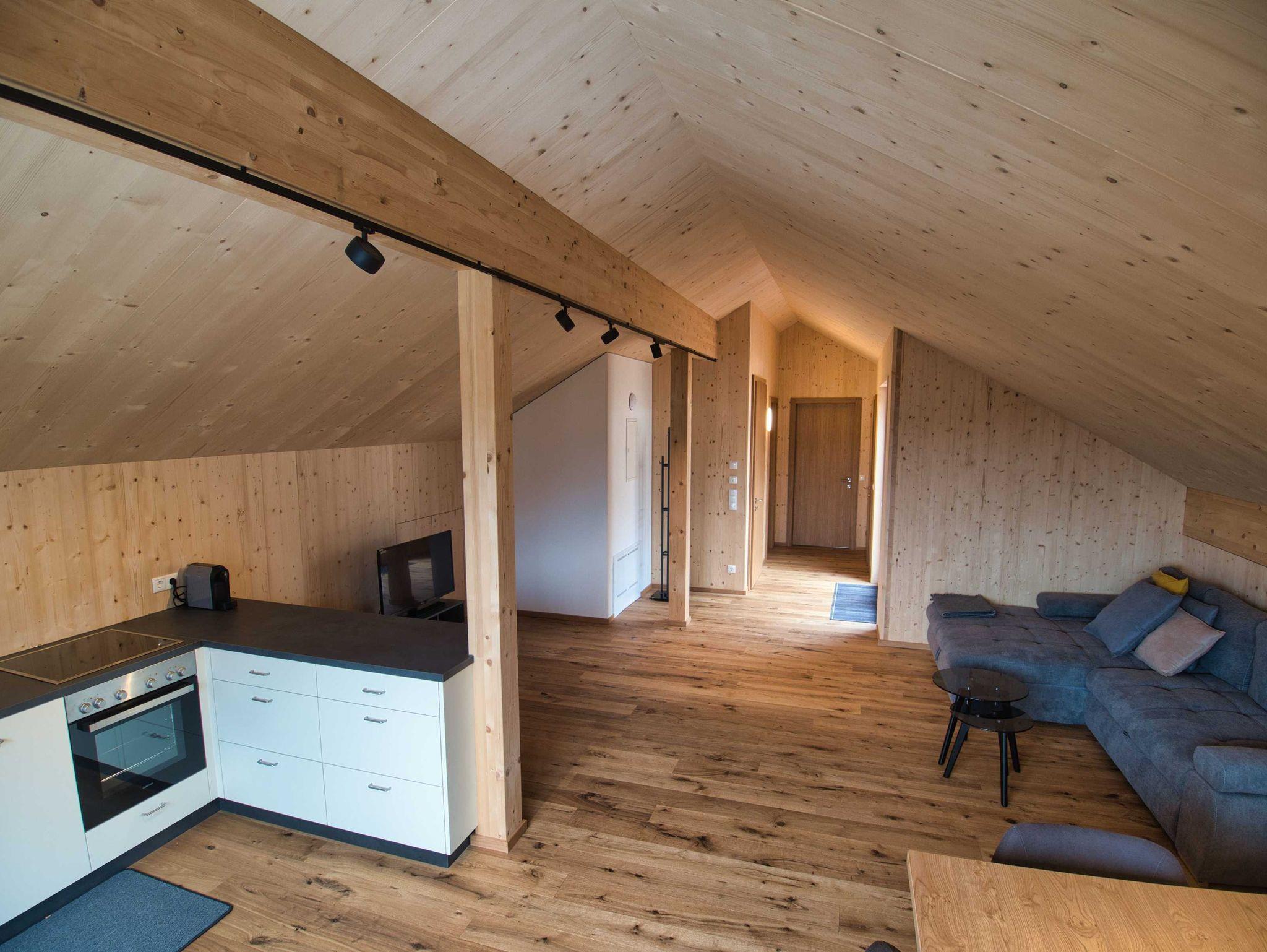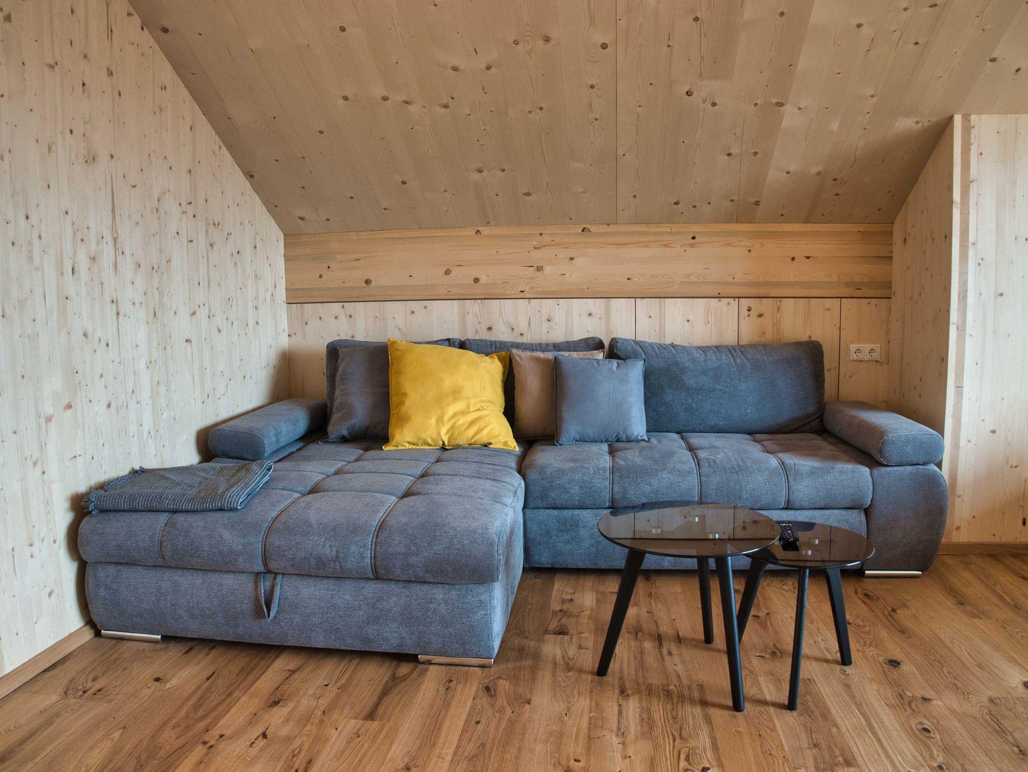 Das Bergreich Appartement 5 hat 80m2 Wohnfläche, die sich auf einen großen Wohn-/Essbereich, zwei Schlafzimmern und ein Badezimmer erstrecken. Ein Schlafzimmer bietet eine Ausziehcouch. Von jedem Fenster aus sind die umliegenden Berge zu sehen. Ein privater Balkon lädt zum Entspannen ein. Das Appartement befindet sich im 2.Obergeschoss und ist über das Stiegenhaus erreichbar.