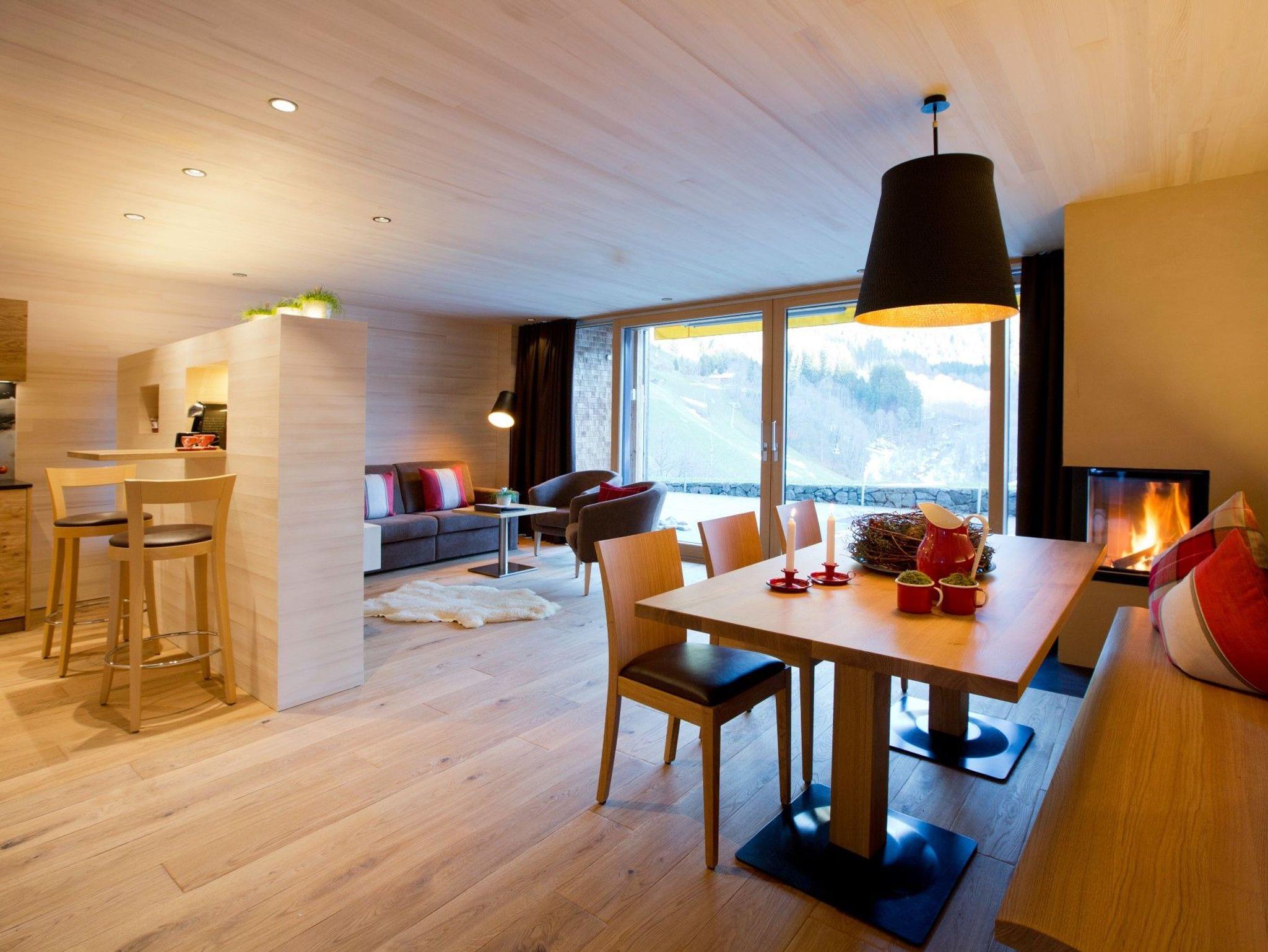 Eine Oase zum Chillen! Offener Kamin, große Terrasse mit Traumblick auf Schoppernau. Rustikaler Eichenholzboden (ideal für Allergiker); Decken und Wände aus heimischer Weißtanne; 190 x 190 cm große Panoramacouch!