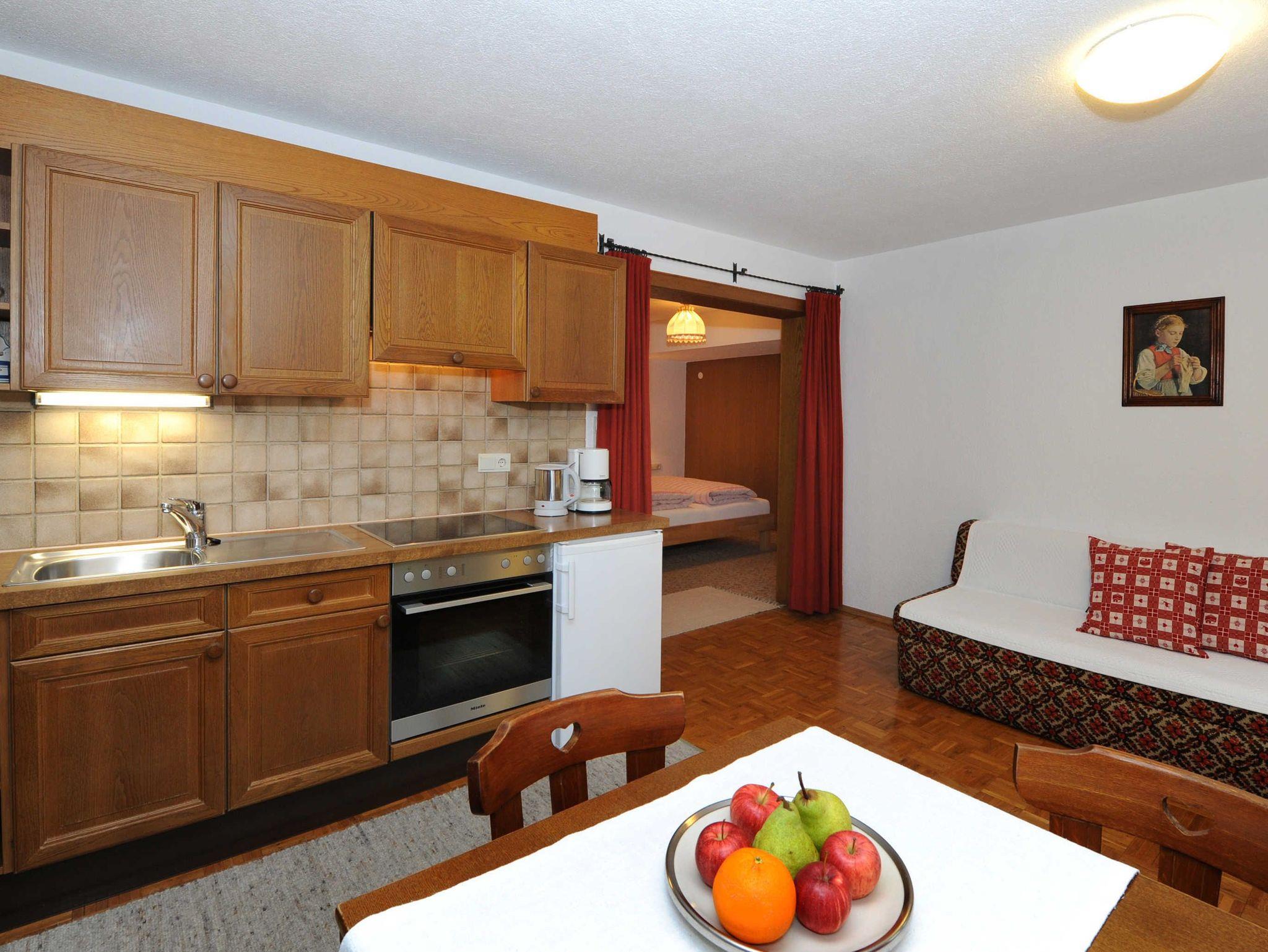 Wohnzimmer mit Couch und geselliger Küche. Garderobe.
