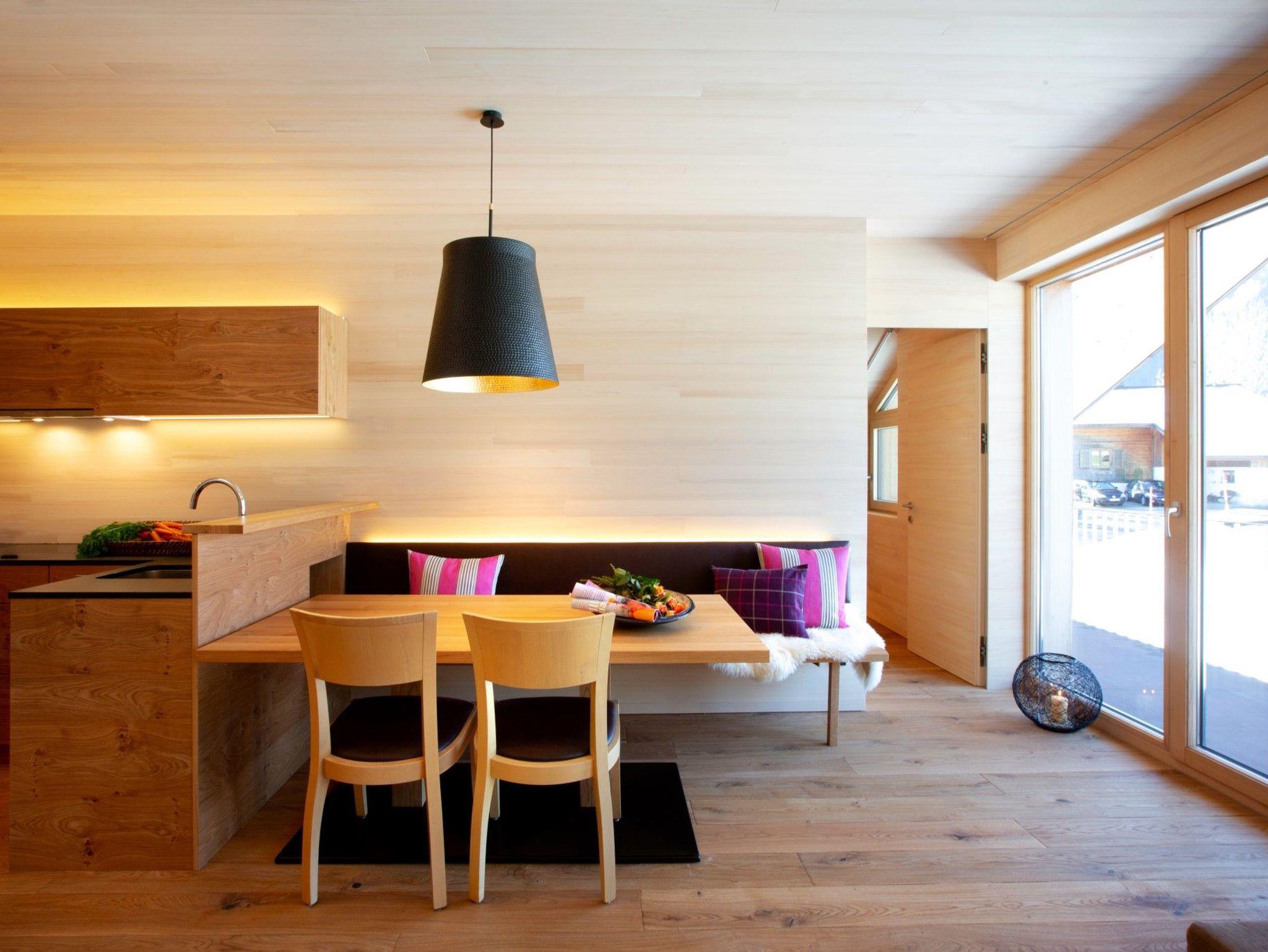 Die große Terrasse mit Traumblick auf die Kanisfluh lädt ein, die Abendsonne zu genießen. Indoor- und Outdoorvergnügen auf 108 m²! 77 m² Wohnkomfort, rustikaler Eichenholzboden (ideal für Allergiker); Decken und Wände aus heimischer Weißtanne; 190 x 190 cm große Panoramacouch!