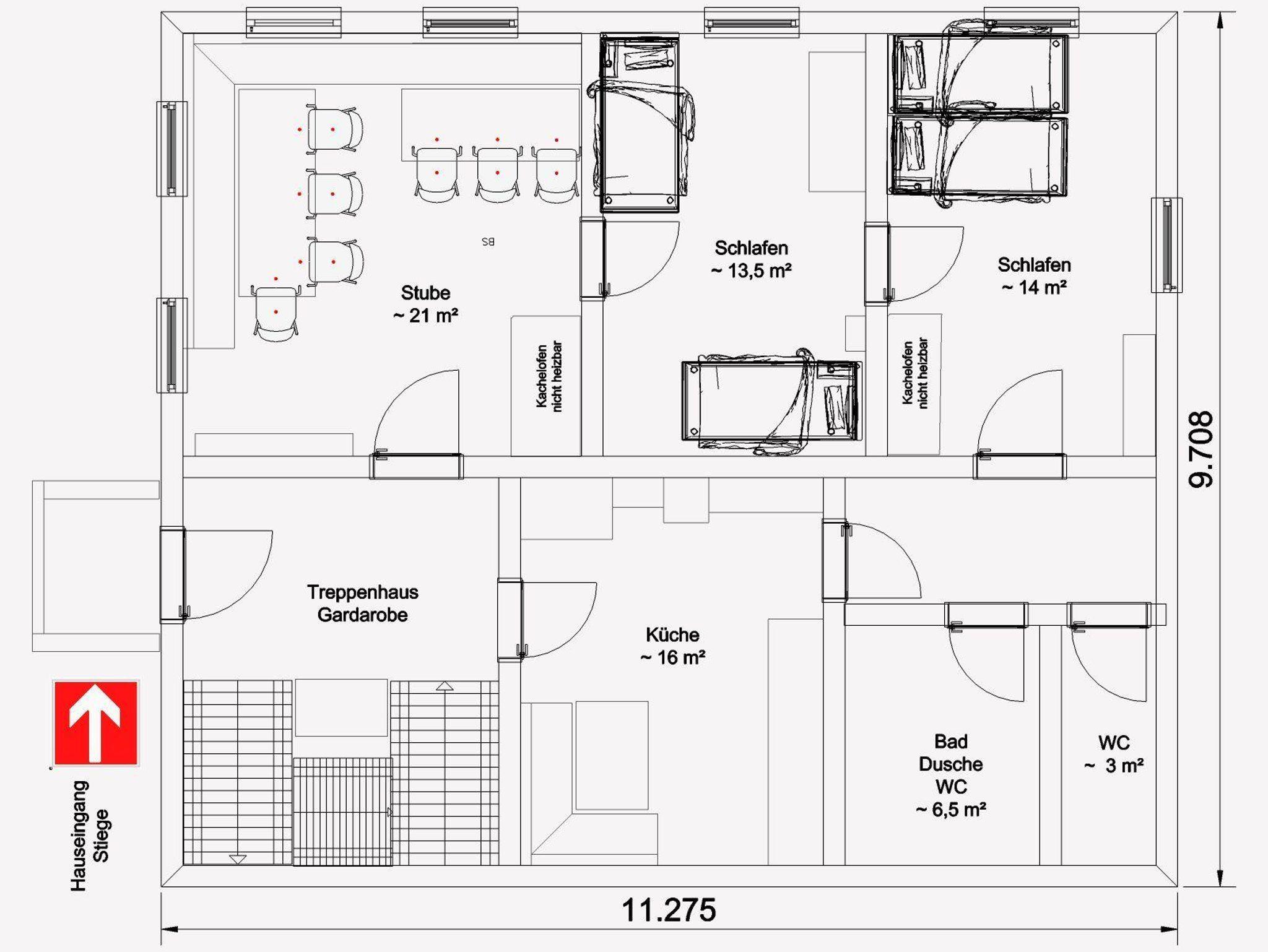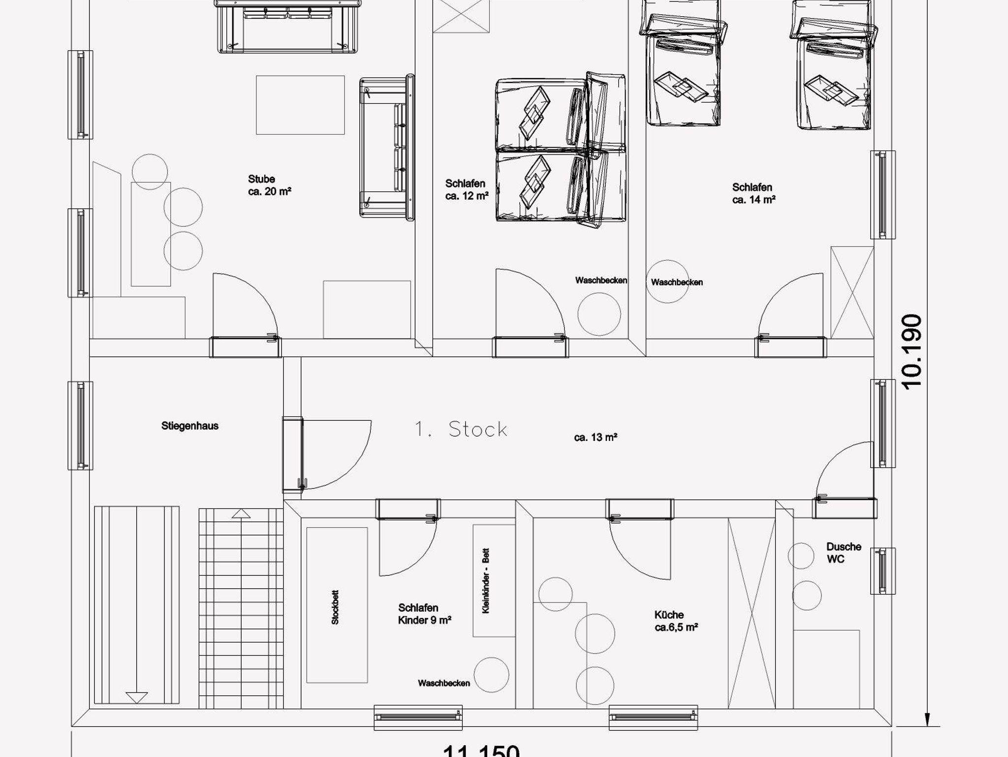 • 1 Mehrbettzimmer (Stockbett und kleineres Bett aber nur als Kinderbett geeignet)