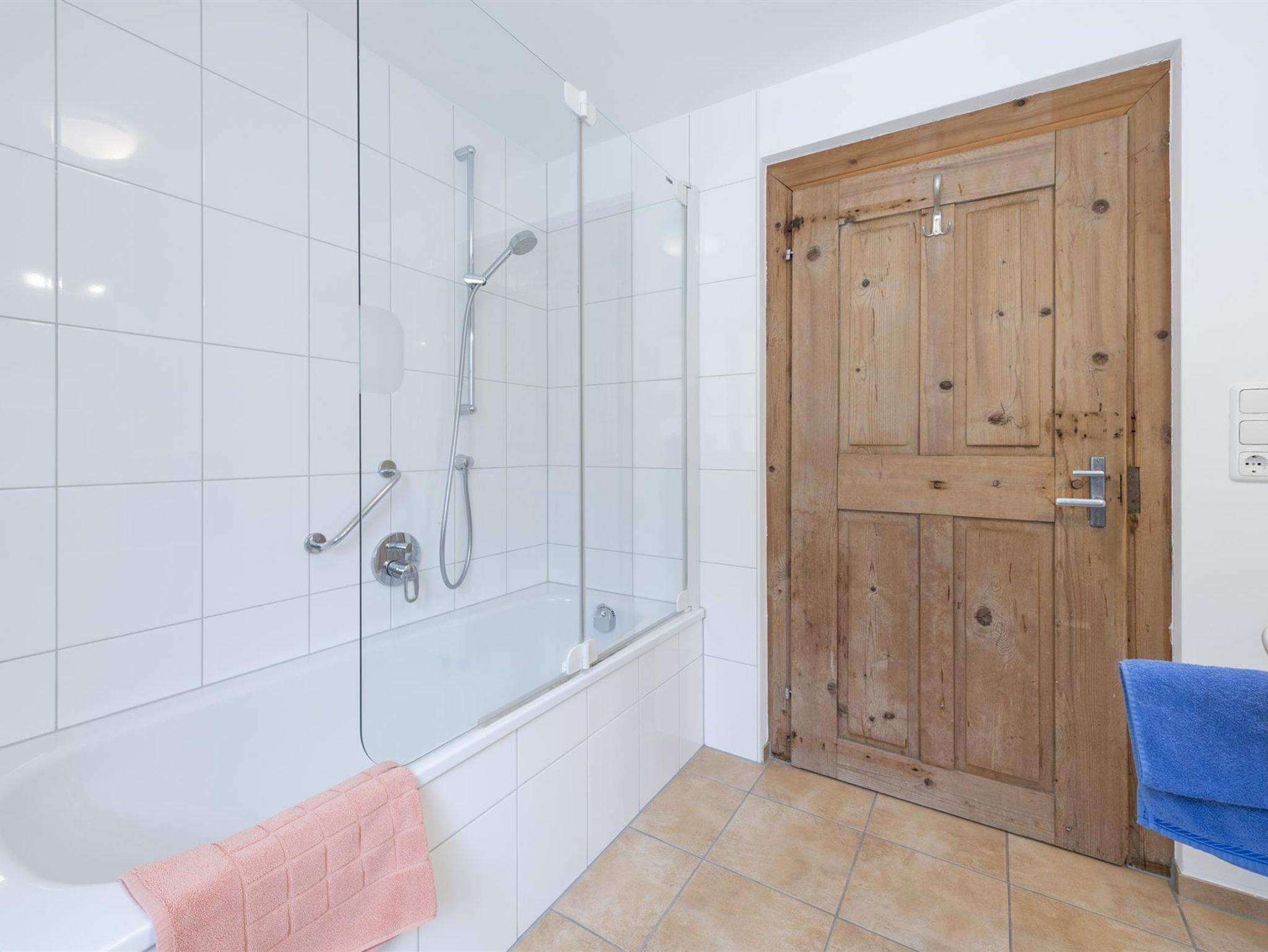 • 1 geräumiges Badezimmer mit Badewanne und WC