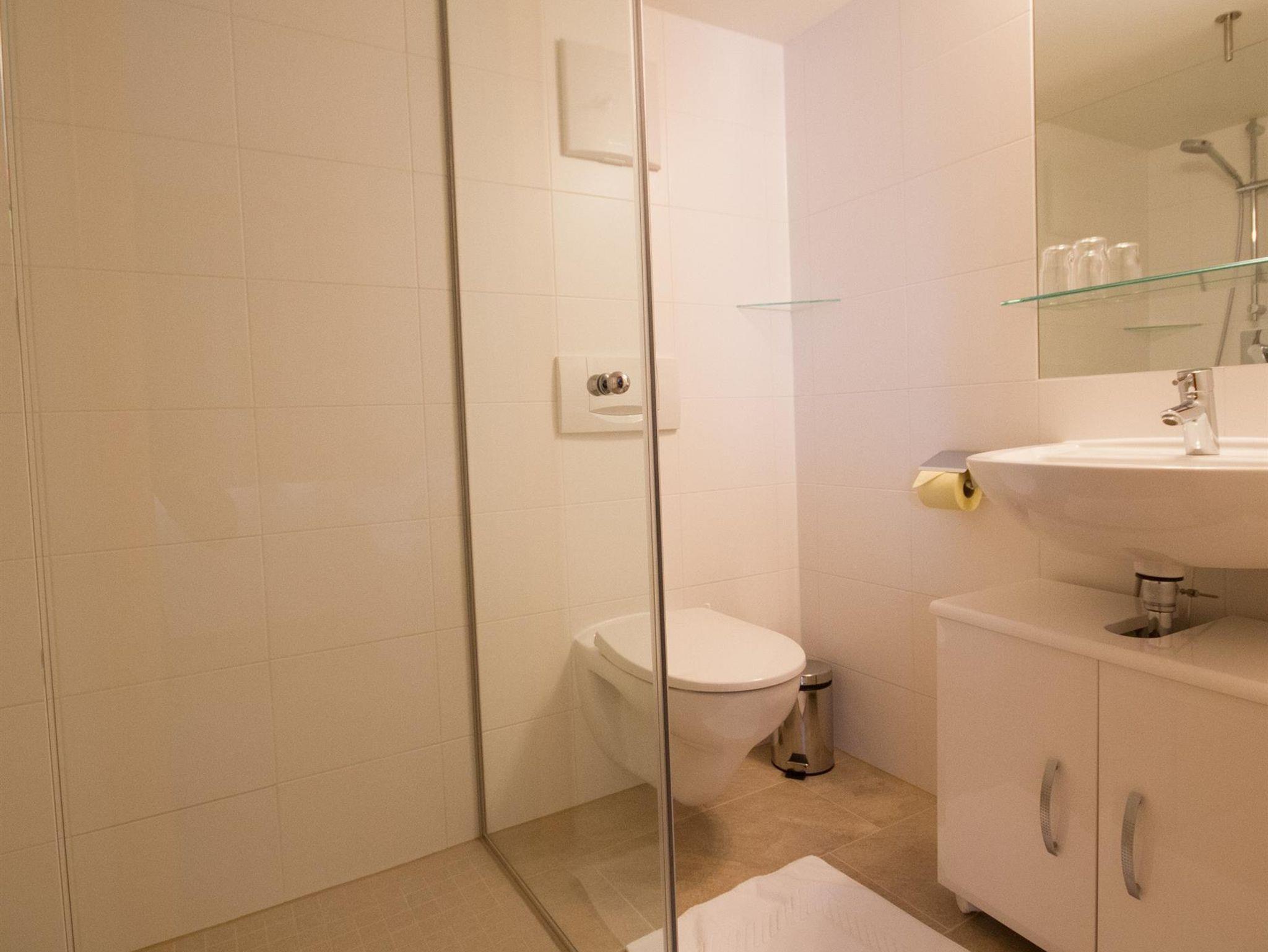 Großes Doppelzimmer mit zusätzlichem Bett (ausziehbar auf franz. Größe mit richtiger Matratze)und DU/WC mit Handtuchwärmer.