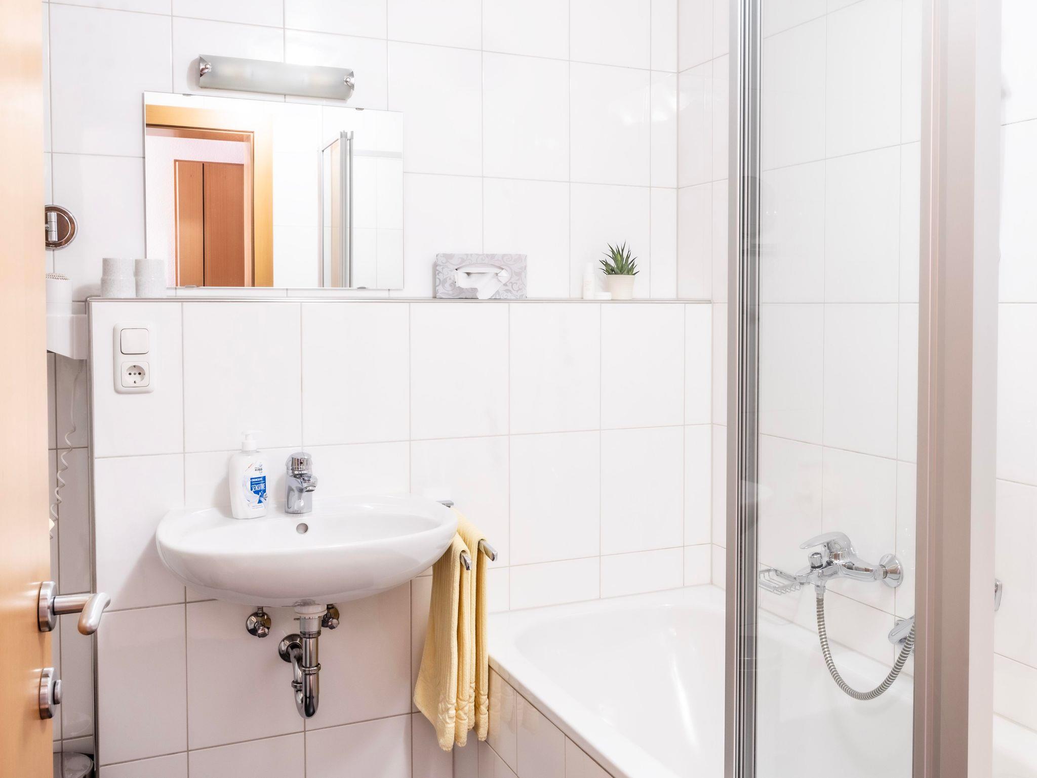 ein großes Badezimmer mit Badewanne/Dusche WC, Handtuchwärmer und Fön, und ein separates WC, große Wohnküche mit Couchecke, Spülmaschine und Mikrowelle, Filtercafemaschine, Senseo und Wasserkocher, Toaster, Balkon, Zimmersafe, Radio mit CD und Sat- TV mit DVD Player.