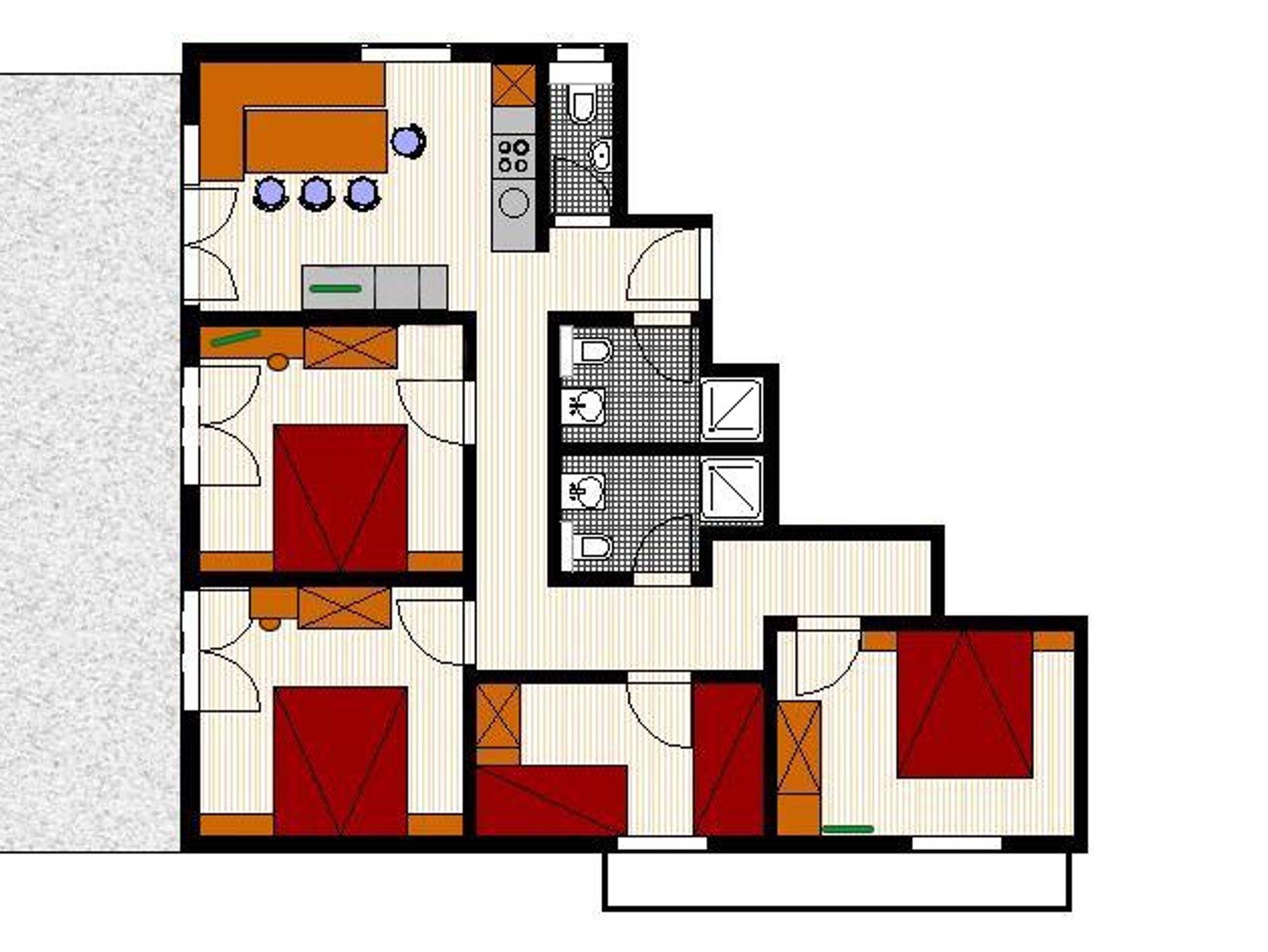 Große Ferienwohnung mit 4 getrennten Schlafzimmer - 3x Doppelzimmer und 1x Zweibettzimmer, 2x Dusche/WC (jeweils ein Haarfön vorhanden), separates WC. Ebenerdiges Appartment mit Terrasse (zugänglich Küche, sowie von 2 Schlafzimmer)