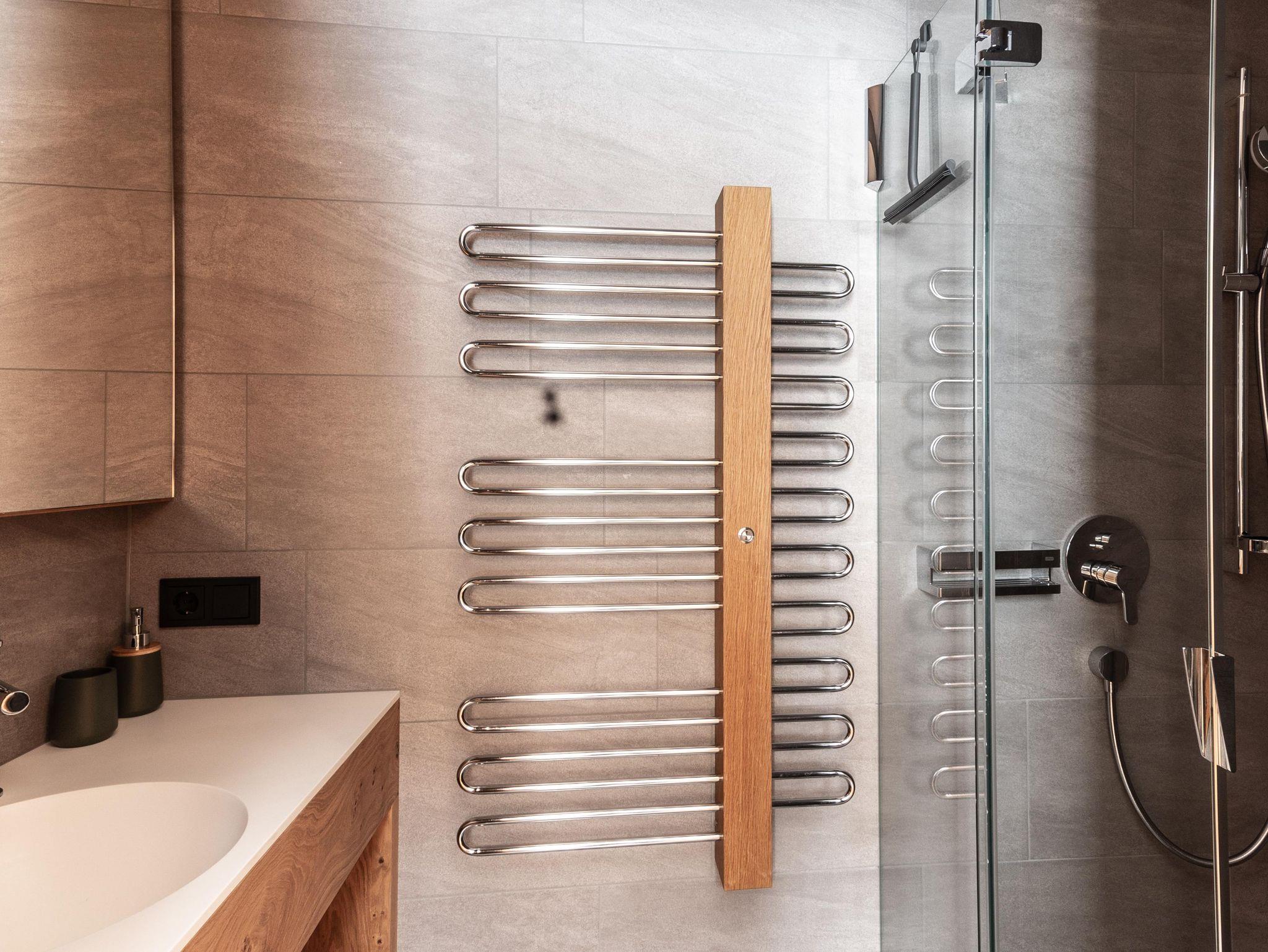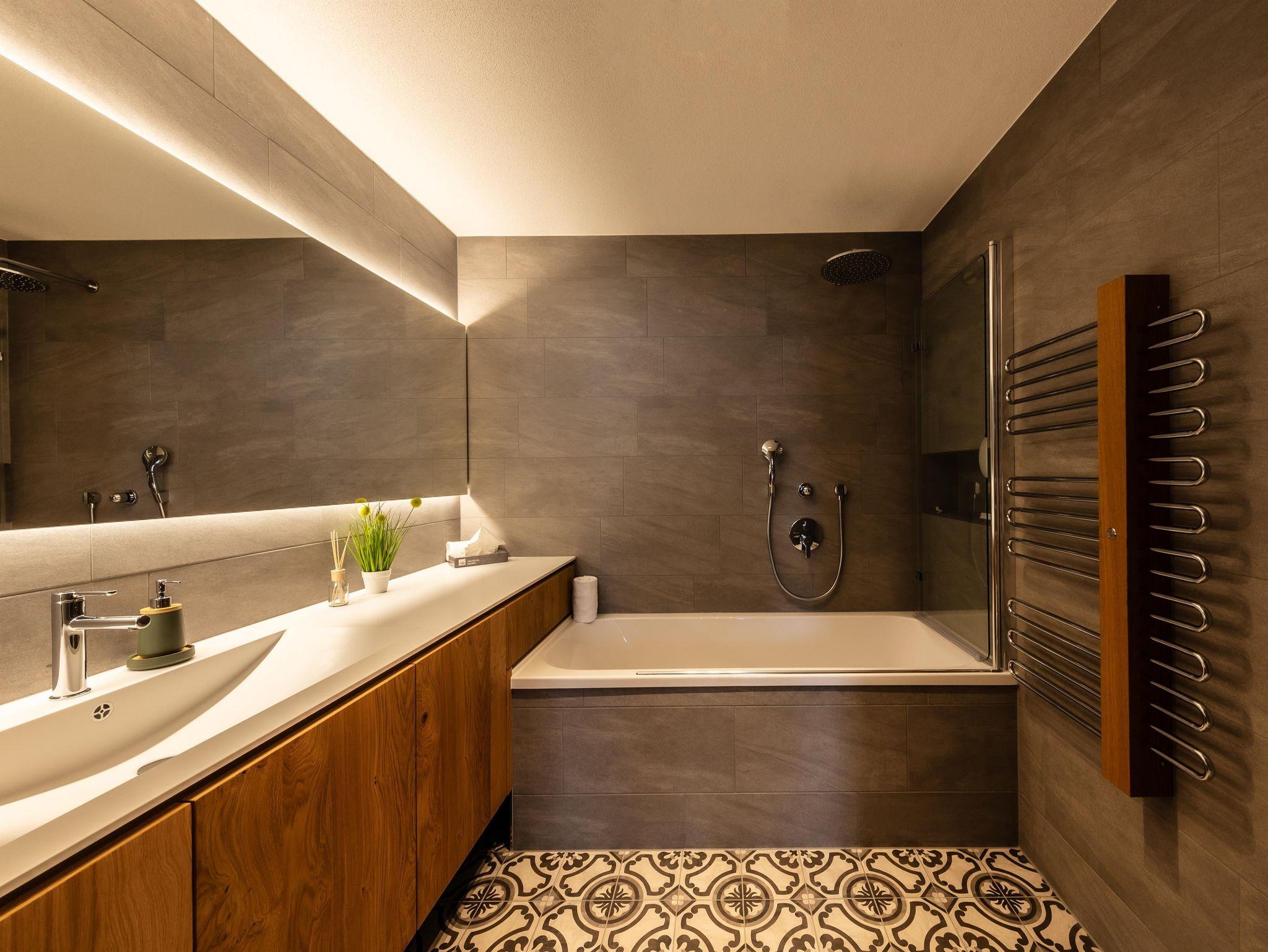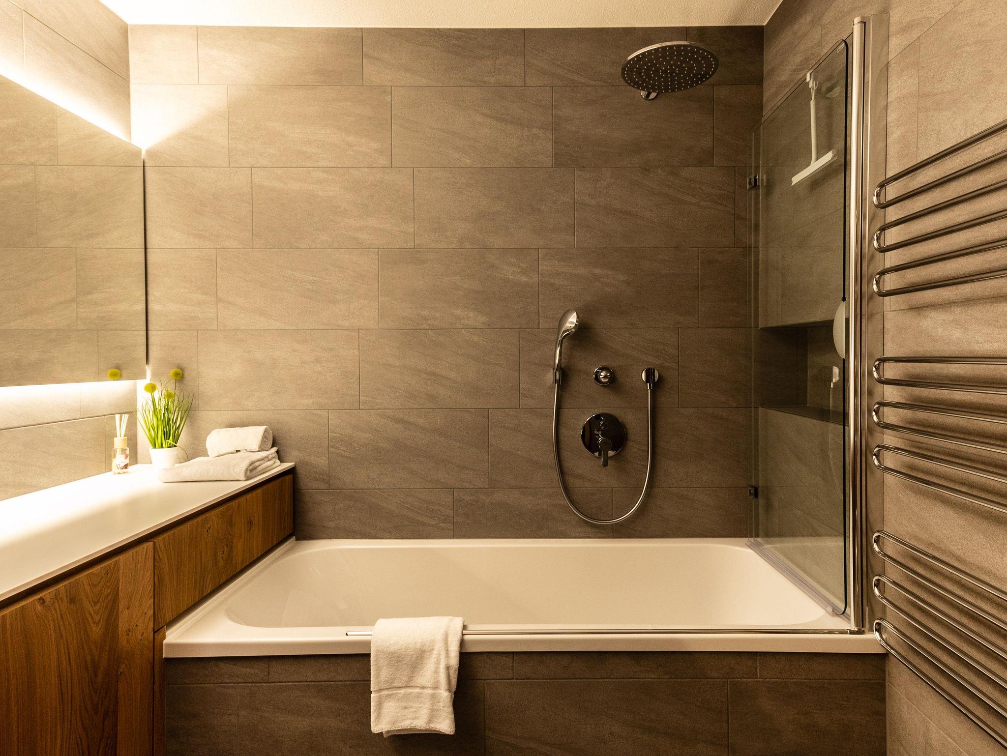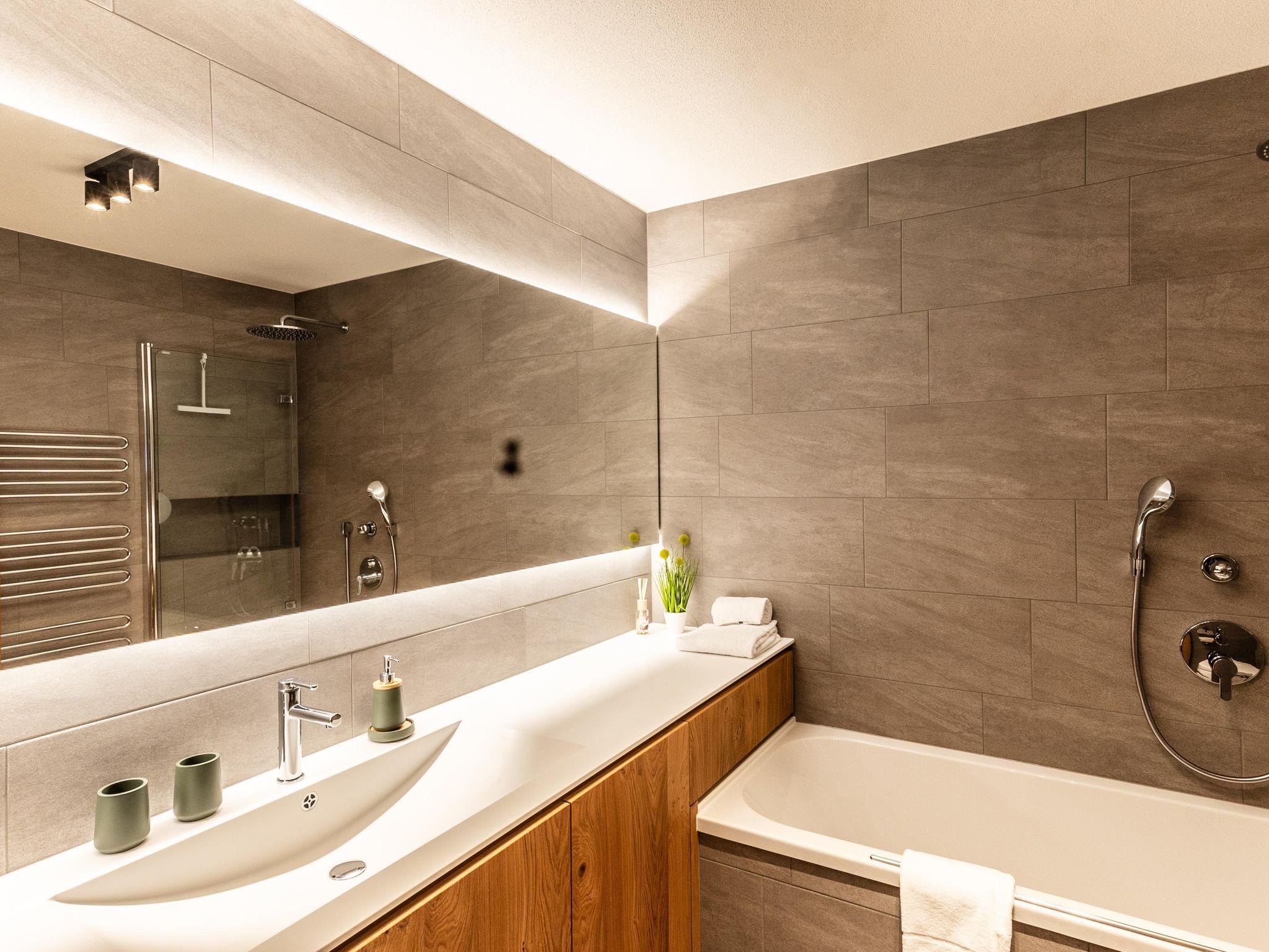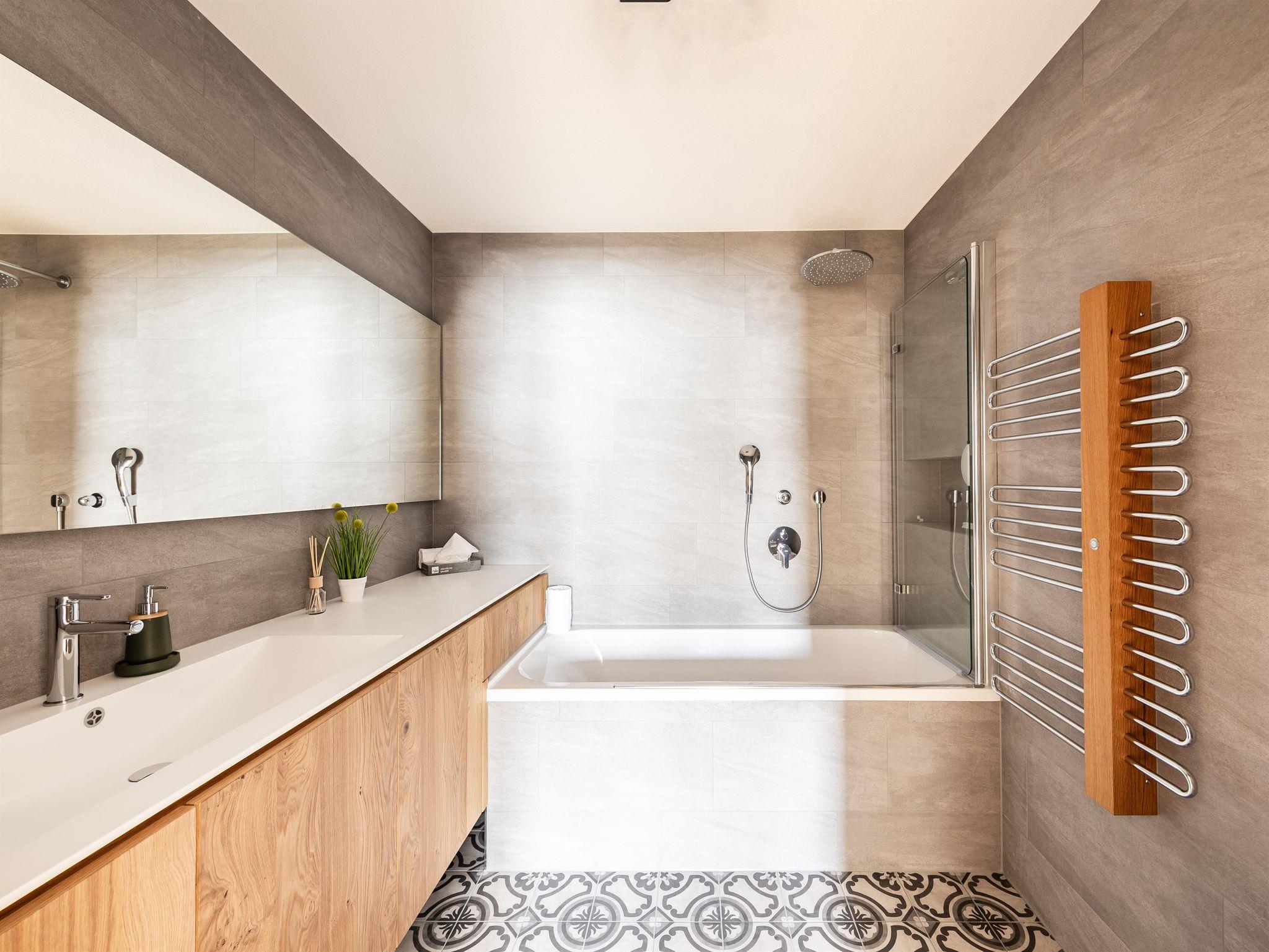 2 Bäder: 1 Badezimmer mit Dusche und 1 Badezimmer mit Badewanne +Dusche und WC. 1 separates WC.