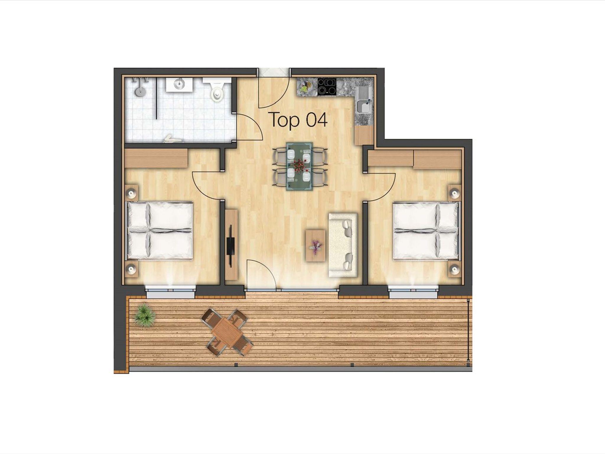 Bestehend aus einem Wohnraum mit Küche, Esstisch, Couch und TV.