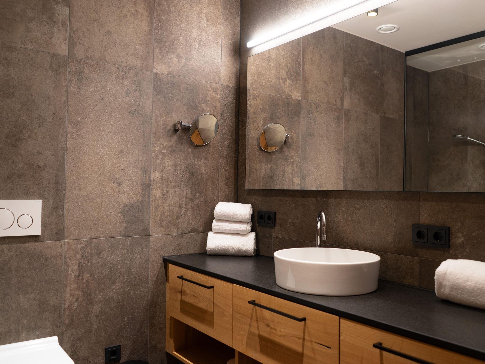 Auf 55 m 2 verfügt das Apartment über kostenloses WLAN und zwei Smart-TV, einen im Wohnbereich und einen im Schlafzimmer. Die Küche ist mit Backofen, Induktions-Kochfeld, Geschirr, Koch-Utensilien, Kaffeemaschine, Wasserkocher und Toaster voll ausgestattet. Die Suite hat Zugang zu einem überdachten Balkon mit Heizung. Das Schlafzimmer ist über ein Schrankzimmer mit dem Badezimmer mit Badewanne und Toilette verbunden. Im Schrank findet sich ein Schranktresor. Ihr Auto stellen sie sicher in der dazugehörigen Tiefgarage ab, wo auch Ladestationen für E-Autos zur Verfügung stehen. Im Resort befindet sich ein Lift, sowie eine Waschküche mit Waschmaschine und Trockner. Kulinarisch umsorgt werden unsere Gäste mit unserem Frühstücksangebot, Brötchen- und Kühlschrankservice, sowie über den Automatenshop, der regelmäßig mit frischen Speisen unseres Haubenkochs A. Shala befüllt wird.