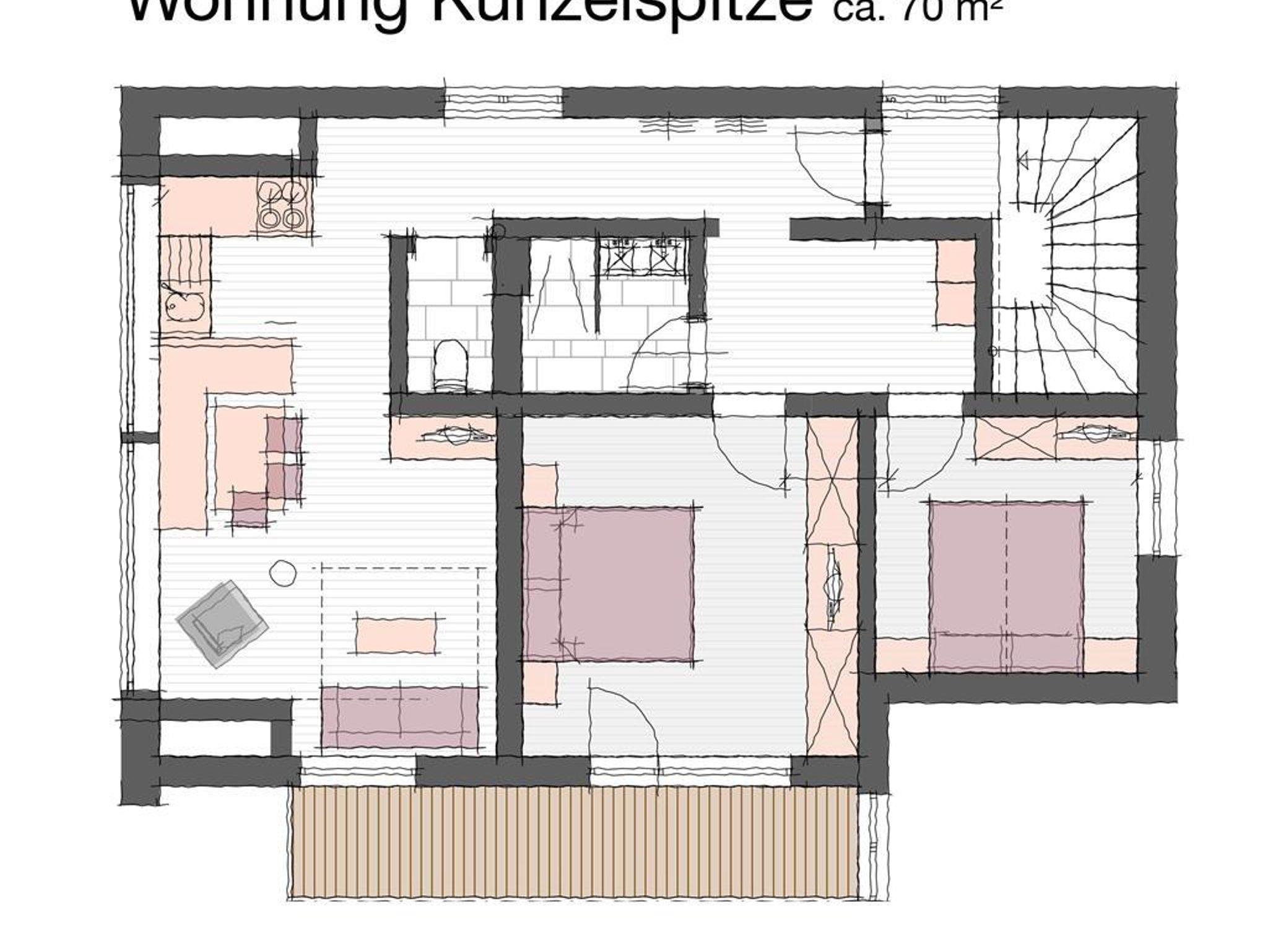 Das gemütliche Dachapartment Künzelspitze bietet auf 70 m2 Platz für bis zu sechs Personen. Es verfügt über zwei Schlafzimmer, einen offenen Wohnraum inklusive Küche, ein Bad und ein separates WC.