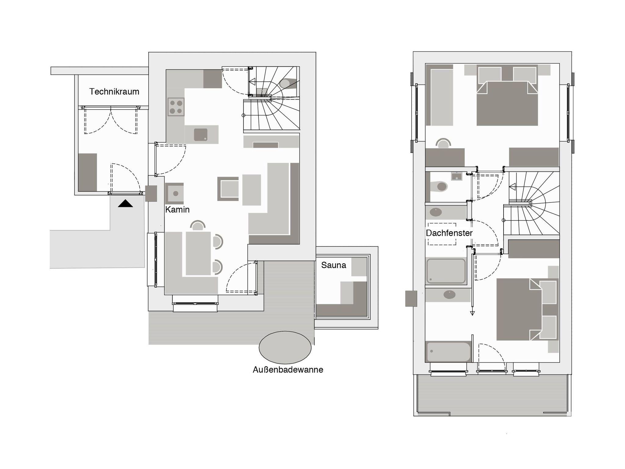Das Haus ist über das Erdgeschoss erschlossen wo sich der Wohnraum mit sehr gut ausgestatteter Küche, Essbereich mit Eckbank und Wohnzimmer mit Couch, sowie ein extra WC befinden. Die großen Fenstern und der verglaste Kamin schaffen eine besondere Atmosphäre. Im Obergeschoss liegen die beiden Schlafzimmer, zwei Badezimmer und ein extra WC. Die Badewanne an der großen sichtgeschützen Verglasung bietet fantastische Ausblicke in die umliegende Bergwelt. Beide Etagen verfügen über einen Balkon bzw. Terrasse, die private Sauna und die sichtgeschützte Außenbadewanne laden zum Genießen ein.