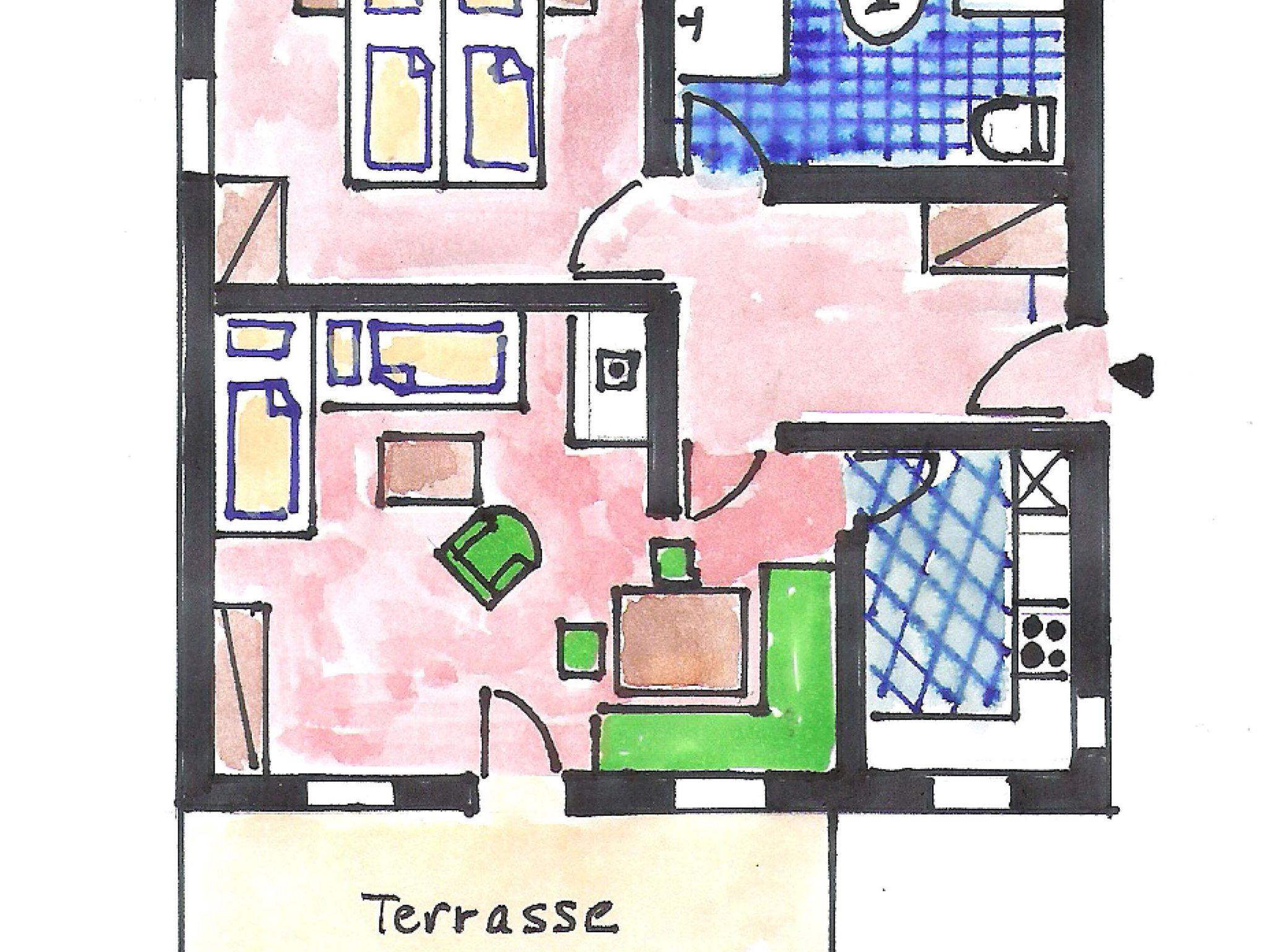Wohnung für 1-4 Personen, 65 m², mit 1 Schlafzimmer, 1 Wohn-Schlafzimmer mit Eckbank, Sofa und Kabel-TV, gut ausgestattete Küche mit Spülmaschine, DU/ WC und eigener Terrasse.
