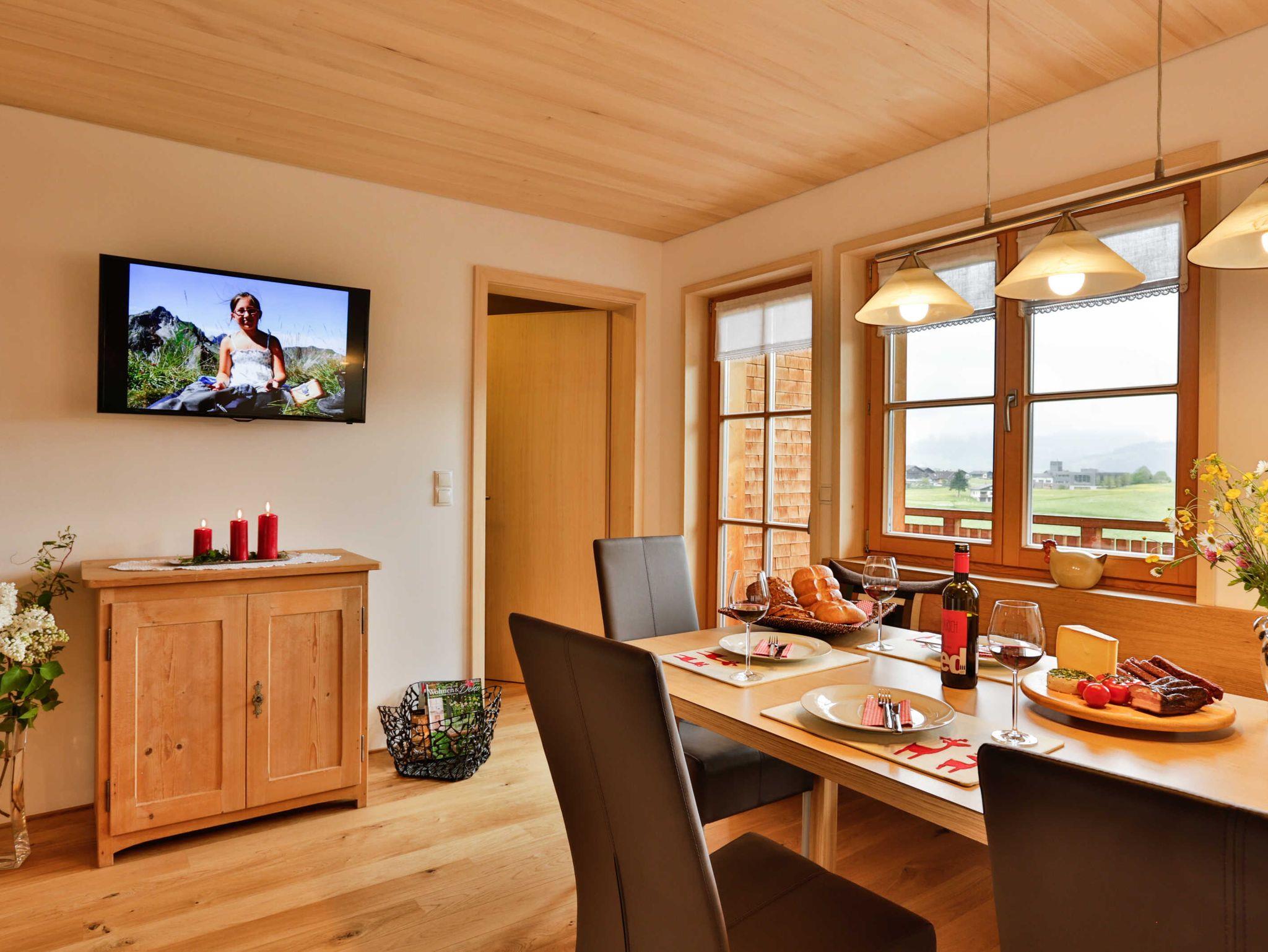 Auf 55 m² befinden sich eine großzügig gestaltete und einladende Wohnküche, 2 Schlafzimmer, Badezimmer und ein Balkon, der die Aussicht auf Wiesen und Felder und die Bergwelt des Bregenzerwaldes freigibt.