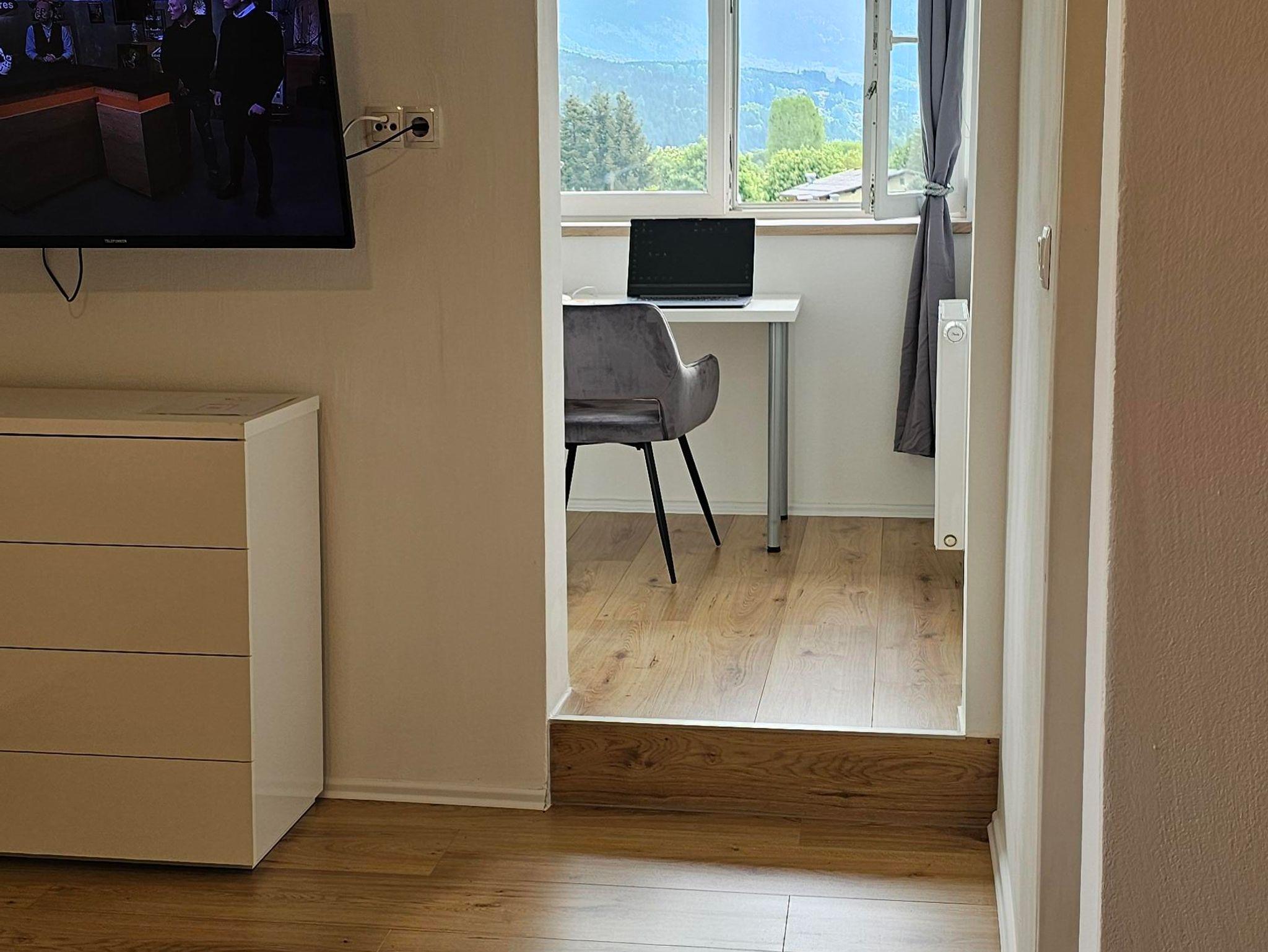 Ferienwohnung bestehend aus 2 Schlafzimmern (Boxspringbetten) mit jeweils Dusche/WC und TV/Sat, Küche mit Esstisch und voller Ausstattung (Geschirrspüler, Küchlschrank mit Gefrierfach,Backofen, Herd, Wasserkocher und Filterkaffeemaschine), Abstellraum, Wohnzimmer mit TV/Sat, WC, Panoramaterrasse mit Garten- und Goldeckblick und leichten Seeblick, Gartenbenutzung möglich.