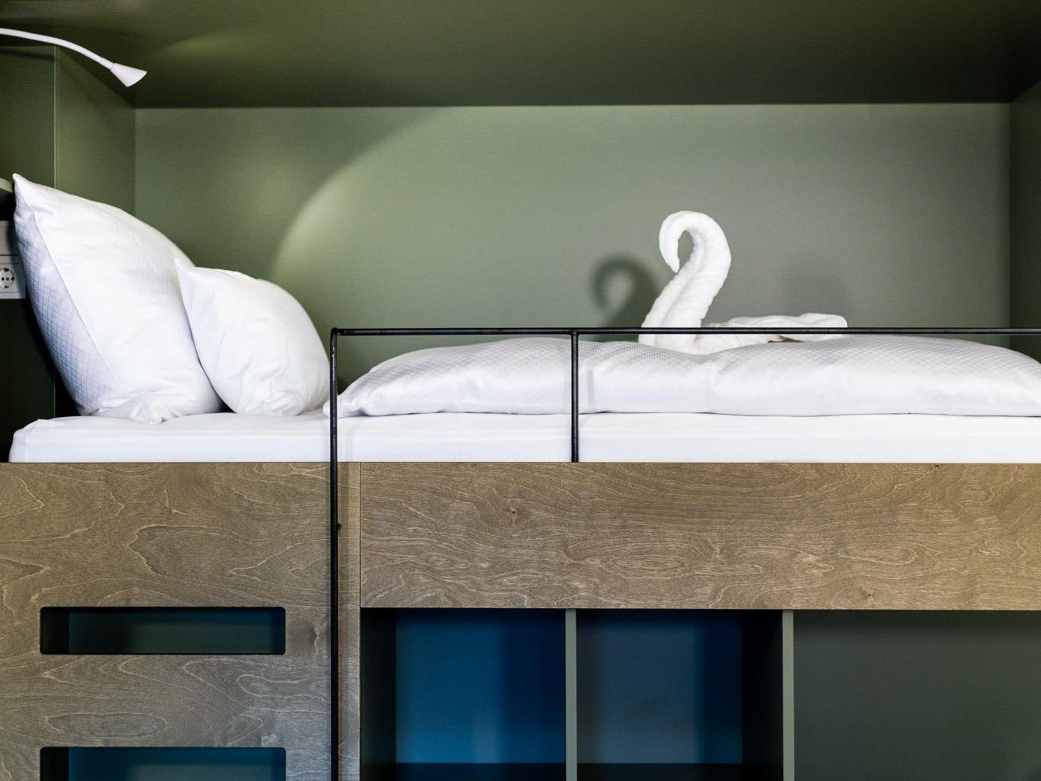 Zum Appartment Nuss im Dachgeschoss gelangt man mit dem Lift (bis zum 2. OG) und dann über ein paar letzte Stufen unters Dach. Die loftartigen Räume mit großzügigem Wohn- und Schlafraum sind mit großem Balkon Richtung Süden ausgerichtet. Ein Doppelbett, zwei Schlafkojen und ein Schlafsofa bieten bis zu sechs Personen Platz. Die Kochecke ist komplett bestückt mit allem was man zum gemütlichen Kochen braucht.