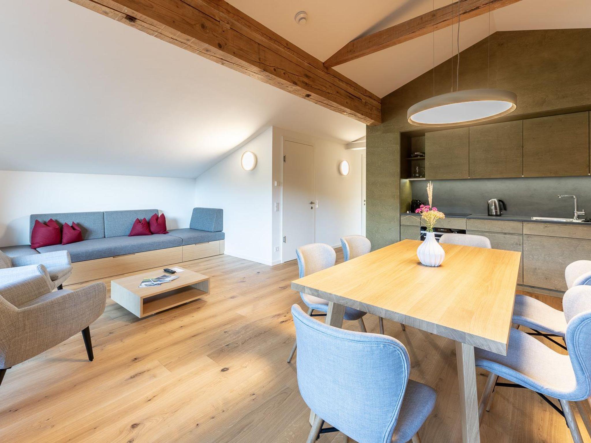 UNSERE APPARTEMENTS SIND EINE FREUDE FÜR ALLE SINNE ? Allein der Duft der naturbelassenen heimischen Hölzer wie Lärche und Eiche – schonend gebürstet, geölt, gewachst oder gekalkt – wirkt entspannend. Durch das Zusammenspiel von Holz und viel natürlichem Licht entsteht ein stimmungsvolles Wohngefühl.