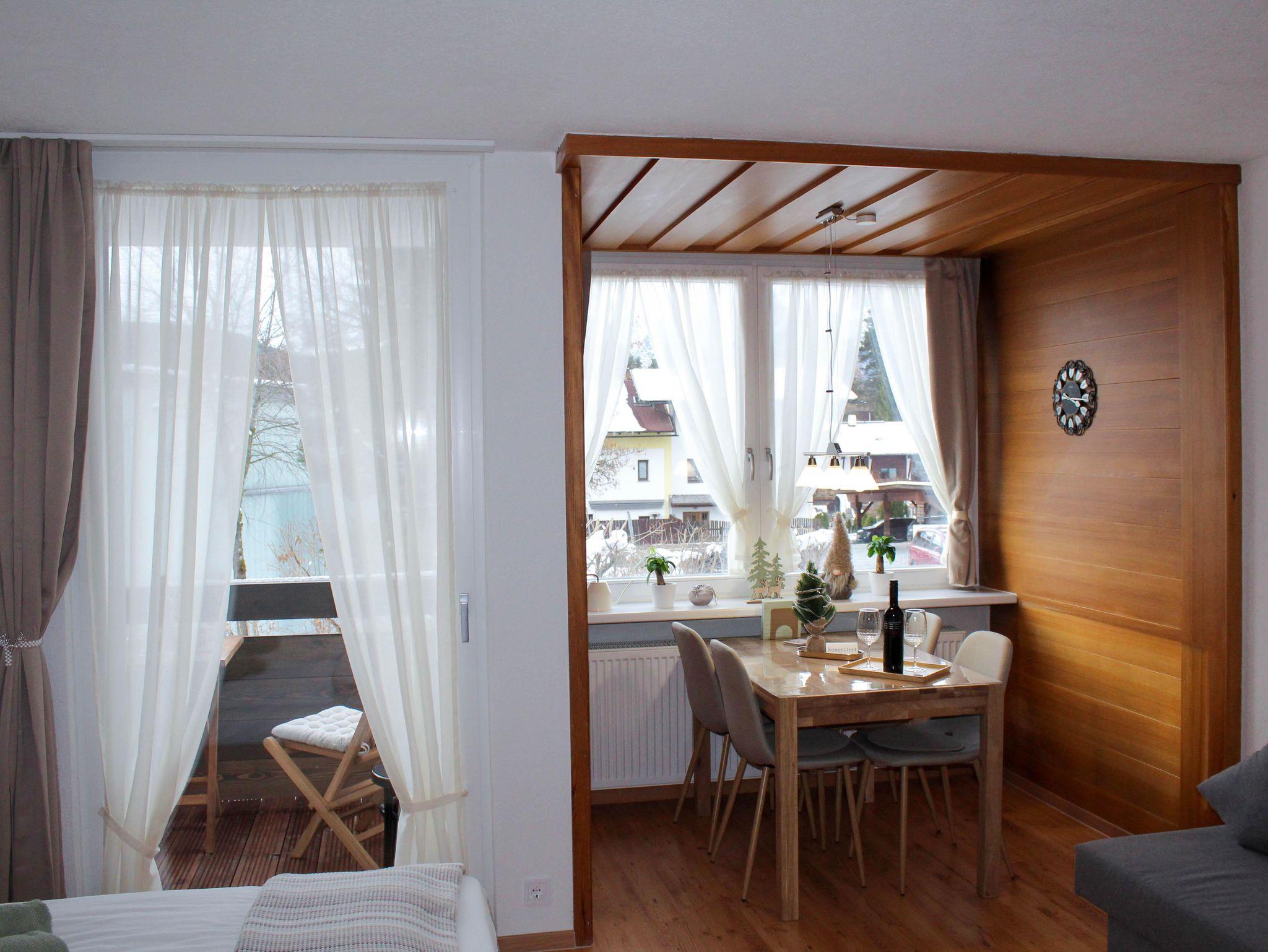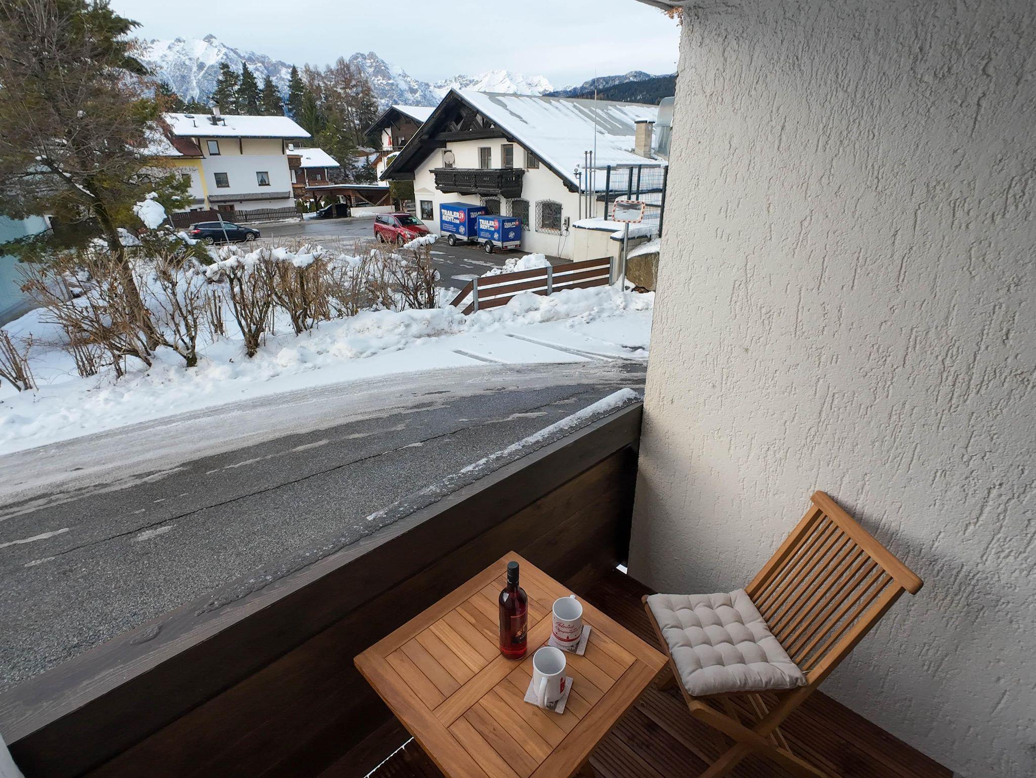 Vom Balkon und Esszimmer aus genießen Sie einen herrlichen Blick auf die Hohe Munde und den Wetterstein. Das Panorama lässt sich beim Essen oder Entspannen wunderbar genießen. Die renovierte Wohnung mit ihren klaren Linien macht Erholung noch attraktiver.