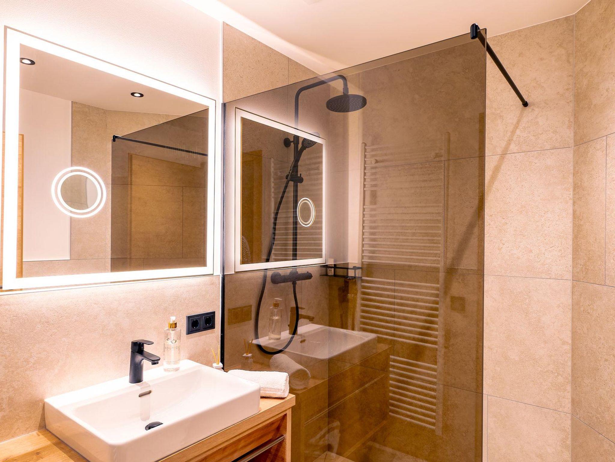 Die Ferienwohnung Jagdrevier Top 2 70m² wurde im April 2024 renoviert und bietet ein großes Schlafzimmer mit Bergblick und ein kleineres Schlafzimmer mit zwei Einzelbetten. Der Wohn- und Essbereich ist geräumig und verfügt über eine voll ausgestattete Küche. Das moderne Bad hat eine ebenerdige Dusche und ein separates WC. Weitere Annehmlichkeiten sind ein Balkon mit Bergblick, Nespresso Kaffeemaschine ,Spülmaschine ,zwei Smart-TVs mit Kabelanschluss und schnelles WLAN. Haustiere Willkommen