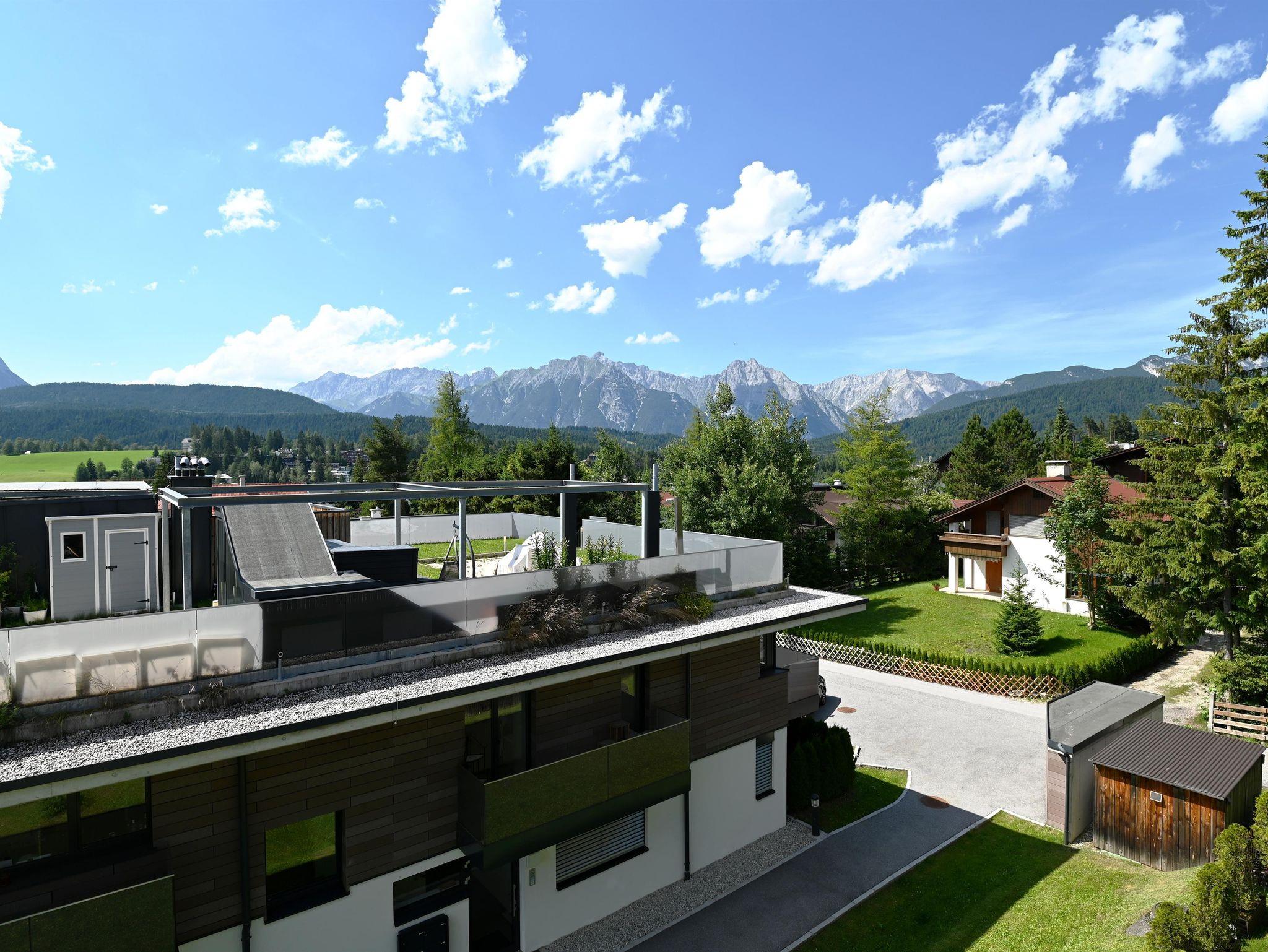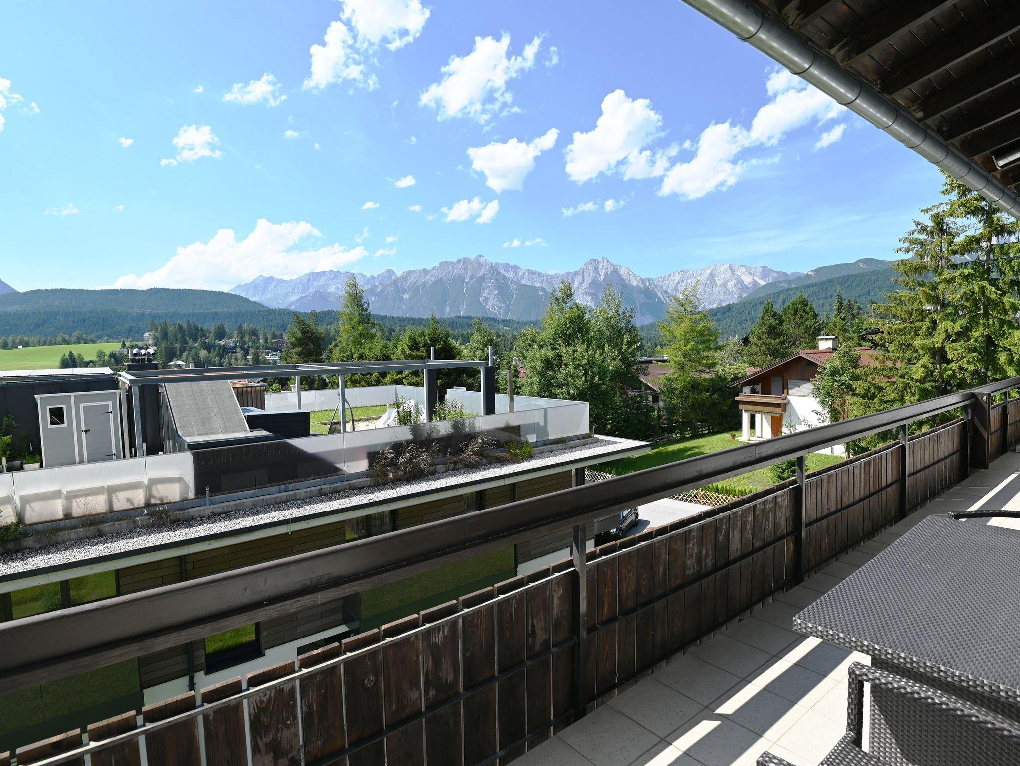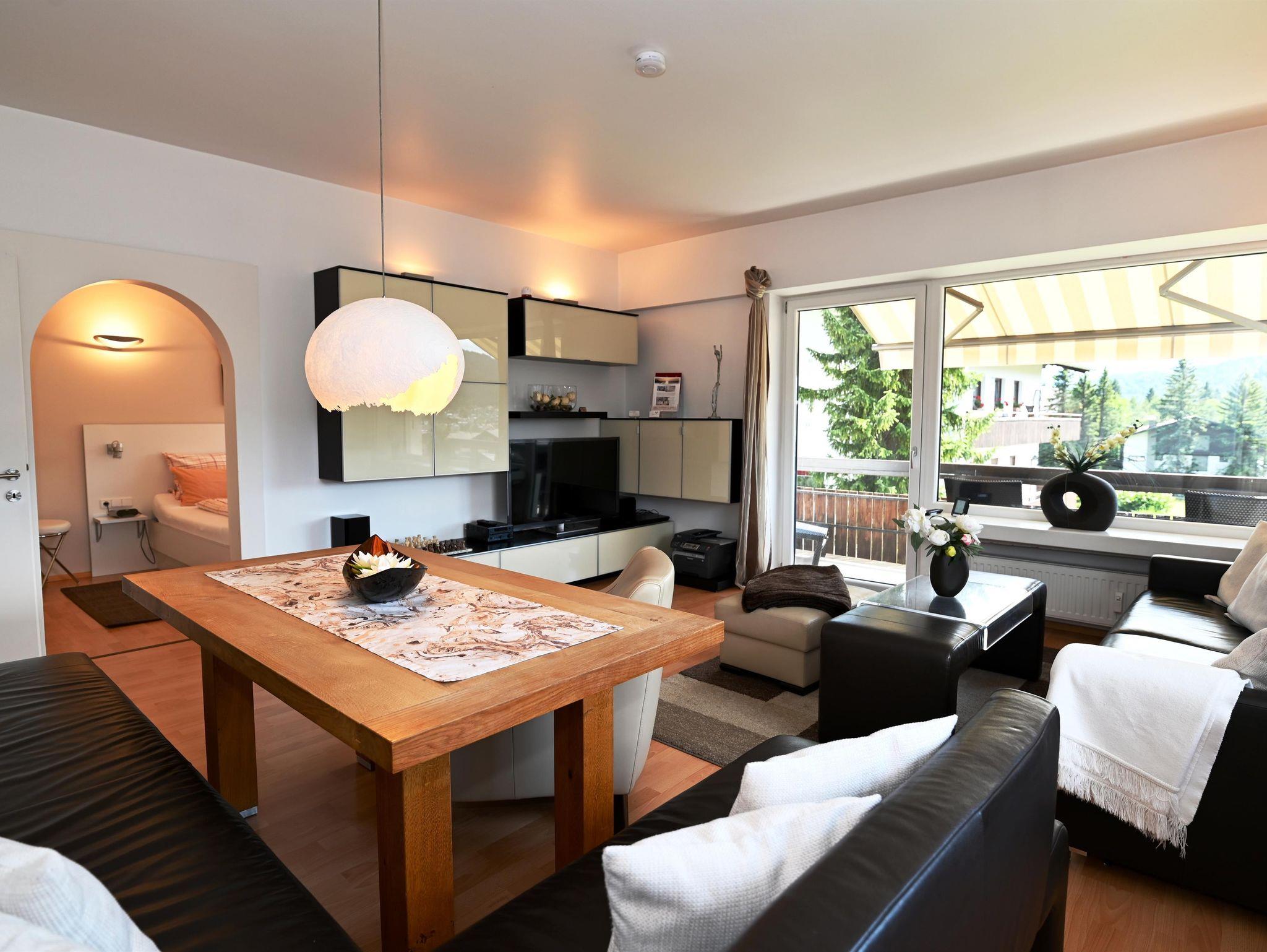 2-Zimmer-Luxus-Appartement***** (60 qm) mit 15 qm Südbalkon und gigantischem Ausblick auf Seefeld und die Alpen, hochwertige Ausstattung, Wohnzimmer mit einem großem Essbereich und einem Ledersofa – in dem noch ein zusätzliches Doppelbett integriert ist sowie neustem technischen Equipment: 2 LED-TV, Laptop, Fax, kostenlosem Internetzugang (WLAN), separates Schlafzimmer mit extrabreitem (2,20 m) Bett , geräumigen Schrank, hochmodernes Bad mit übergroßer Raindance-Dusche, vollausgestatte Küche.