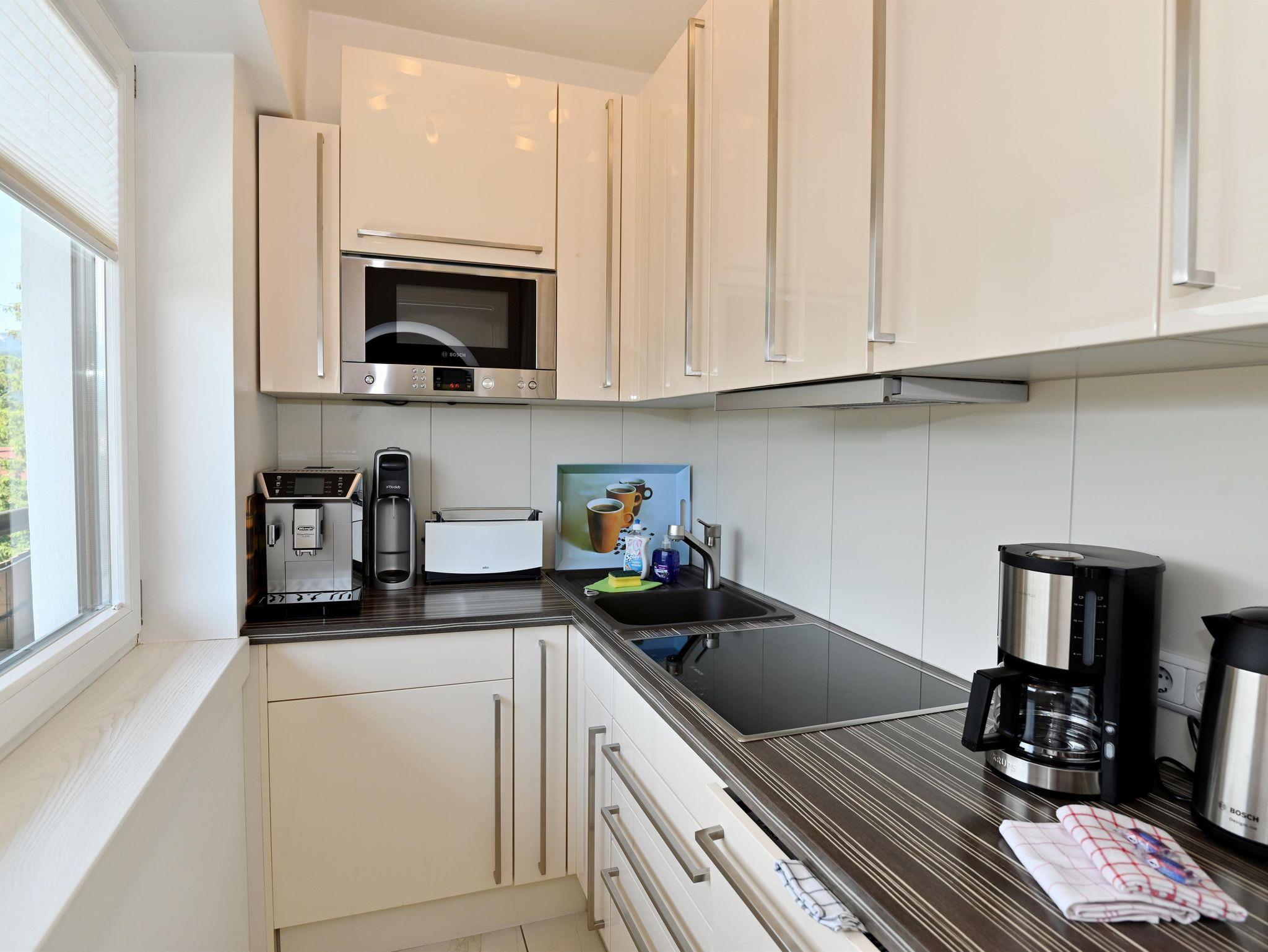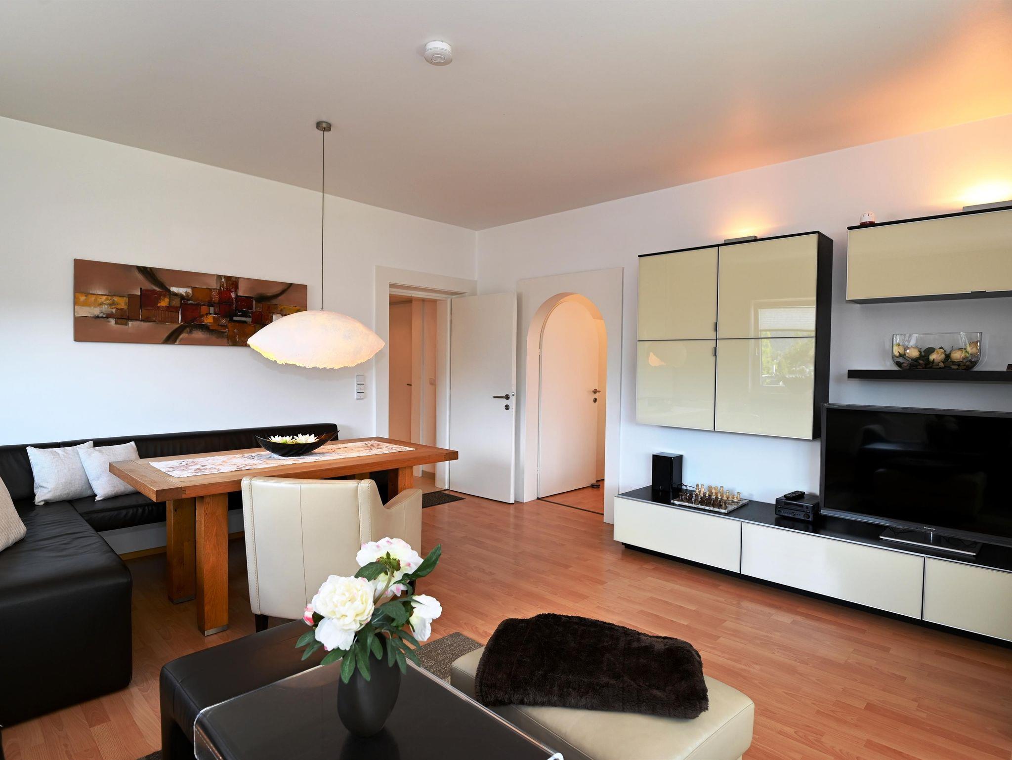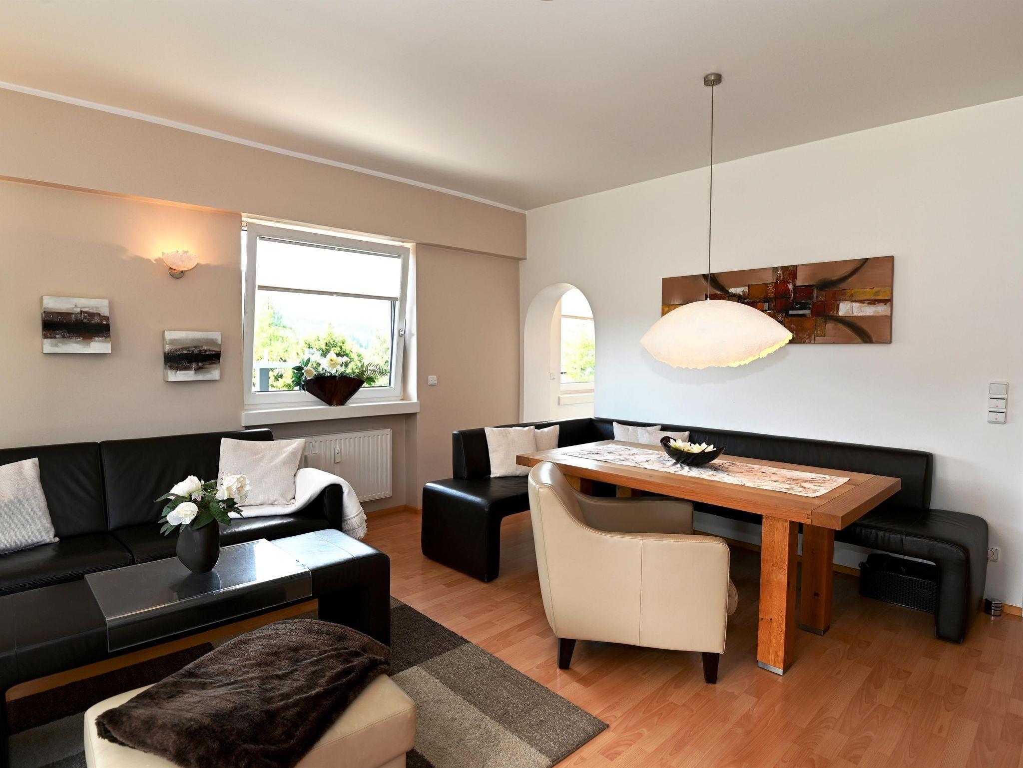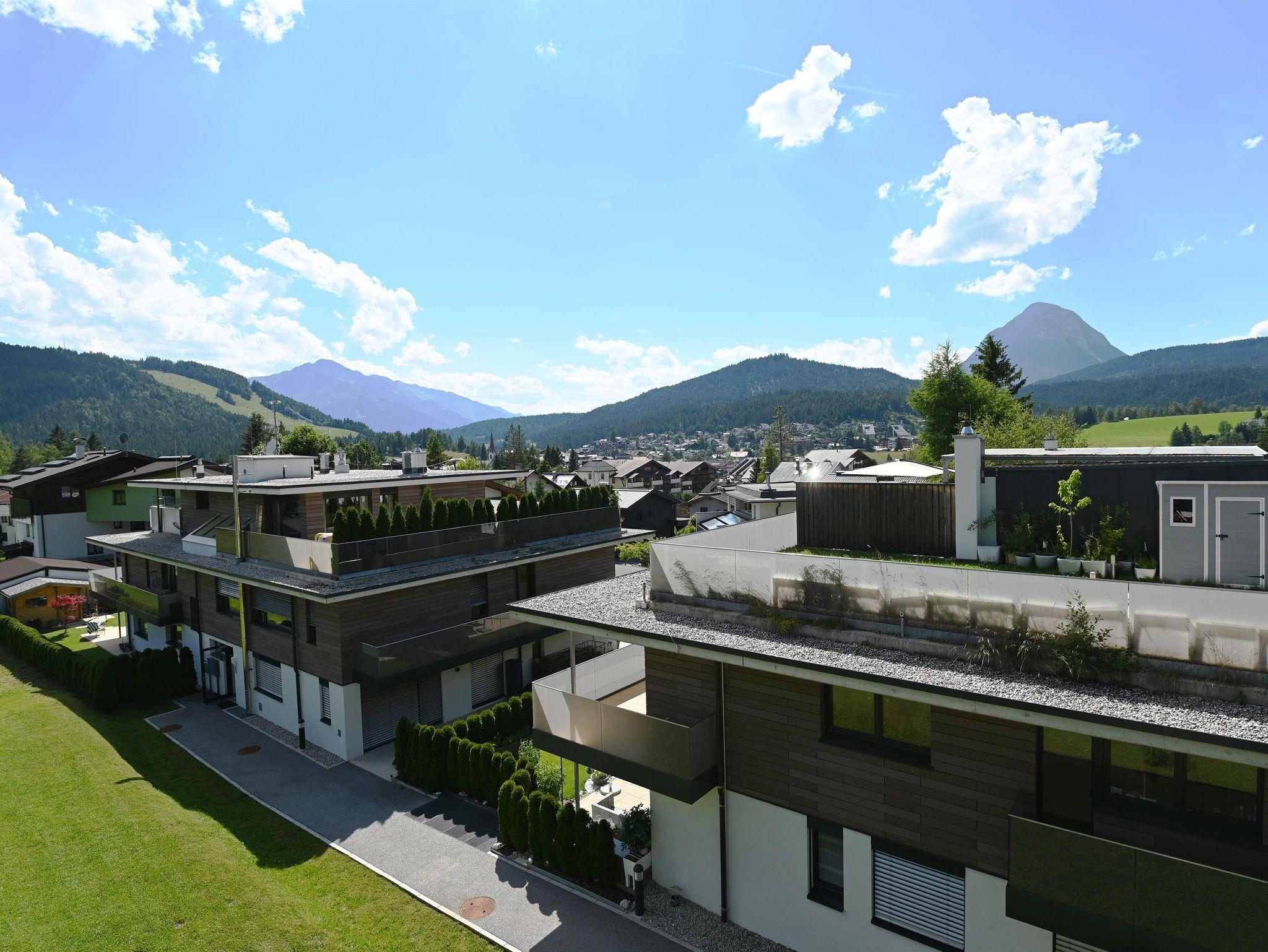 2-Zimmer-Luxus-Appartement***** (60 qm) mit 15 qm Südbalkon und gigantischem Ausblick auf Seefeld und die Alpen, hochwertige Ausstattung, Wohnzimmer mit einem großem Essbereich und einem Ledersofa – in dem noch ein zusätzliches Doppelbett integriert ist sowie neustem technischen Equipment: 2 LED-TV, Laptop, Fax, kostenlosem Internetzugang (WLAN), separates Schlafzimmer mit extrabreitem (2,20 m) Bett , geräumigen Schrank, hochmodernes Bad mit übergroßer Raindance-Dusche, vollausgestatte Küche.