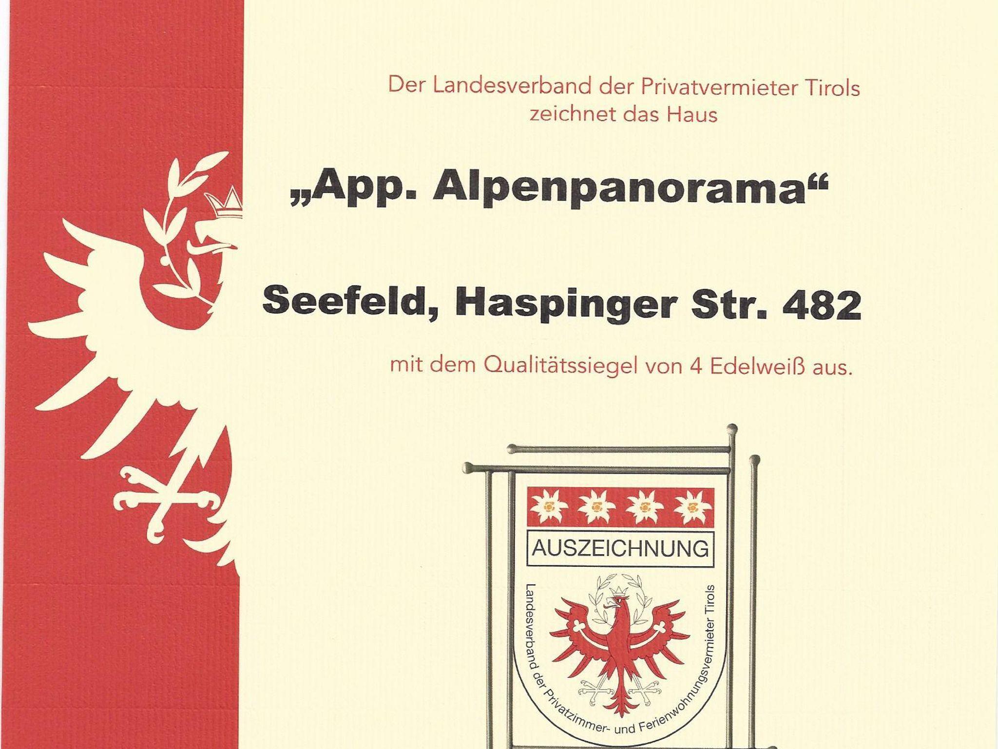 2-Zimmer-Luxus-Appartements***** Alpenpanorama und Alpenblick ( je 65 qm) mit je 15 qm Süd-Südwestbalkon und traumhaften Ausblick auf Seefeld und die Alpen, hochwertige moderne Ausstattungen, Wohnzimmer mit einem großem Essbereich und einem Leder/Designersofa – in dem noch ein zusätzliches Doppelbett(1,80 cm) integriert ist sowie neustem technischen Equipments: 2 LED-TV, Laptops, Fax, Drucker, Skype, kostenlosen Internetzugängen (WLAN), separate Schlafzimmer mit extrabreitem (2,20 m) Bett, geräumigen begehbare Schränke, hochmoderne Bäder mit übergroßer Raindance-Dusche und Badewanne, abgetrennte WC´s, vollausgestatte Küchen, Flur und Abstellraum. Die Appartements liegen absolut ruhig am Ende einer Sackgasse und dennoch zentral! Hauseigene Parkplätze! Tägl. Brot- oder Brötchen-Lieferung! Kinder unter 6 Jahre sind kostenlos. Hunde willkommen! Die beiden Appartements liegen Tür an Tür auf einer Etage und können über den Balkon verbunden werden, sodass ein großer 25 qm Balkon entsteht - daher eignen sie sich auch für mehrere oder größere Familien, die zusammen reisen möchten. Bis zu den Restaurants, Fußgängerzone, Olympiafun- und wellnesbad, Wildsee Skischulen, Liften, Loipen, Rad-, und Spazierwegen sowie zum Skibus (50 m) sind es nur ca. 300 Meter. Ausstattungen: Küchen: voll ausgestattete Einbauküche mit Mikrowelle, Spülmaschine, Backofen, Dunstabzug, Cerankochfeld und Kühlschrank mit Gefrierfach, Kaffeemaschine, Toaster, Wasserkocher, Sodamaschine... Schlafzimmer: mit sehr breitem Doppelbett (Kingsize) (2,20 m breit) und geräumigem Schrank, Radiowecker, Safe und zusätzlichem LED-TV. Wohnzimmer: mit Kabelfernsehen, LED-TV, DVD und CD, Computer mit kostenlosem W-Lan, Skype, Fax und Leder/Designergarnitur mit zusätzlich integriertem Doppelbett (1,80 m breit) für 2 zusätzliche Schlafgelegenheiten, großzügiger Essbereich, Anrichte mit CD´s, DVD´s, Bibliothek, Gesellschaftsspielen und Kinderspielzeug. Bäder: mit Rain-Dance-Dusche und Badewanne, abgetrennten WC, Handtuchwärmer, beleuchteter Doppelwaschtisch, Schrank, und Fön Süd-Südwestbalkon: 15 m² mit Markise, 2 Liegestühlen, 1 Tisch und 4 Stühlen, Elektrogrill Abstellraum: große offene Garderobe für Wintermäntel, Skianzüge, Kletterausrüstung, Schuhe und Platz für Koffer, Ganzkörperspiegel etc. Im Untergeschoss befindet sich ein Abstellplatz für Ski-und Fahrräder. Baby-/Kleinkindausstattung: auf Wunsch steht ein Kinderbettchen (60 x 120 cm) mit Bettwäsche sowie ein verstellbarerer Kinderhochstuhl und Kindergeschirr zur Verfügung. Direkt am Haus befinden sich ausreichend Parkplätze. Nichtraucherwohnung - auf dem Balkon kann geraucht werden.