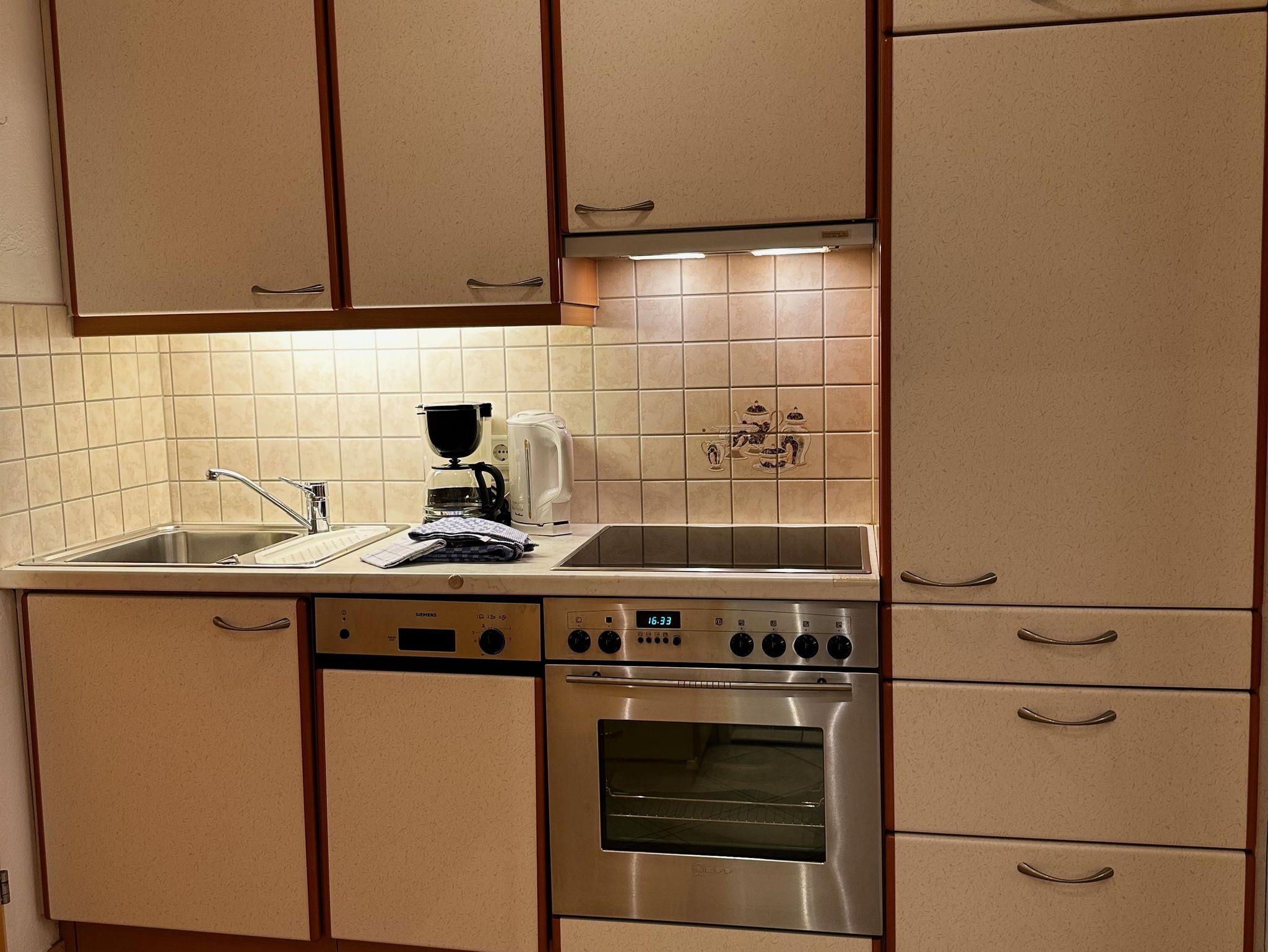 Das etwa 35 m² große Appartement ist ideal für bis zu 2 Personen und bietet einen kombinierten Wohn- und Schlafbereich, eine Küchenzeile, ein Badezimmer und einen Balkon.