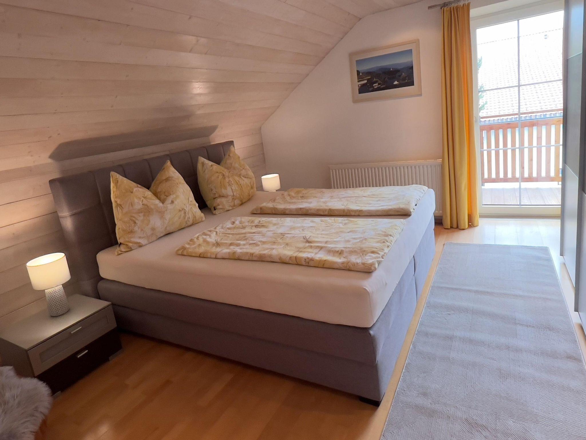 Komfort im 2. Stock: Hauptschlafzimmer mit Vorraum und Babybett, Zugang zum zweiten Südbalkon. Zweites Schlafzimmer – perfekt für Familien. Zusätzliches WC im Obergeschoss.