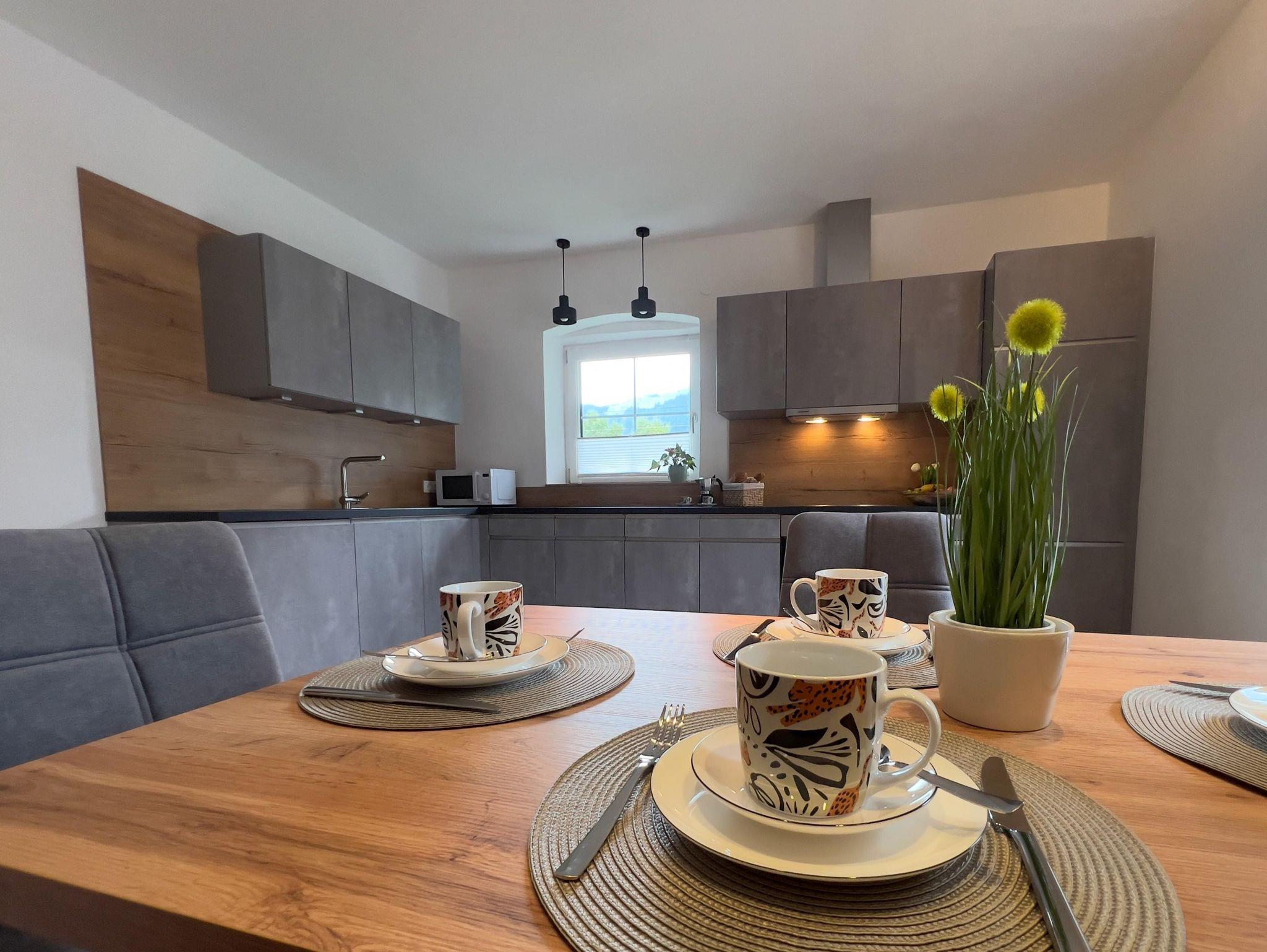 Highlights im 1. Stock: Sehr gut ausgestattete offene Küche mit Wohn-/Essbereich. Südbalkon mit Blick auf Garten, Berge und Golfplatz. Gemütliches Wohnzimmer mit Doppelcouch, Glasfaser-TV und schnellem Internet. Badezimmer mit Bad/Dusche, Doppelwaschbecken und Waschmaschine. Getrenntes WC.