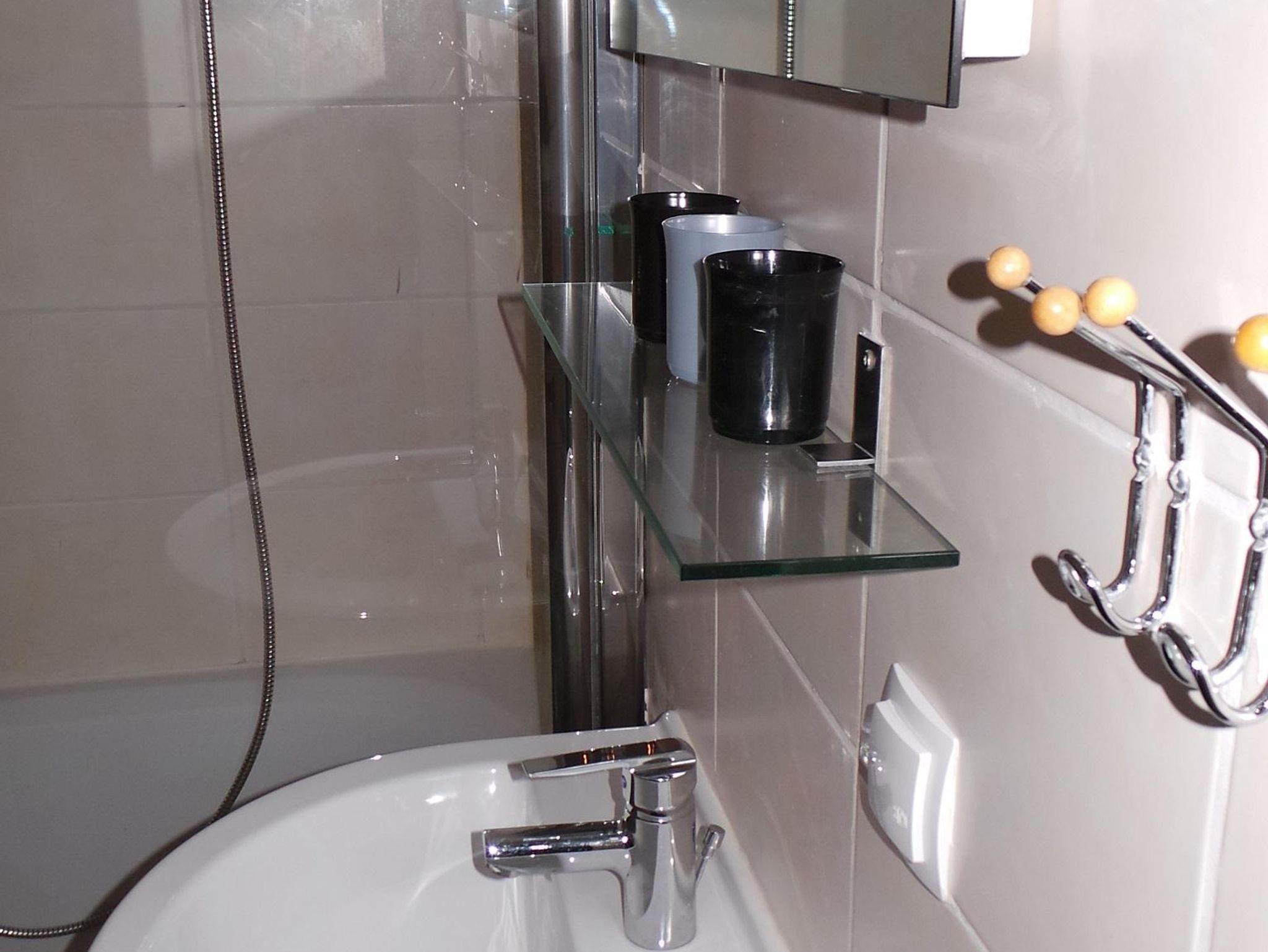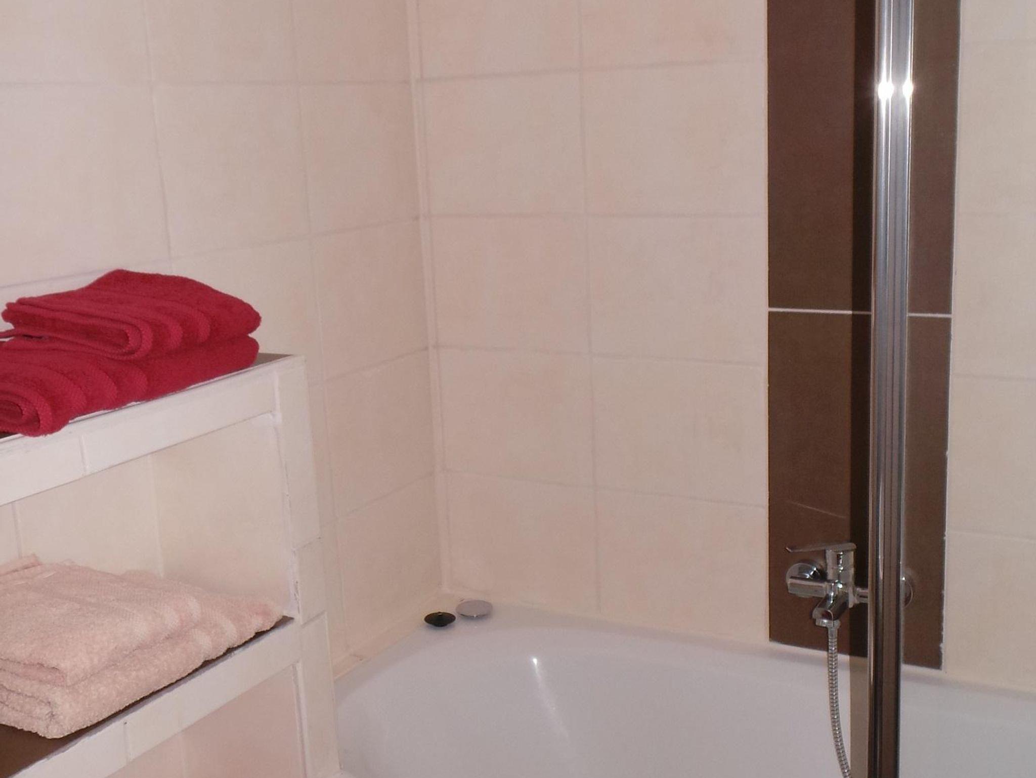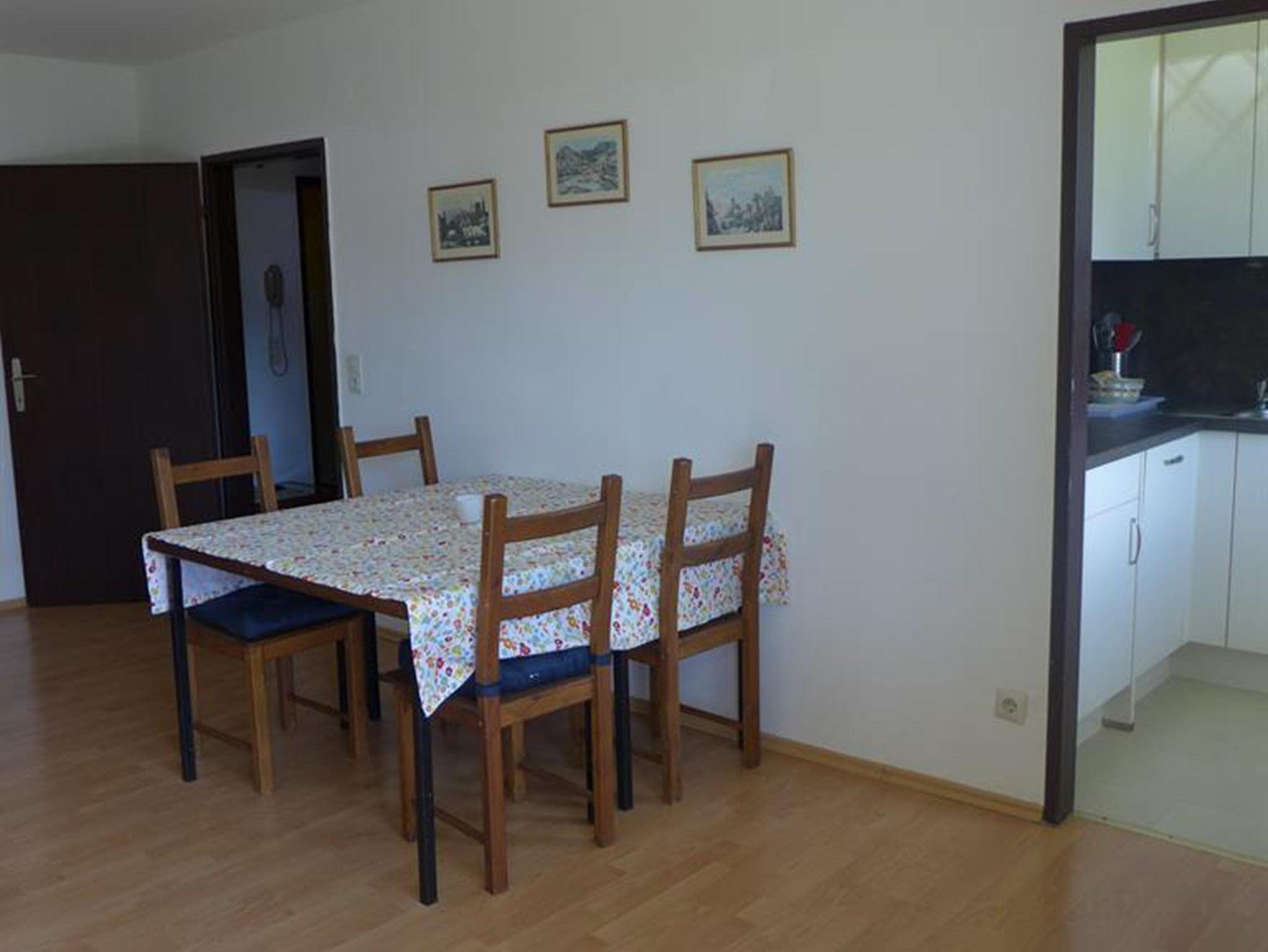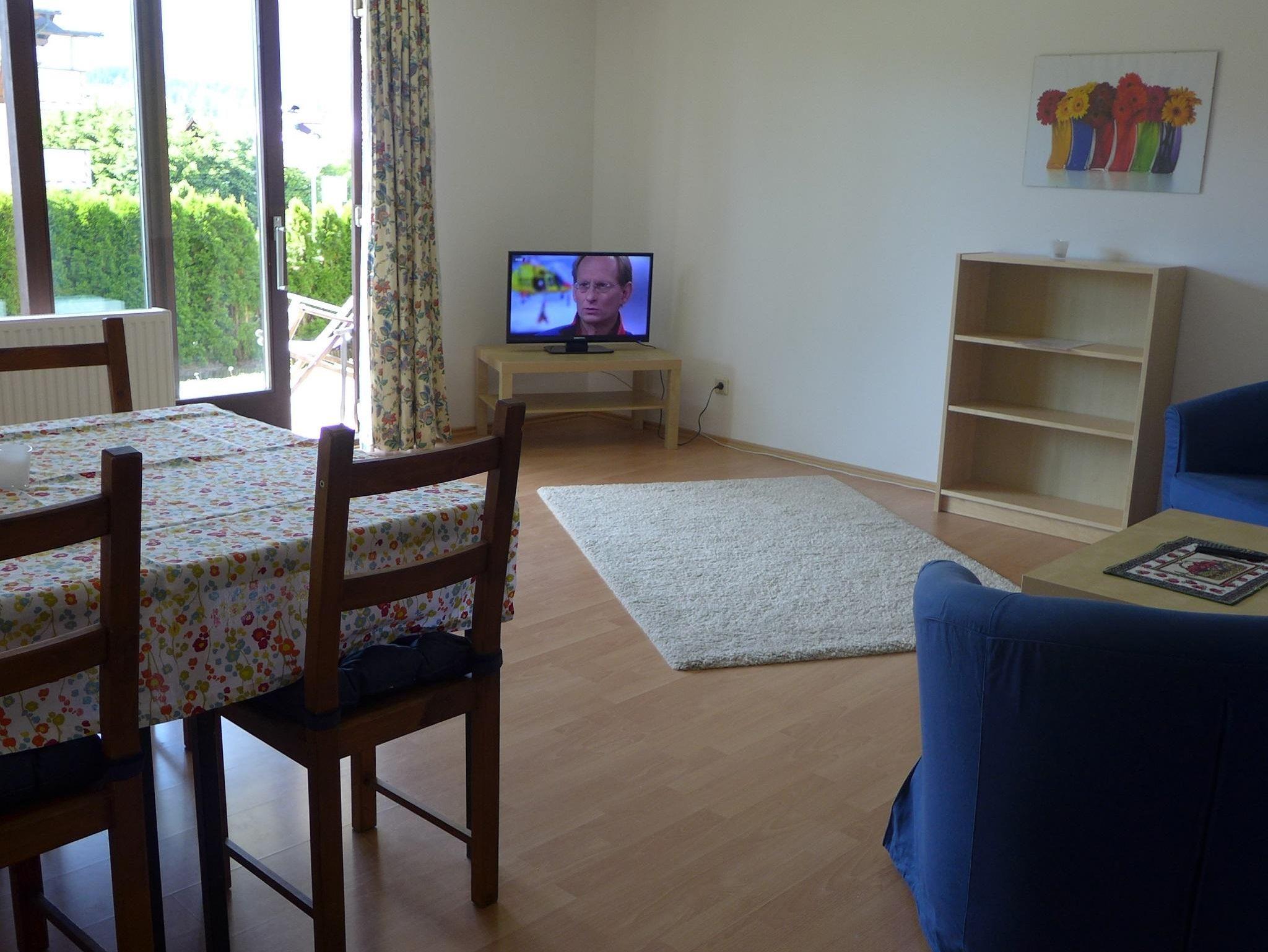 Das Apartment (55m²) im Erdgeschoß, besteht aus einem Eingangsbereich, einem Schlafzimmer mit einem Doppelbett und einem Stockbett, einem Wohnzimmer mit einem Schlafsofa, Esstisch, Kabelfernseher und W-LAN. Die neue separate Küche ist mit einer Spülmaschine, Ceranfeld, Backofen, Kühlschrank mit Gefrierfach ausgestattet. Das Badezimmer hat eine Badewanne mit Duschwand. Durch die Glasfront gelangen Sie direkt auf die Terrasse.