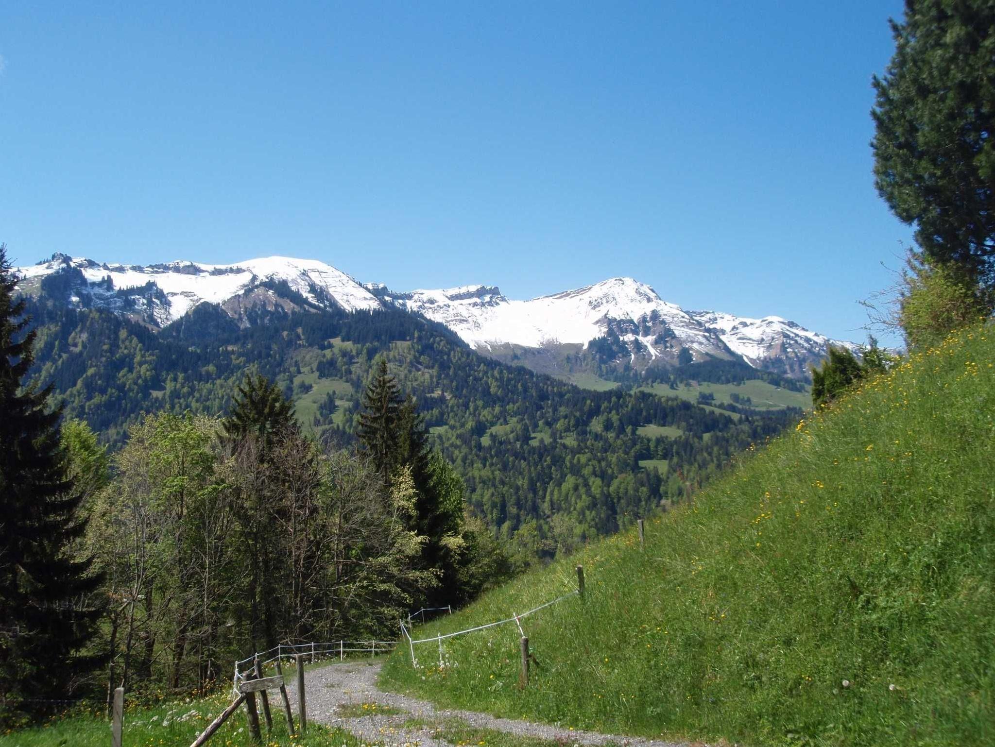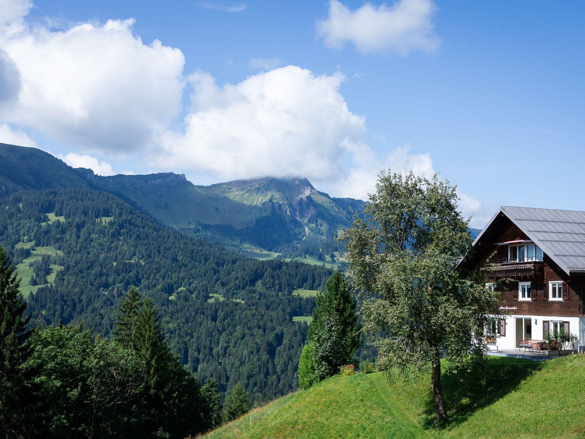 Vom Wohnbereich gelangen Sie auf eine großzügige Holzterrasse. Der ostseitige Blick richtet sich in die Morgensonne. Im Hintergrund sehen Sie die Gottesackerwände, den hohen Ifen, den Diedamskopf und auf der Terrasse auch den Bullerschkopf. Im Vordergrund blicken Sie auf die naheliegenden Wiesen und Alpen von Sibratsgfäll und Umgebung. Von Frühjahr bis in den Frühherbst können, grasende Kühe und Jungvieh Ihnen ein Gefühl von Urlaub auf der Alm verleihen.