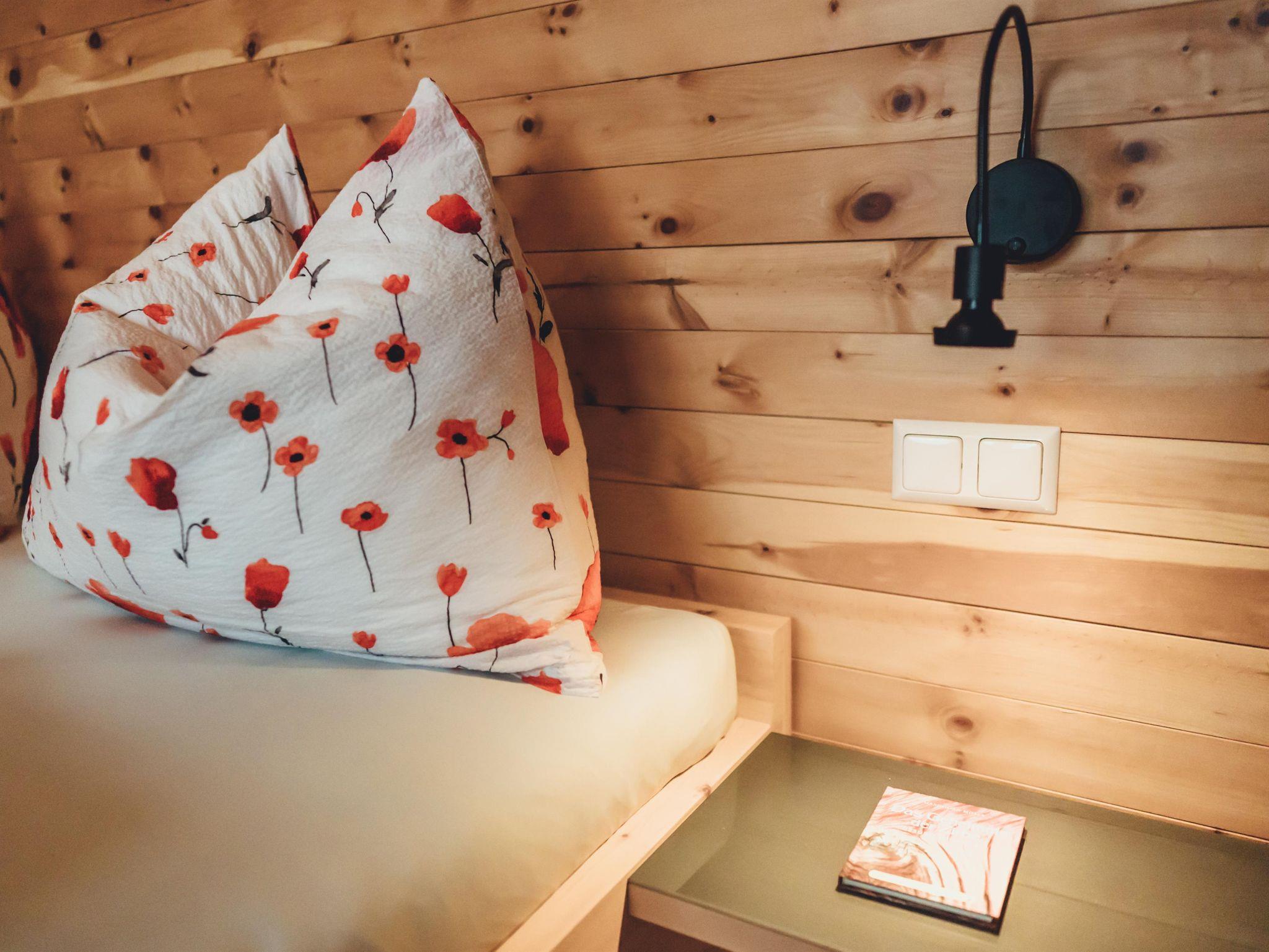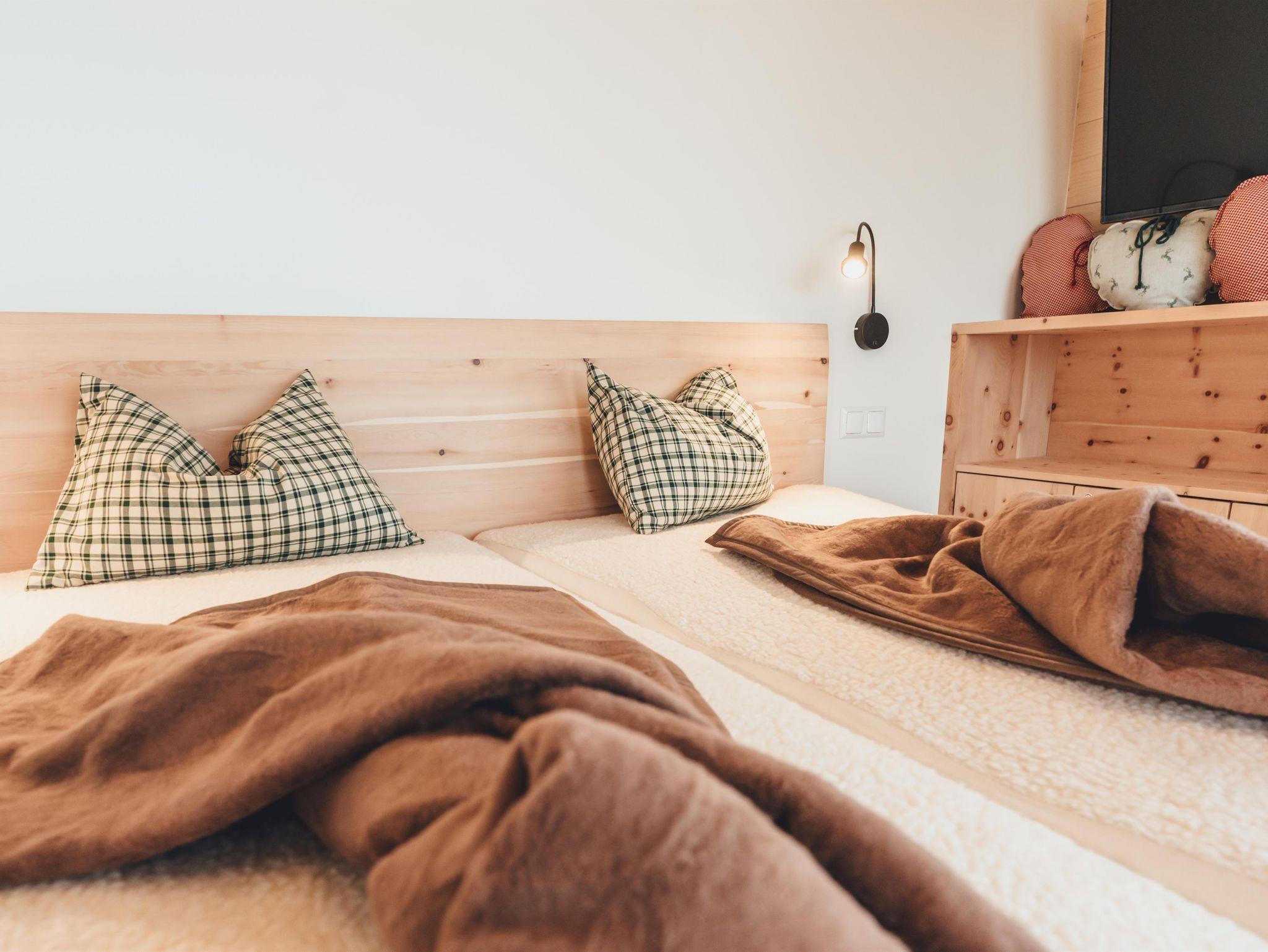 Unsere beliebte Sennerhütte mit einem Zirben-Doppelzimmer verspricht romantische Stunden auf der Alm. Vor allem für Paare ist diese Hütte ein bevorzugtes Refugium. Der private eingezäunte Garten mit Tisch, Bank und Liegestühlen bietet einen idyllischen Rückzugsort.