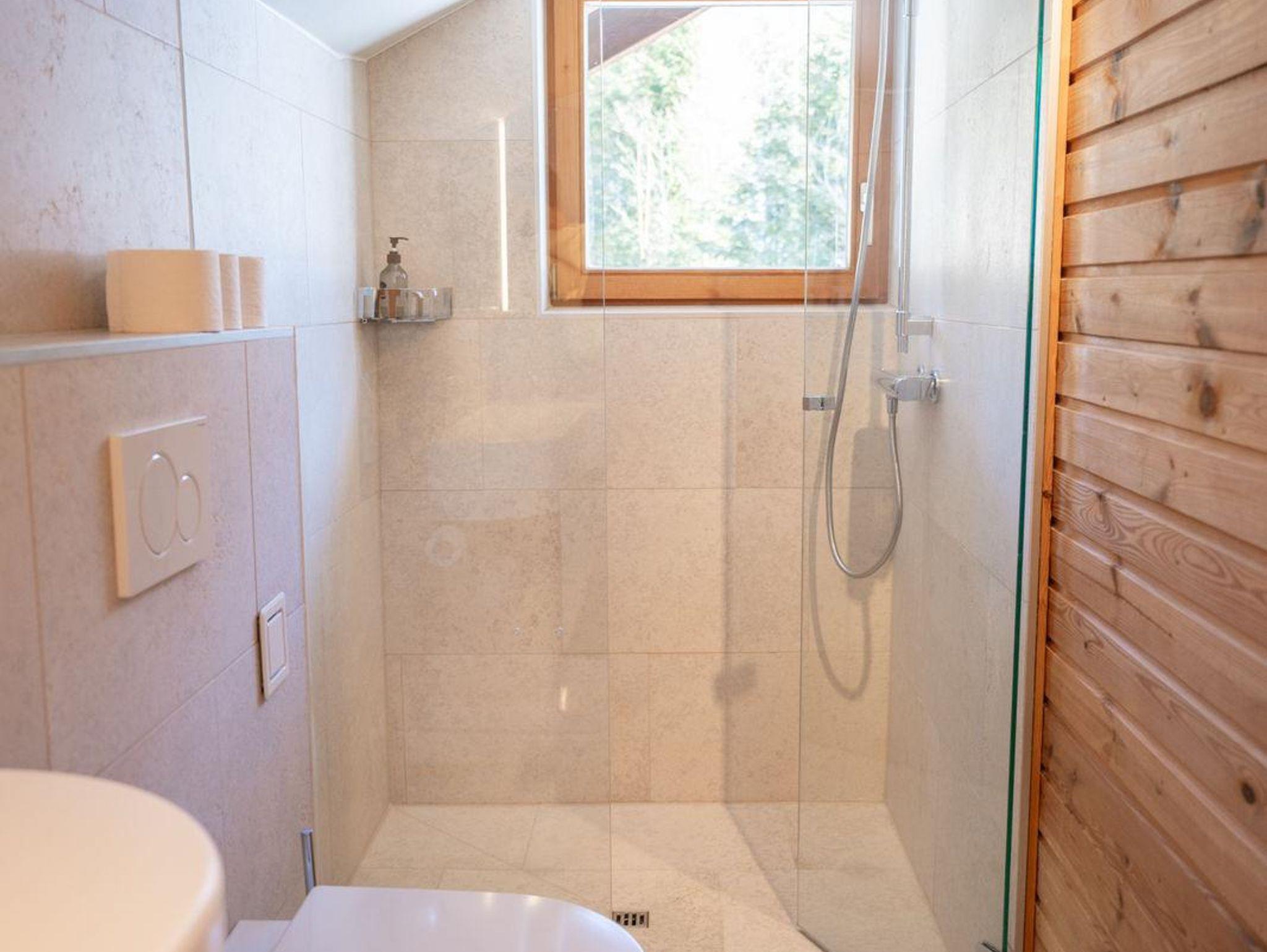 Außensauna mit Sitzbereich und Dusche