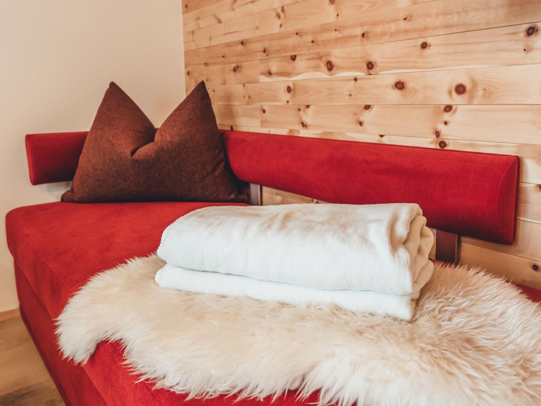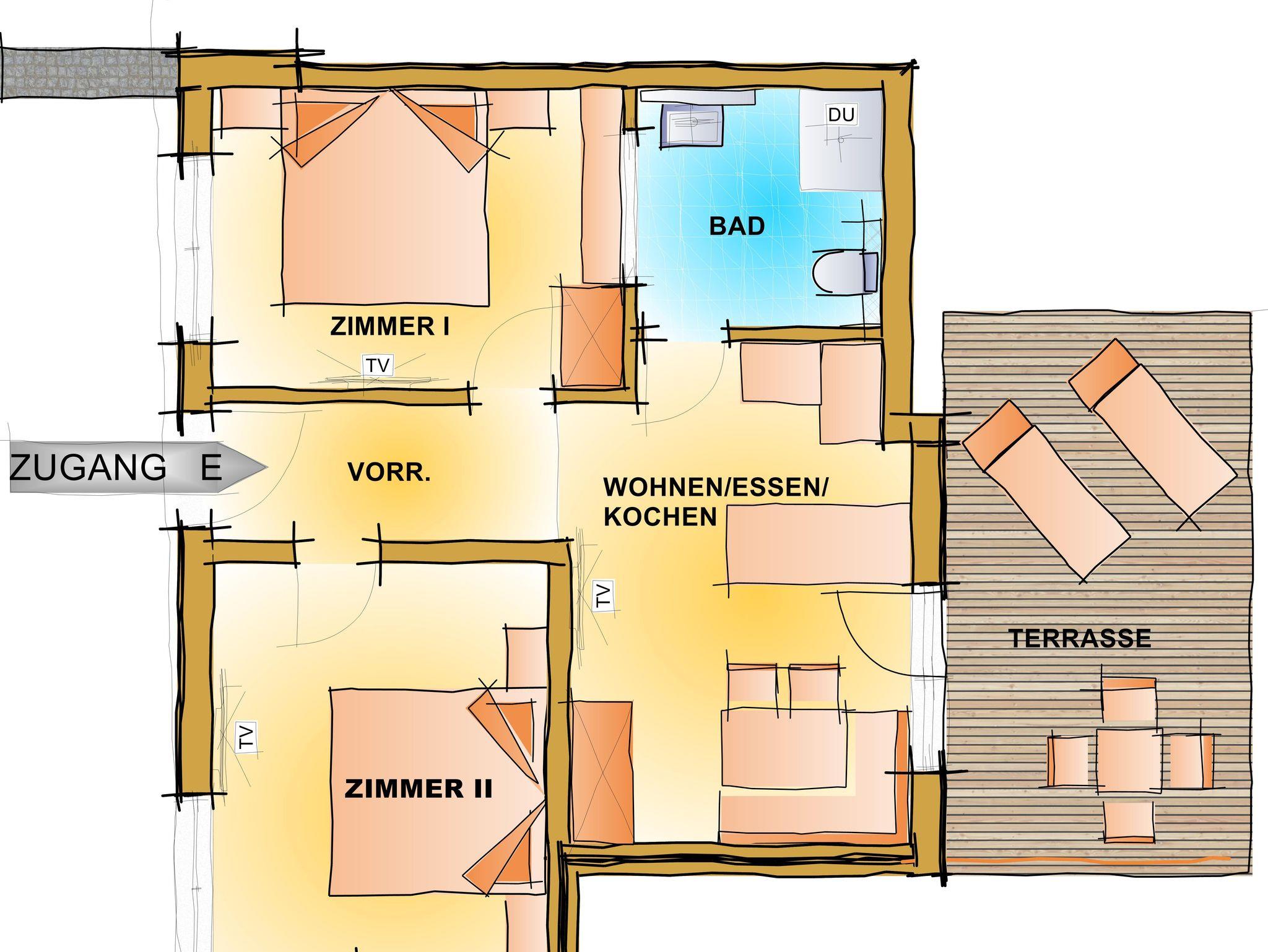 Zirben – Schlafzimmer Nr. 2 mit Doppelbett, Vorraum. Wohnküche mit Schlafcouch. Bad mit Dusche & WC. Sonnige Terrasse mit Sitzgelegenheit