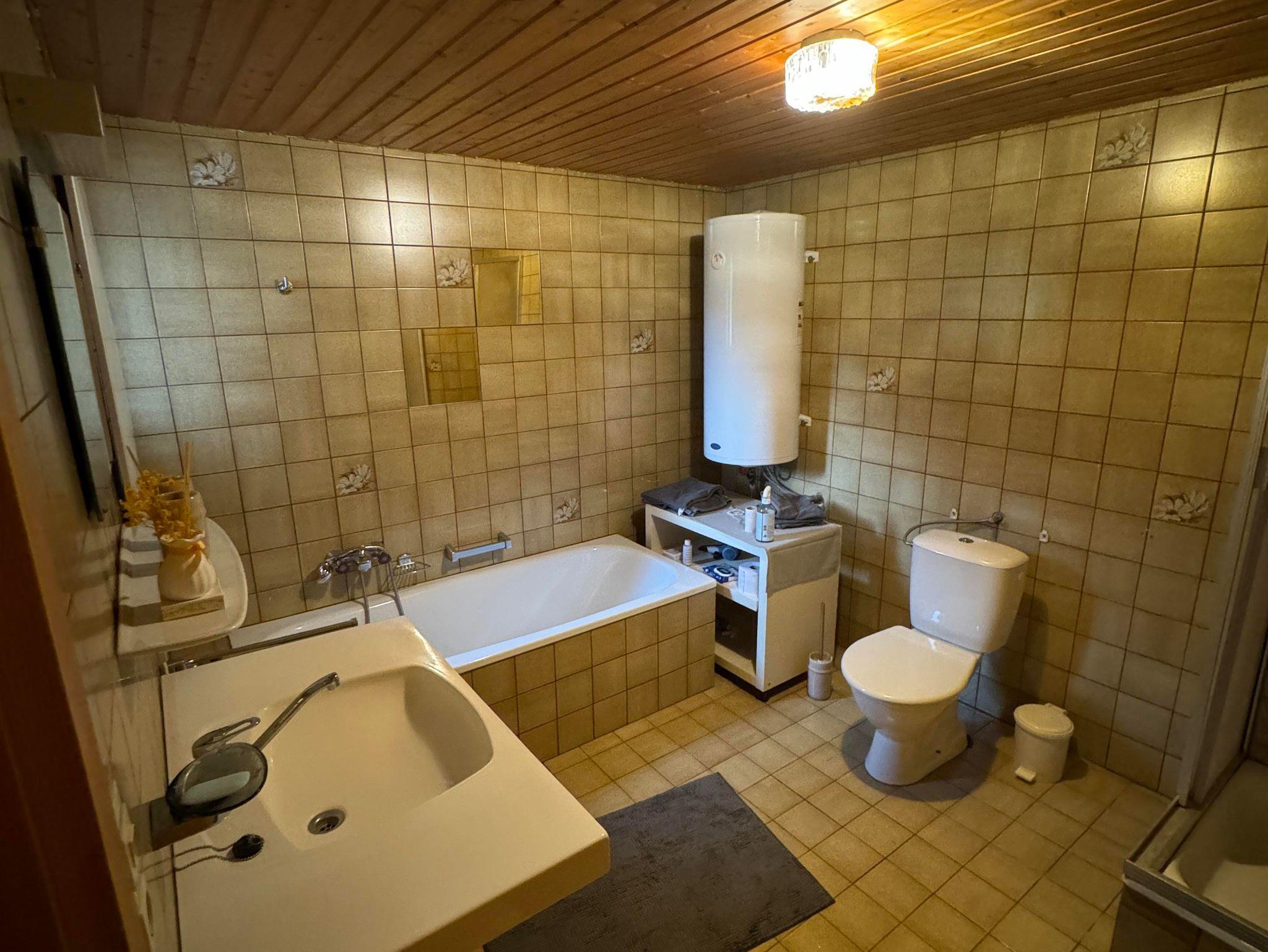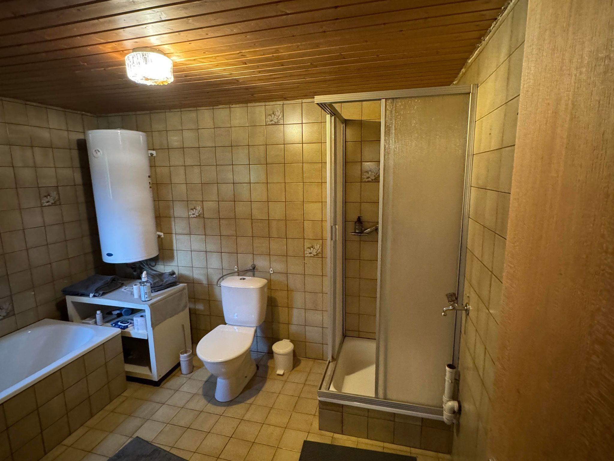 • Ein Badezimmer mit Badewanne, Dusche und WC. Handtücher und Bettwäsche sind inklusive.