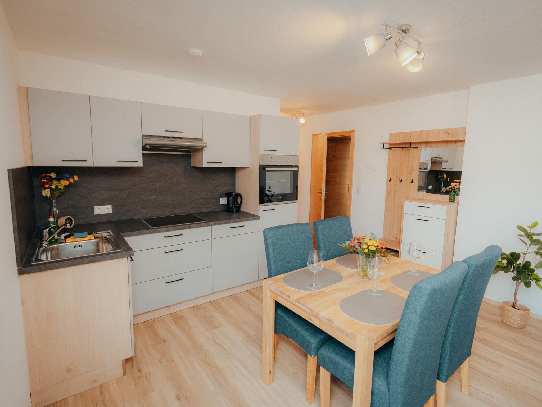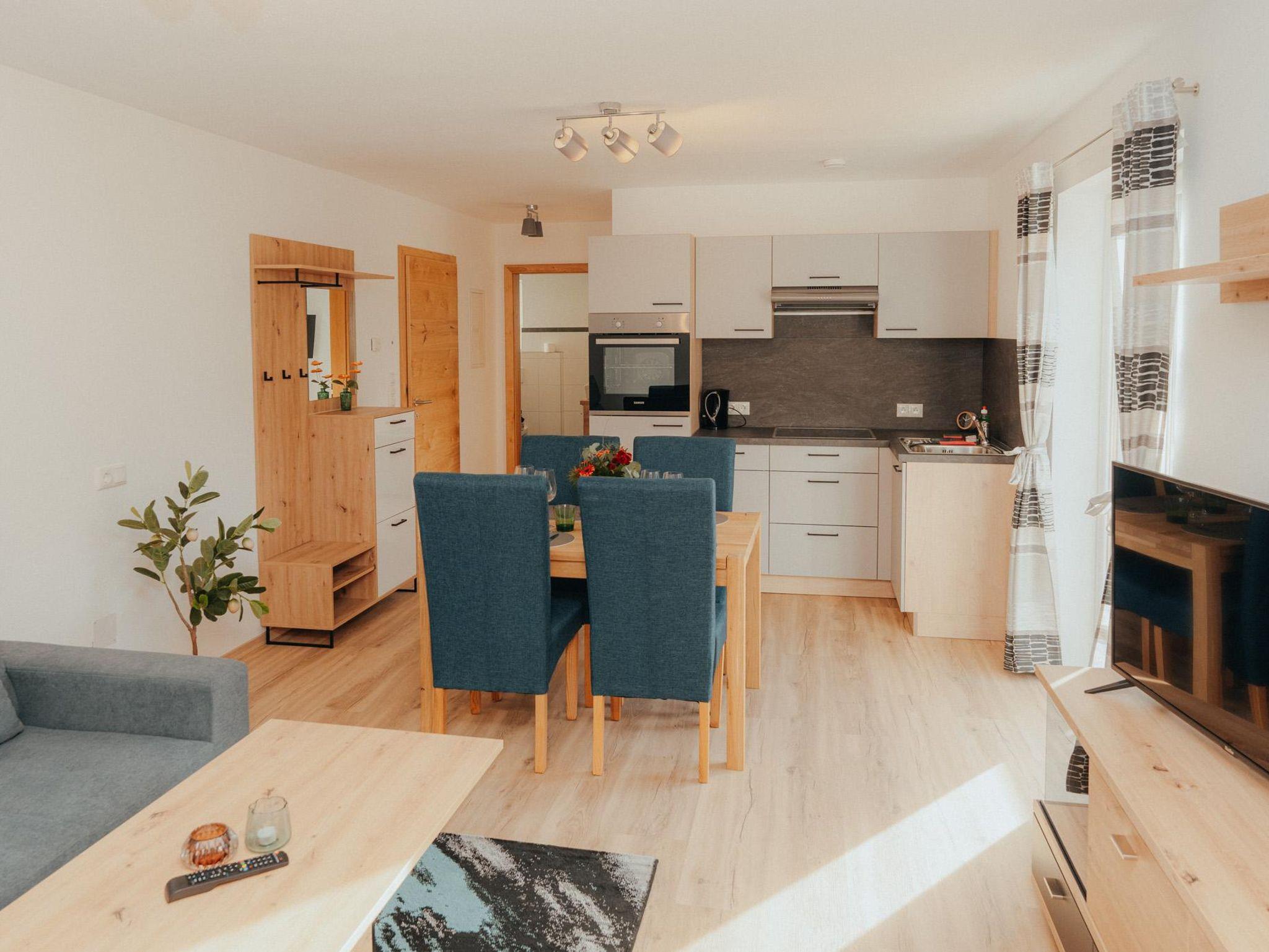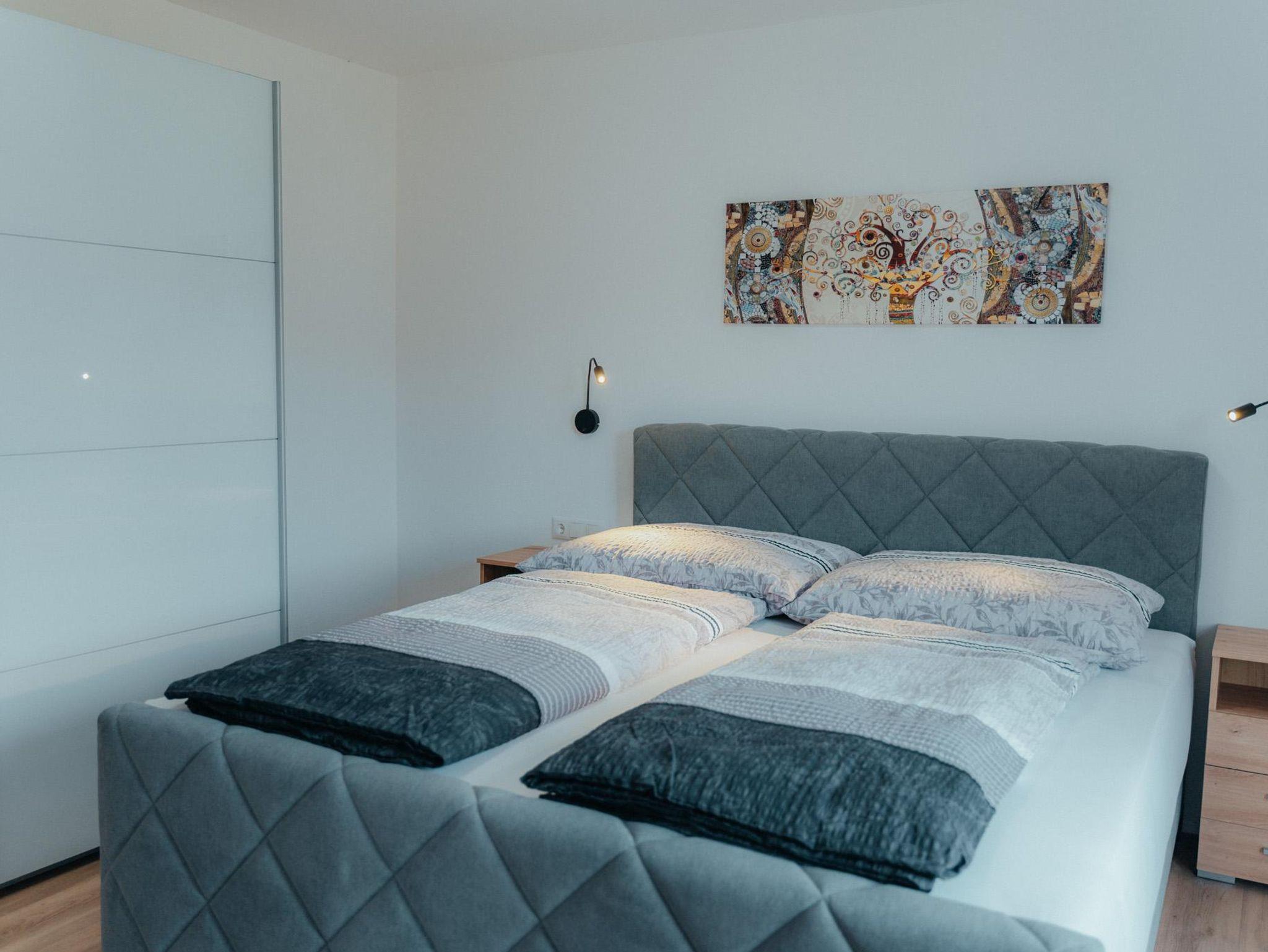 Die Wohnung hat eine Gesamtfläche von 58m² und ist in zwei Schlafzimmer mit Boxspringbetten und Kasten aufgeteilt. Es gibt auch eine Wohnküche mit einer Couch und einem Fernseher sowie einer Sitzgruppe für 4 Personen. Die Küche ist voll ausgestattet mit einem Kühlschrank, Geschirrspüler, E-Herd, Dunstabzug und anderen Geräten. Eine Garderobe ist ebenfalls vorhanden. Die gesamte Wohnung verfügt über eine Fußbodenheizung und einen großen Balkon mit Sitzmöglichkeiten. Das Badezimmer ist mit einer Dusche, einem WC und einem Handtuchtrockner ausgestattet.