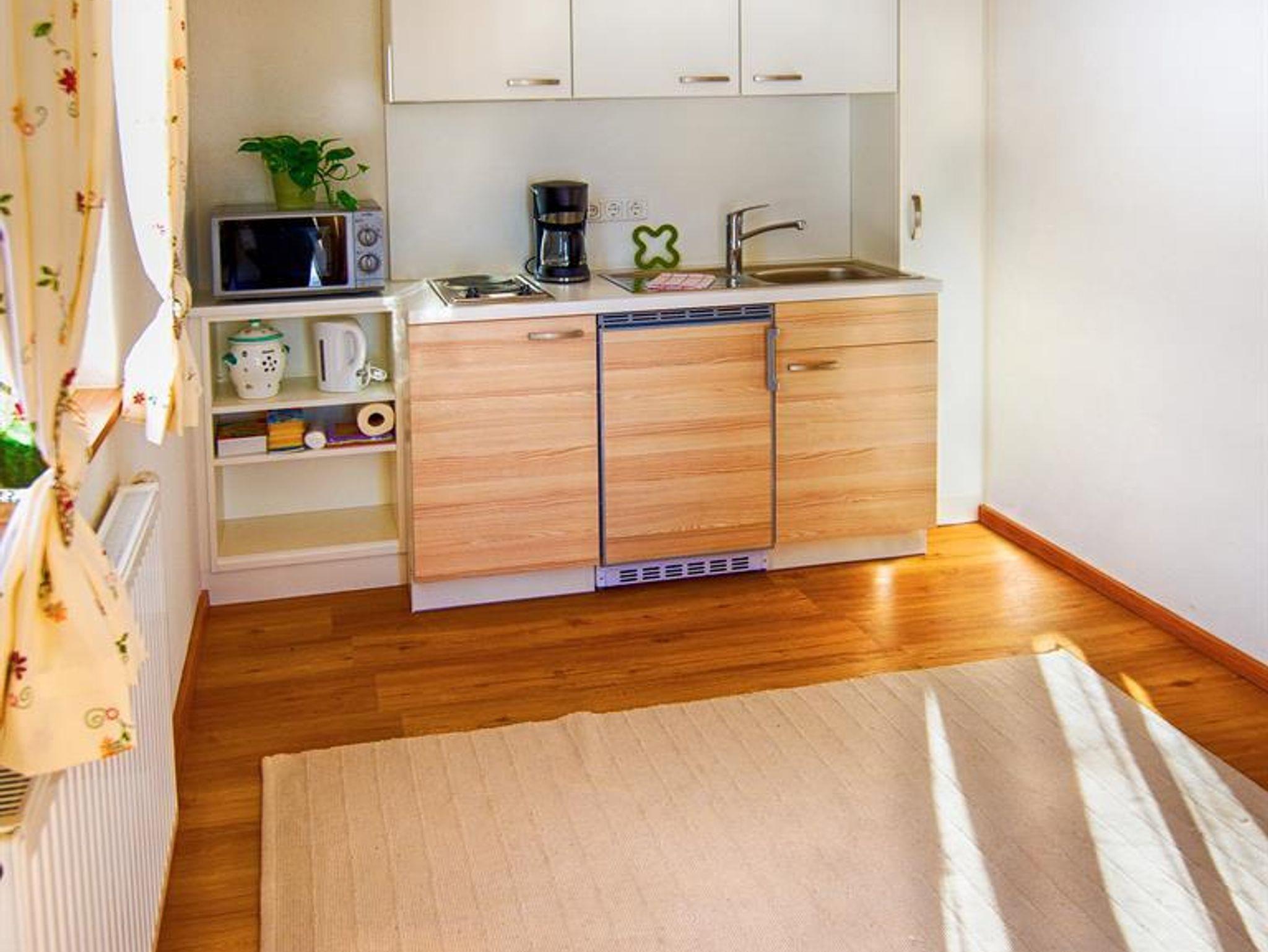 Landsommer gemütliche Stunden Unsere kleinste Ferienwohnung bietet Platz für 1-2 Personen. Sie liegt im Erdgeschoss des Gästehauses und ist ca. 30 m2 groß. Mit ihrer ansprechenden, hellen Einrichtung ist sie perfekt für erholsame Stunden zu zweit. Die Wohnung ist aufgeteilt in ein Schlafbereich mit DU/WC und einem kleinen Wohnraum mit Küchenblock. Allergiker geeignet. Genießen Sie die lauen Abende auf der kleinen Terrasse mit Blick in den Obstgarten.