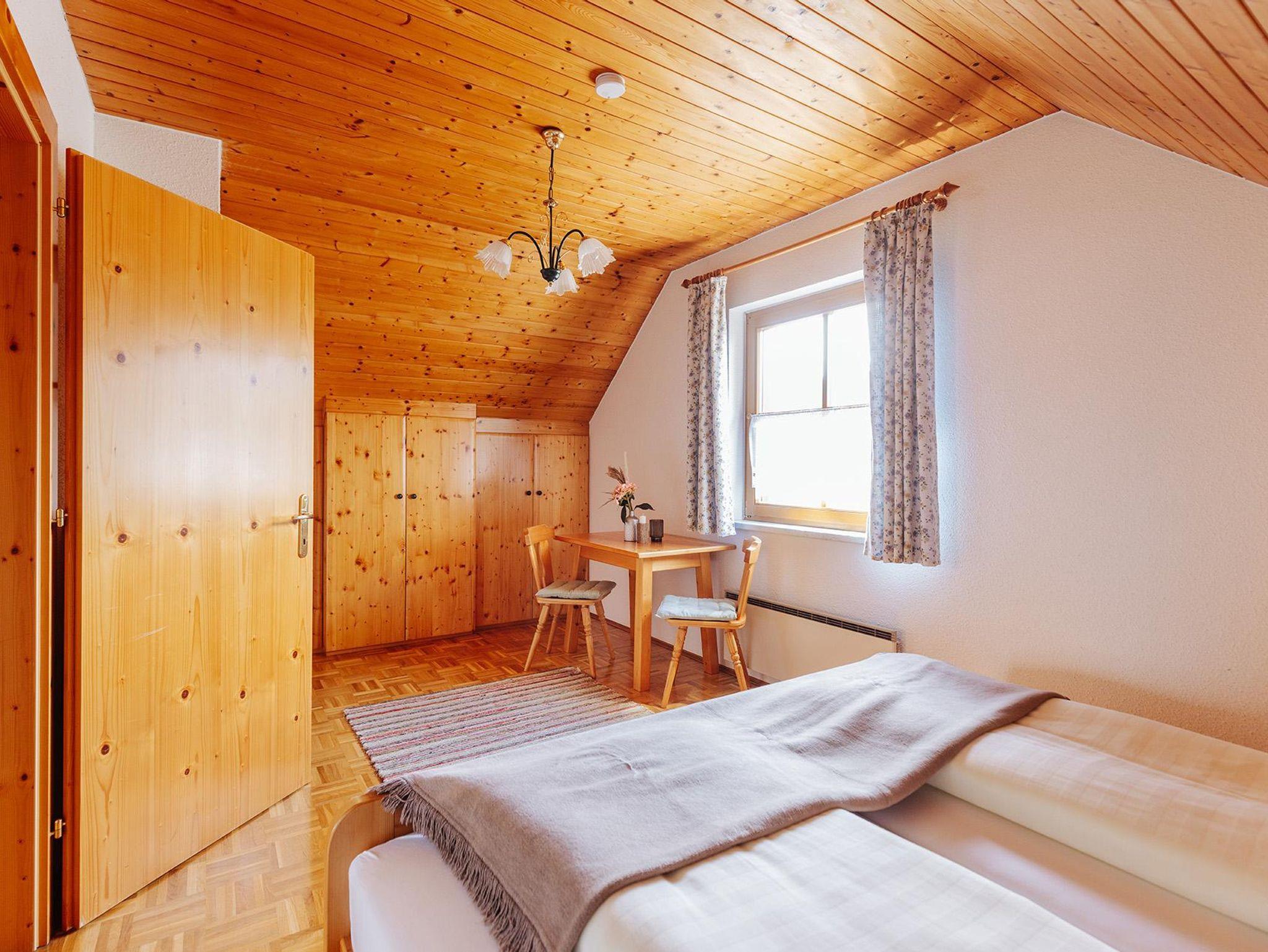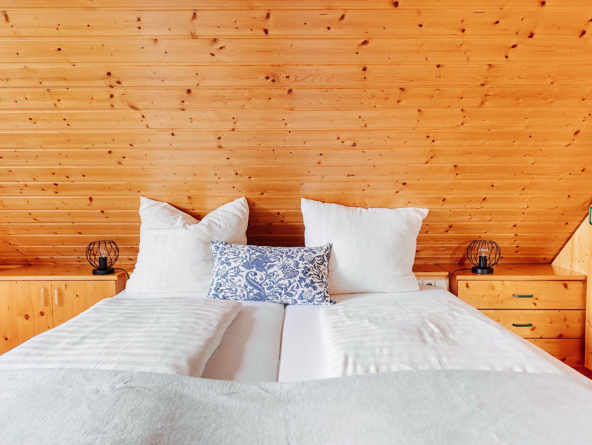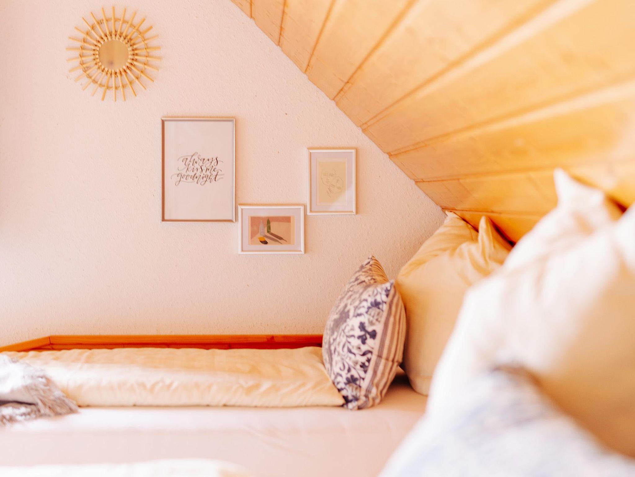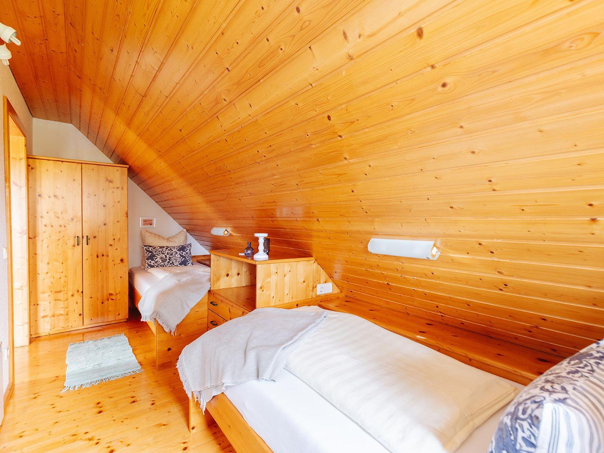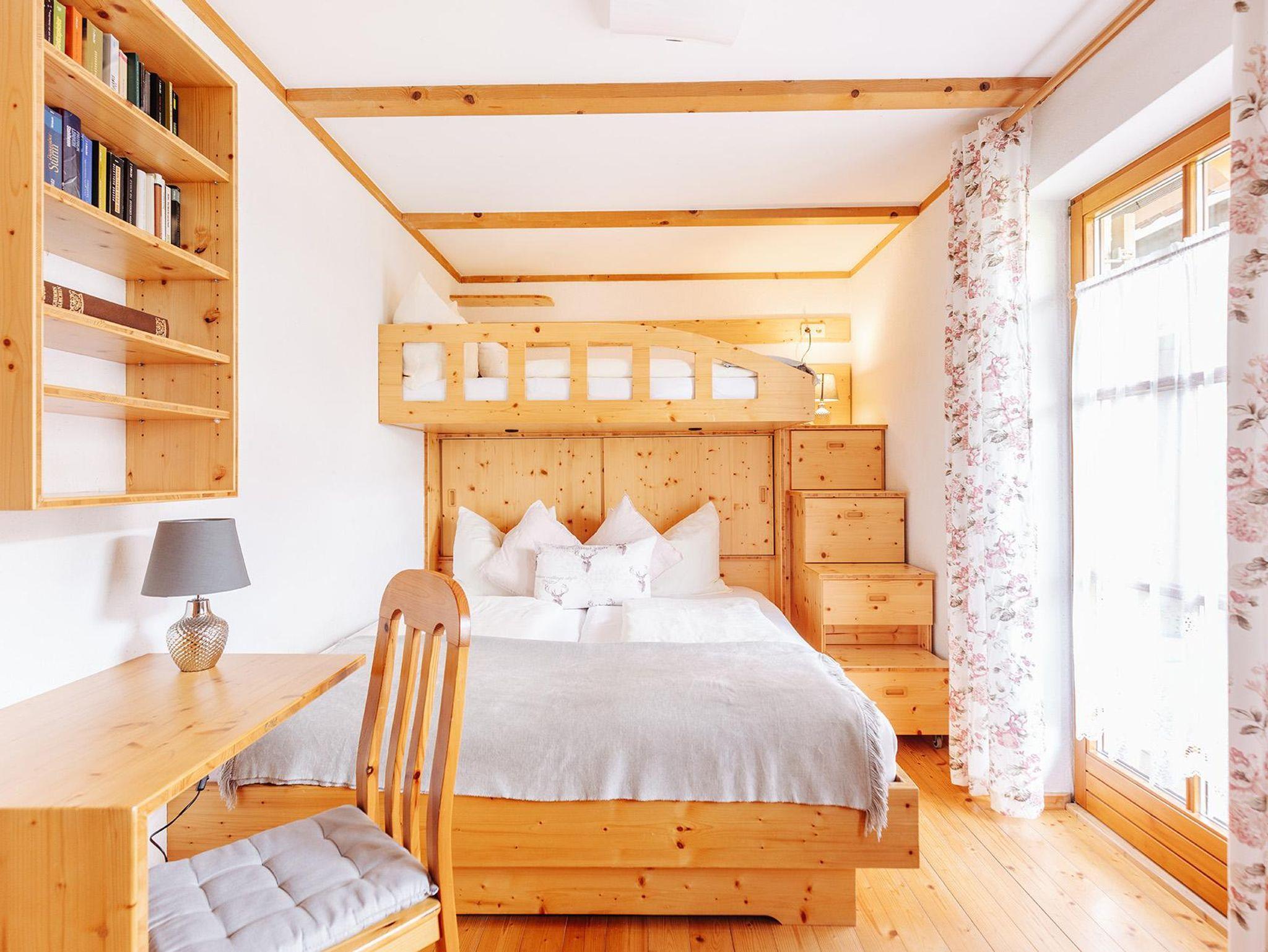 • Ein Schlafzimmer mit einem Doppelbett und einem Hochbett (140cm breite) mit Vollholzmöbel und Baumwollbettwäsche