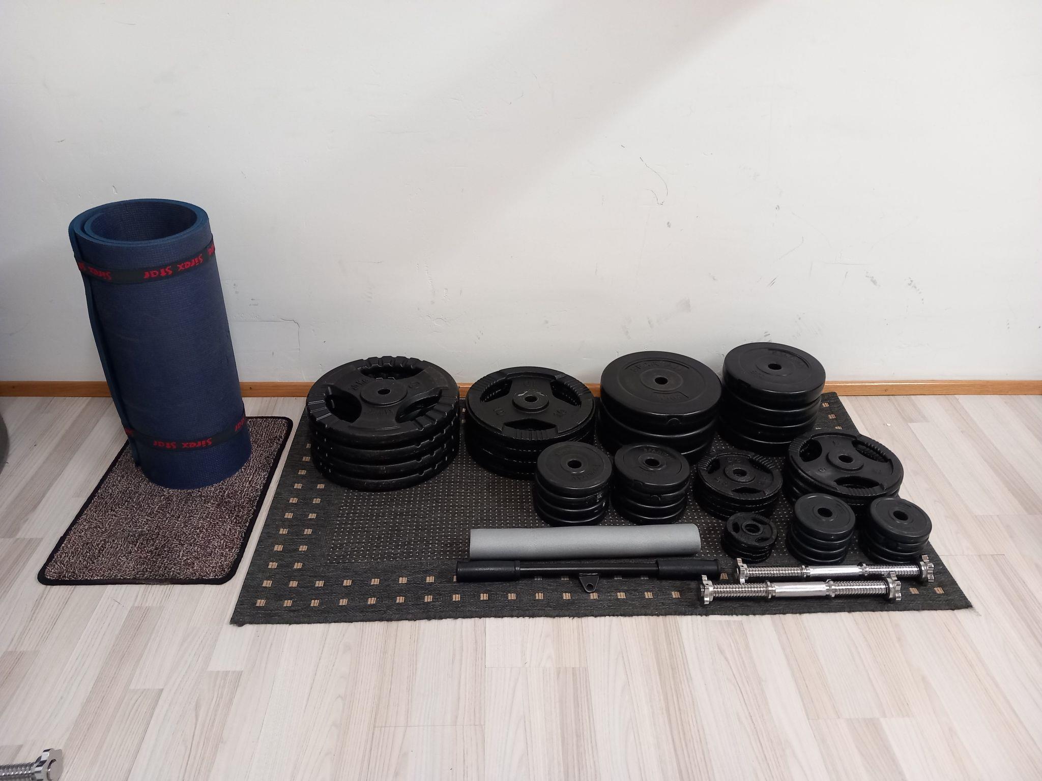 Training room with power rack incl. cable pulley, weight bench, weight discs and floor mat.