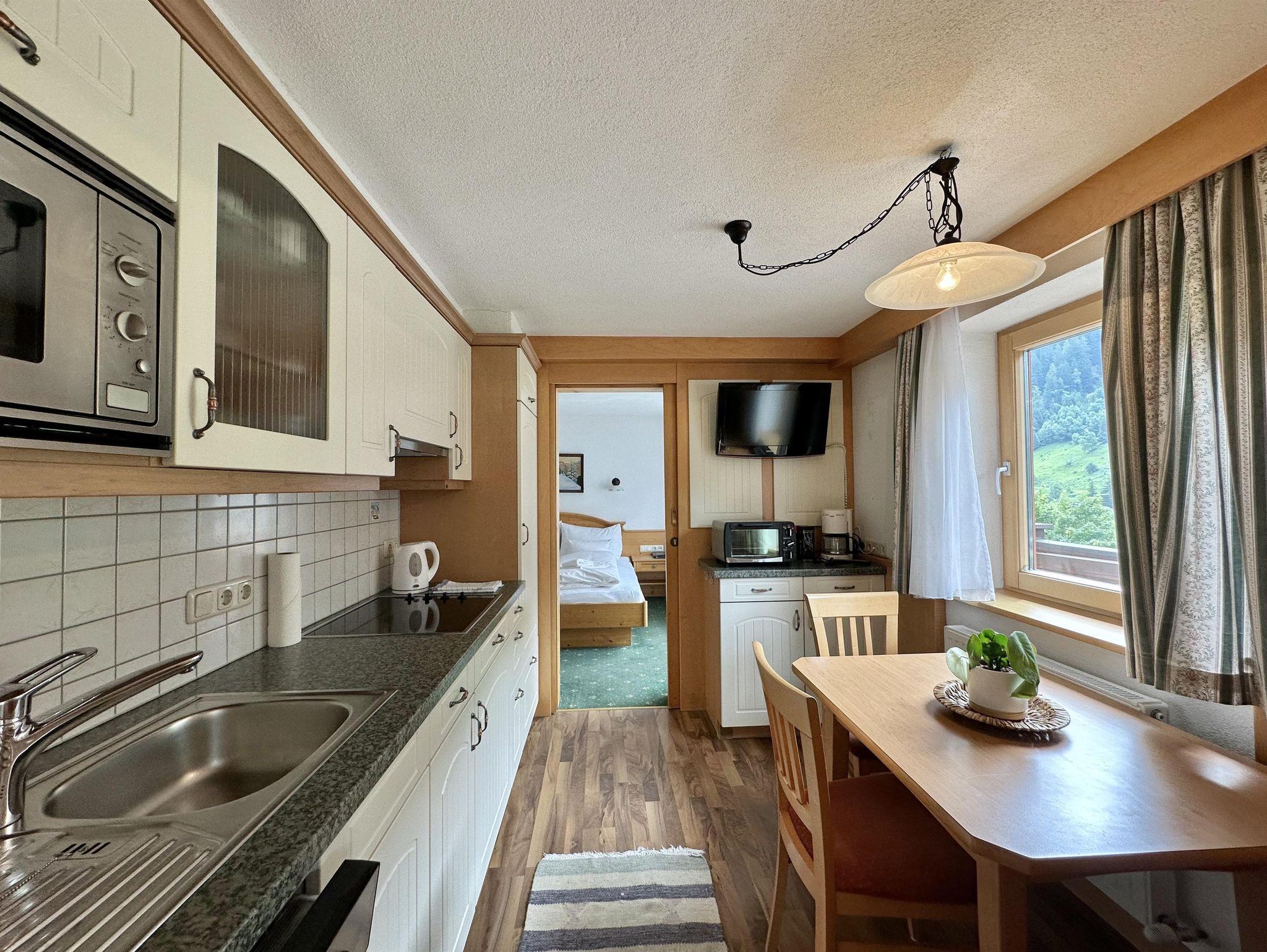 Ausgestattet mit 2 Doppelzimmern mit Doppelbett. Die komplett eingerichteten Wohnküche (Kaffeemaschine, Wasserkocher, Geschirrspülmaschine, Minibackofen, Mikro) mit Sitzgelegenheit für 4 Personen und je ein privates Bad mit einmal Badewanne/WC einmal DU/WC, HD - Flatscreen-TV, Radio, Telefon, Haartrockner und Südbalkon mit grandioser Aussicht auf die Bergwelt. Auch hier sehen Sie den Wintersportlern zu!